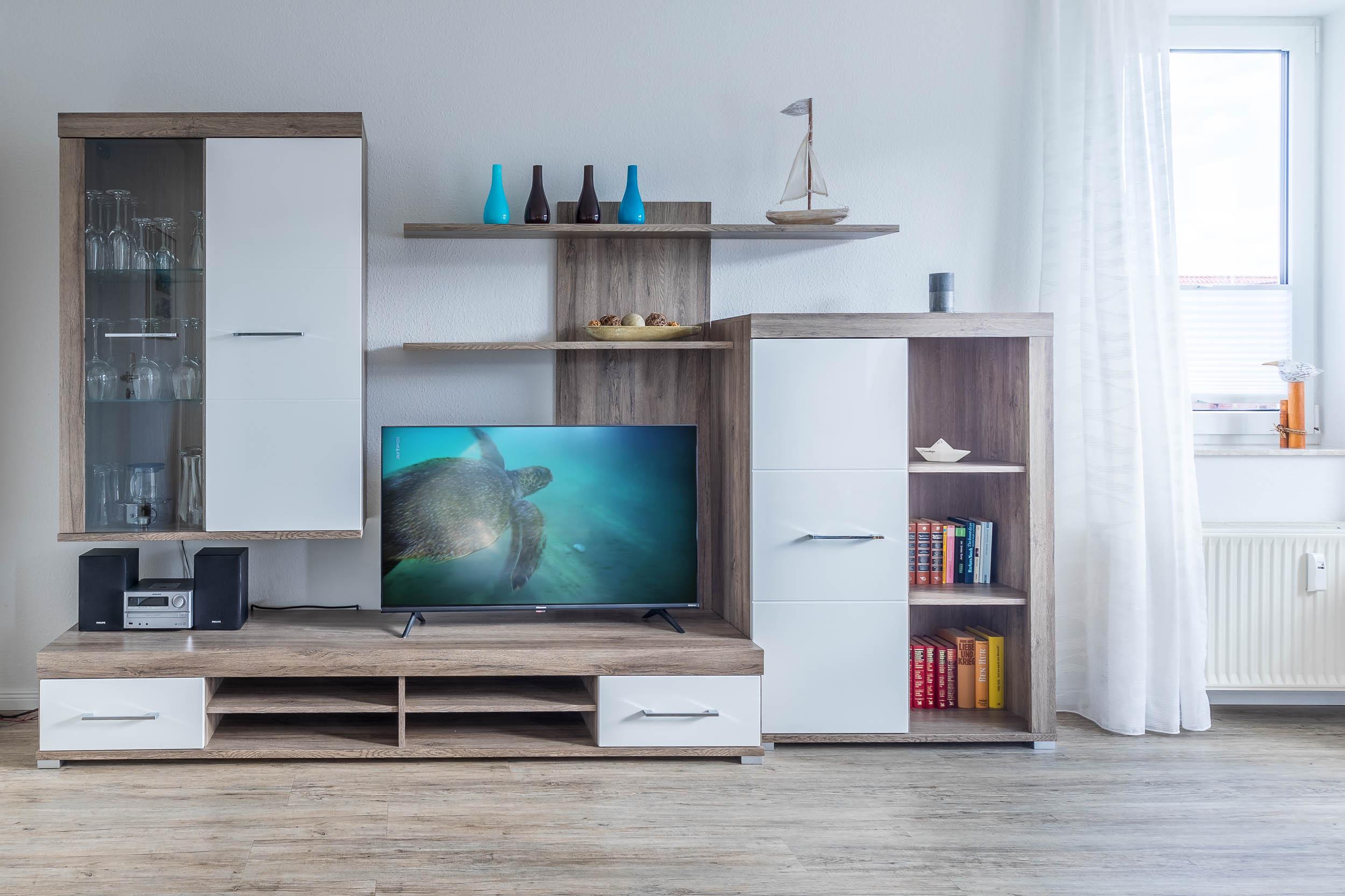 Das Wohnzimmer ist mit einem Ecksofa sowie einem passenden Sessel eingerichtet. Ein großer TV und die Stereoanlage sorgen hier für gute Multimediaunterhaltung. Die angrenzende Essecke bietet Platz für 4 Gäste.