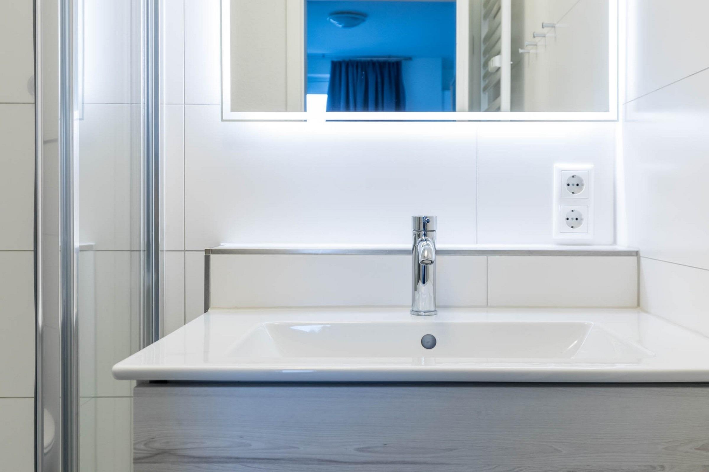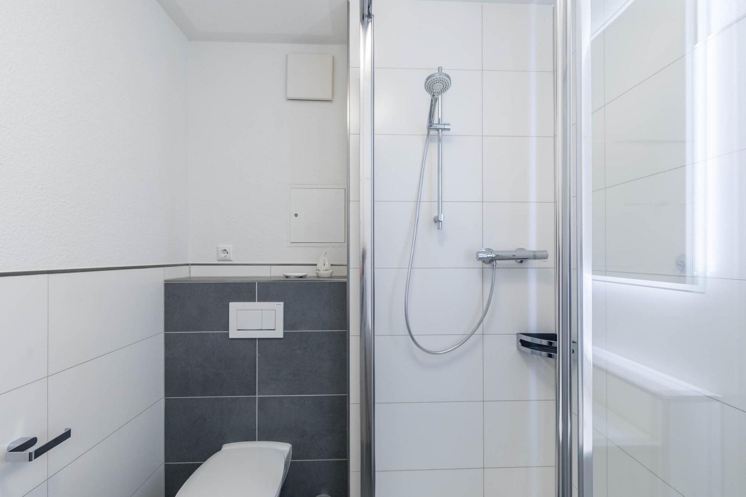 Im hell gefliesten Bad befinden sich eine Dusche, Waschbecken und WC.