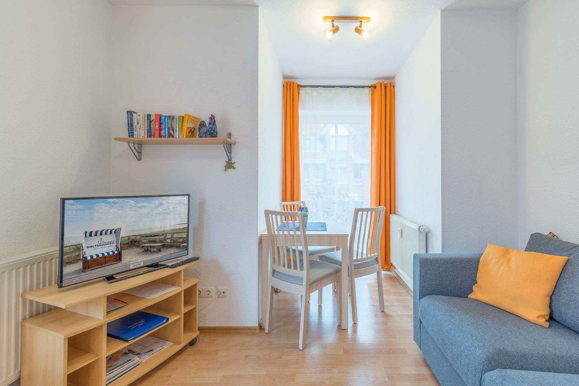 Die helle und freundliche Ferienwohnung im Backsteinhaus liegt im 1. Obergeschoß und befindet sich im Zentrum von Boltenhagen. Die geschmackvoll eingerichtete Wohnung bietet mit einem Wohnzimmer mit Schlafsofa (140 x 200cm), die als Doppelbett genutzt werden kann und einem separaten Schlafzimmer mit Doppelbett, optimalen Platz für 3 - 4 Personen. Außerdem verfügt sie über eine separate Küche mit Geschirrspülmaschine und Backofen sowie ein Badezimmer mit Badewanne. WLAN ist in der Wohnung vorhanden. Der Balkon ist in südwestlicher Richtung gelegen und lädt zum geniessen und entspannen ein. Hier kann man sich Abends vom Sonnenuntergang verzaubern lassen.