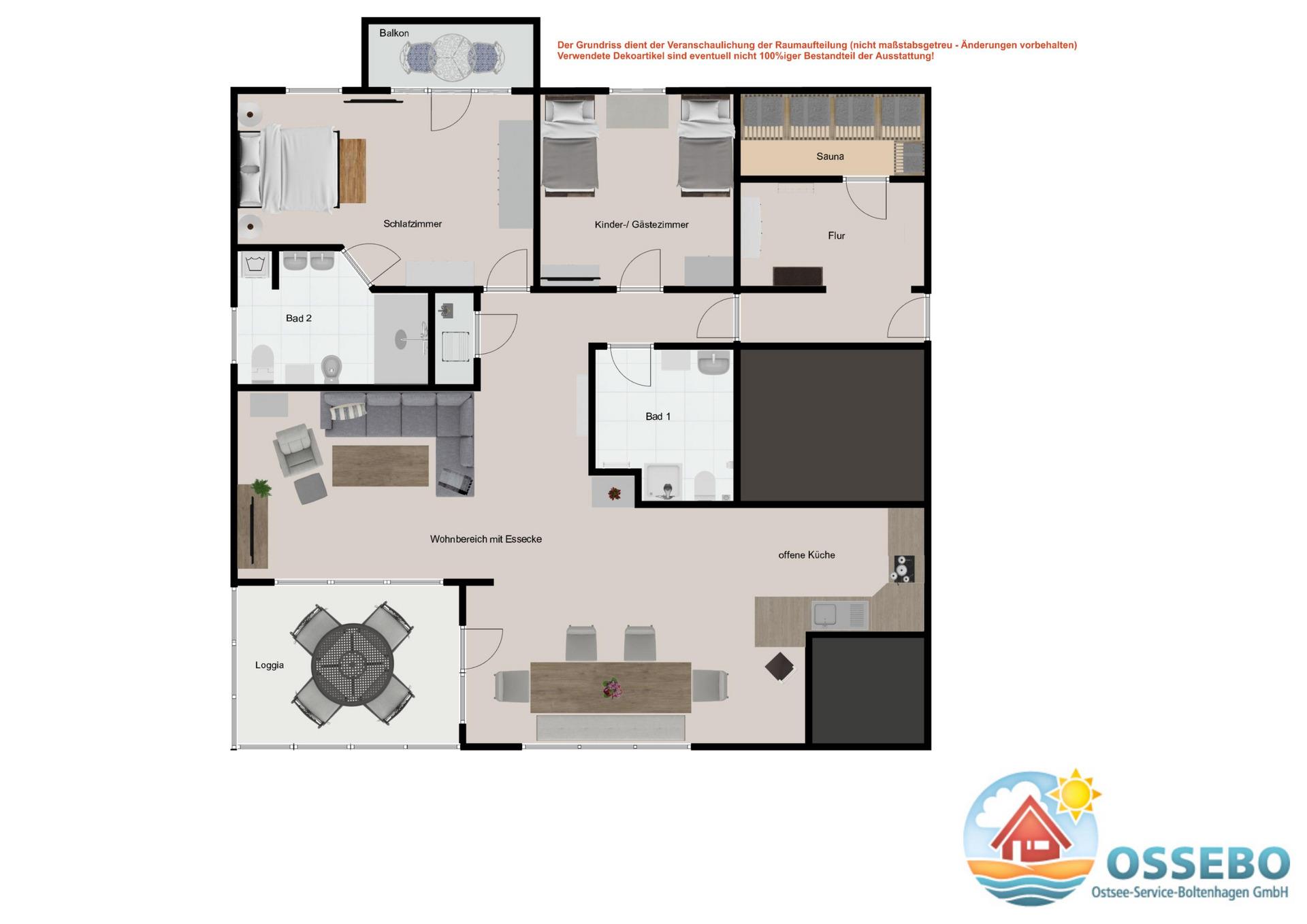 Von Frühjahr bis Herbst lädt die überdachte Loggia Richtung Ostsee mit Wärmestrahler und bequemer Bestuhlung dazu ein, die Abende im Freien zu verbringen und das Rauschen der Ostsee zu genießen. Für die kühlere Jahreszeit ist die geräumige finnische Sauna ein zusätzlicher Wohlfühl-Faktor.