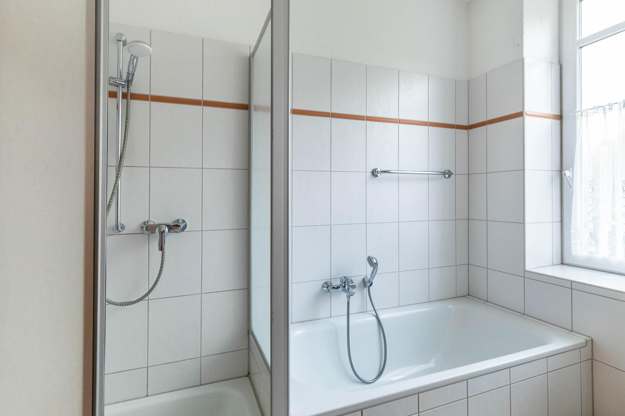 Das moderne, hell geflieste Badezimmer ist mit Dusche, Badewanne und WC ausgestattet. Das Fenster spendet zusätzliches Tageslicht und erleichtert das Lüften nach dem Baden oder Duschen.