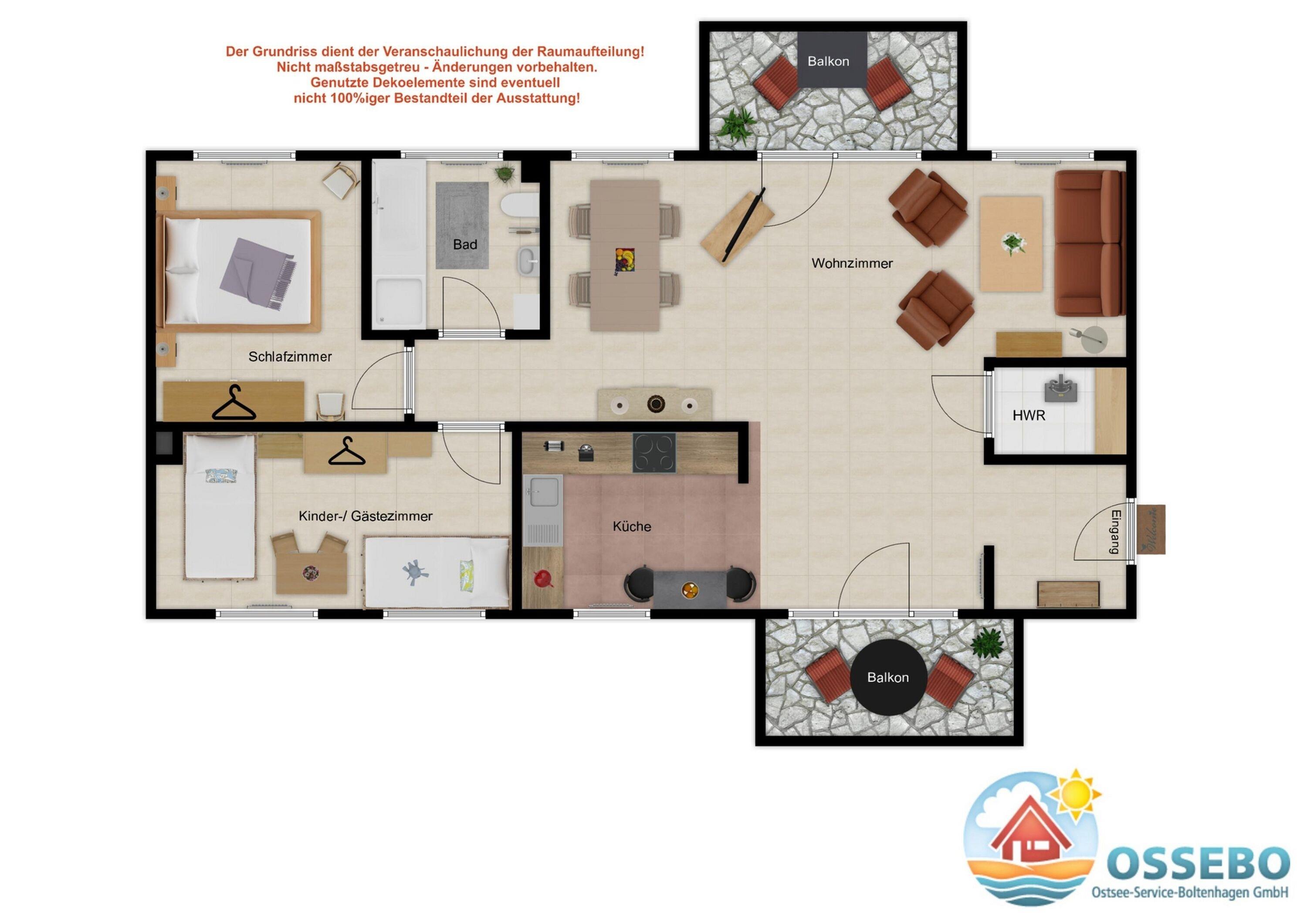 Zur strandnahen Wohnung gehören außerdem gleich zwei möblierte Balkone, die zu schönen Stunden im Freien einladen. Hier können Sie aufgrund der Ausrichtungen von Morgens (Ostbalkon) bis Abends (Westbalkon) die Sonne genießen.