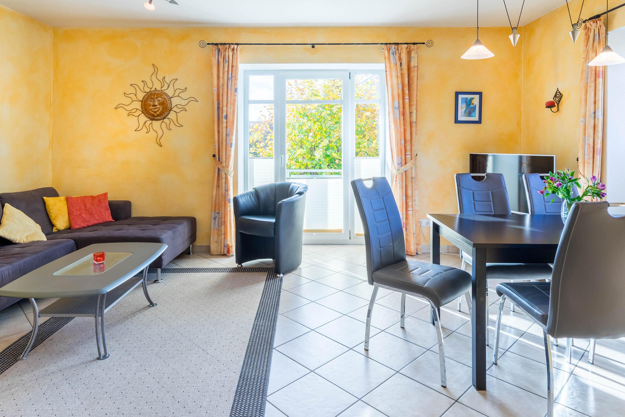 Der gemütlich eingerichtete Wohn- und Essbereich verfügt über Couchecke, modernem Flatscreen-TV (Sat) und einer separaten Essecke, wo Sie alle gemeinsam speisen können.