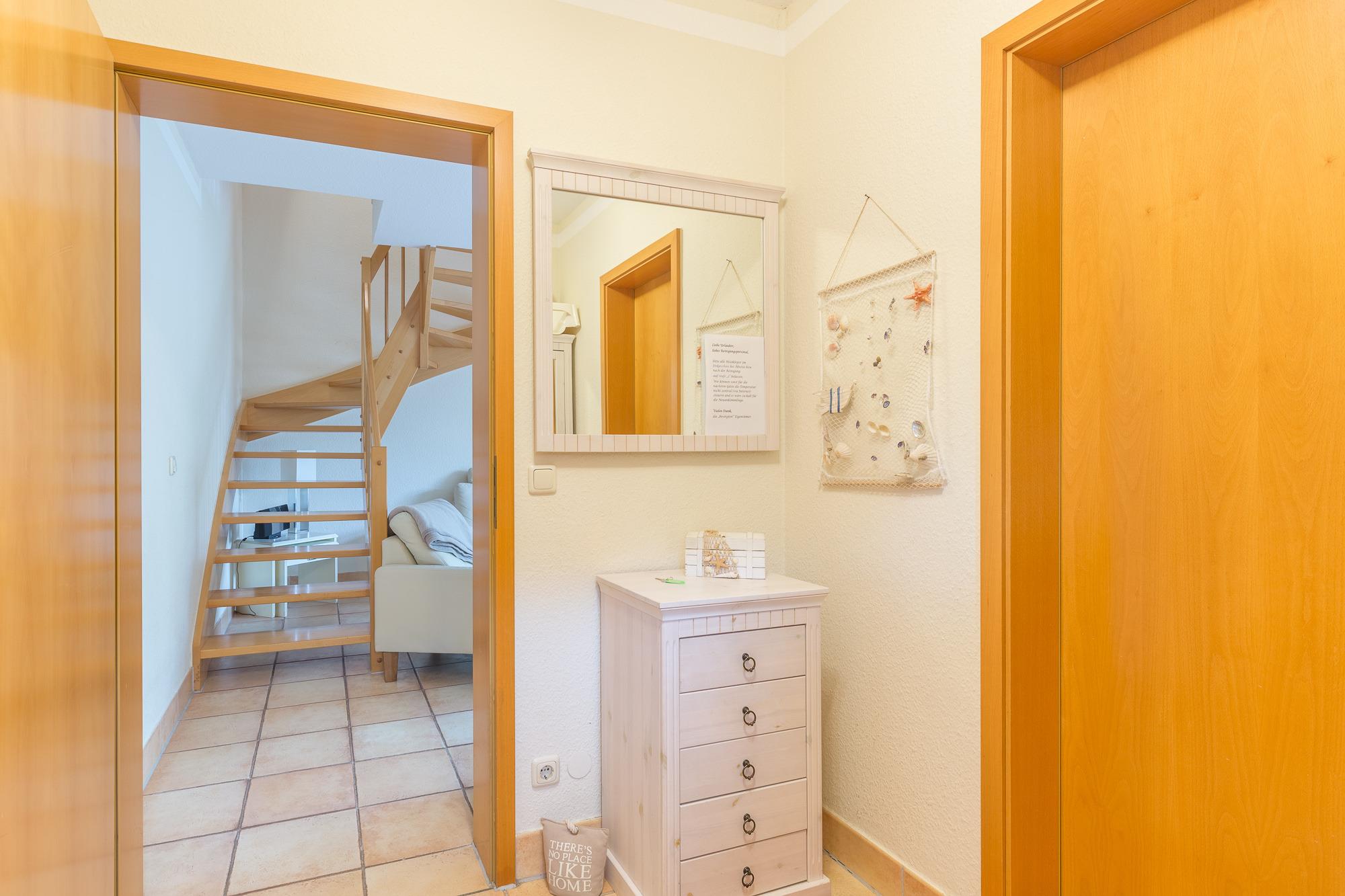 Sie betreten das Ferienhaus und befinden sich im Flur. Von hier aus erreichen Sie das Wohnzimmer. Vom Wohnbereich aus gelangen Sie in die offene Küche. Sie ist mit einem Geschirrspüler, einer Kaffeemaschine und allem, was für die Zubereitung Ihrer Mahlzeiten benötigen, ausgestattet.