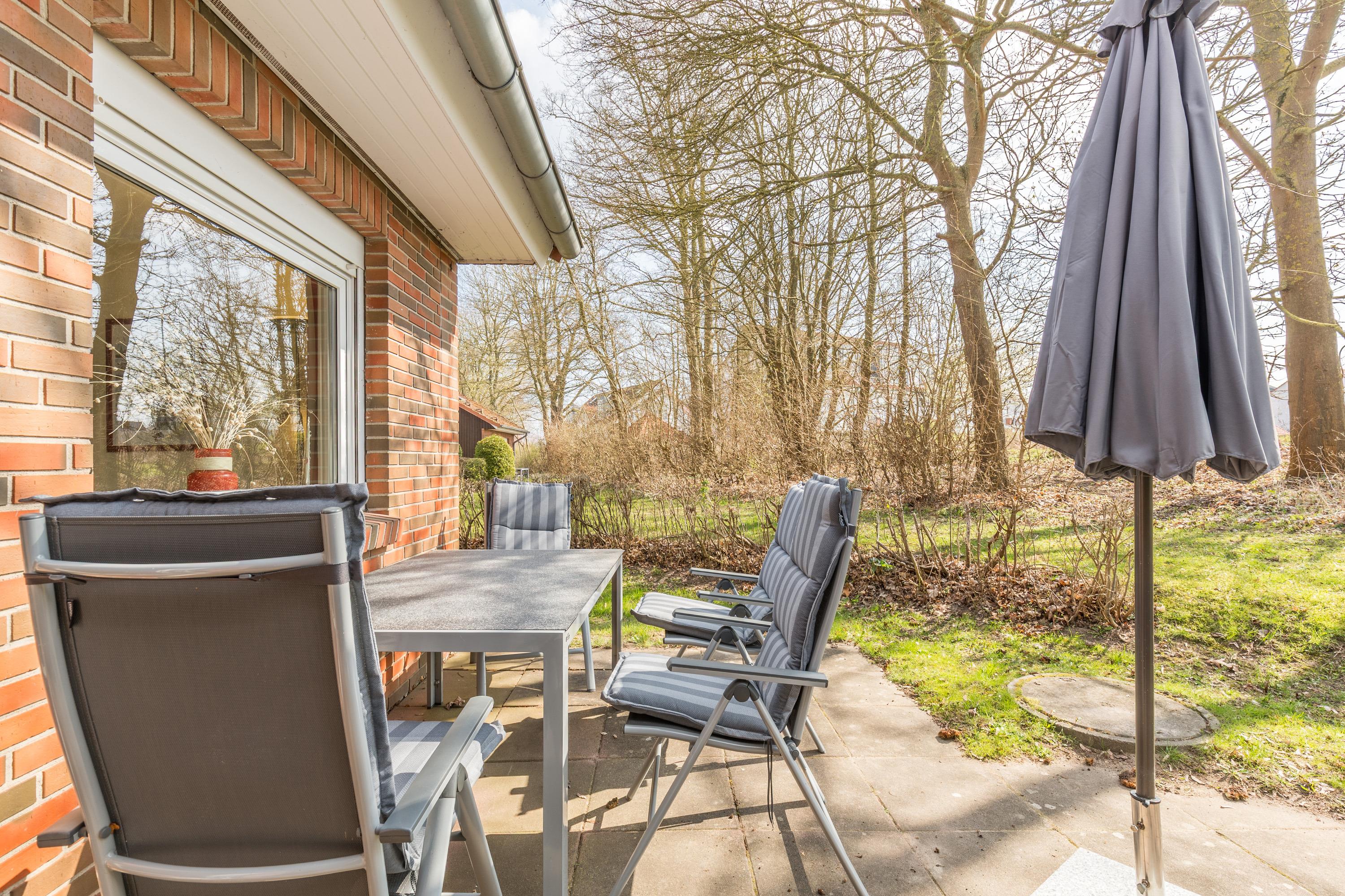 Vom Wohnzimmer aus gelangt man auf die Terrasse. Hier haben Sie einen wunderbaren Ausblick auf das Feld.