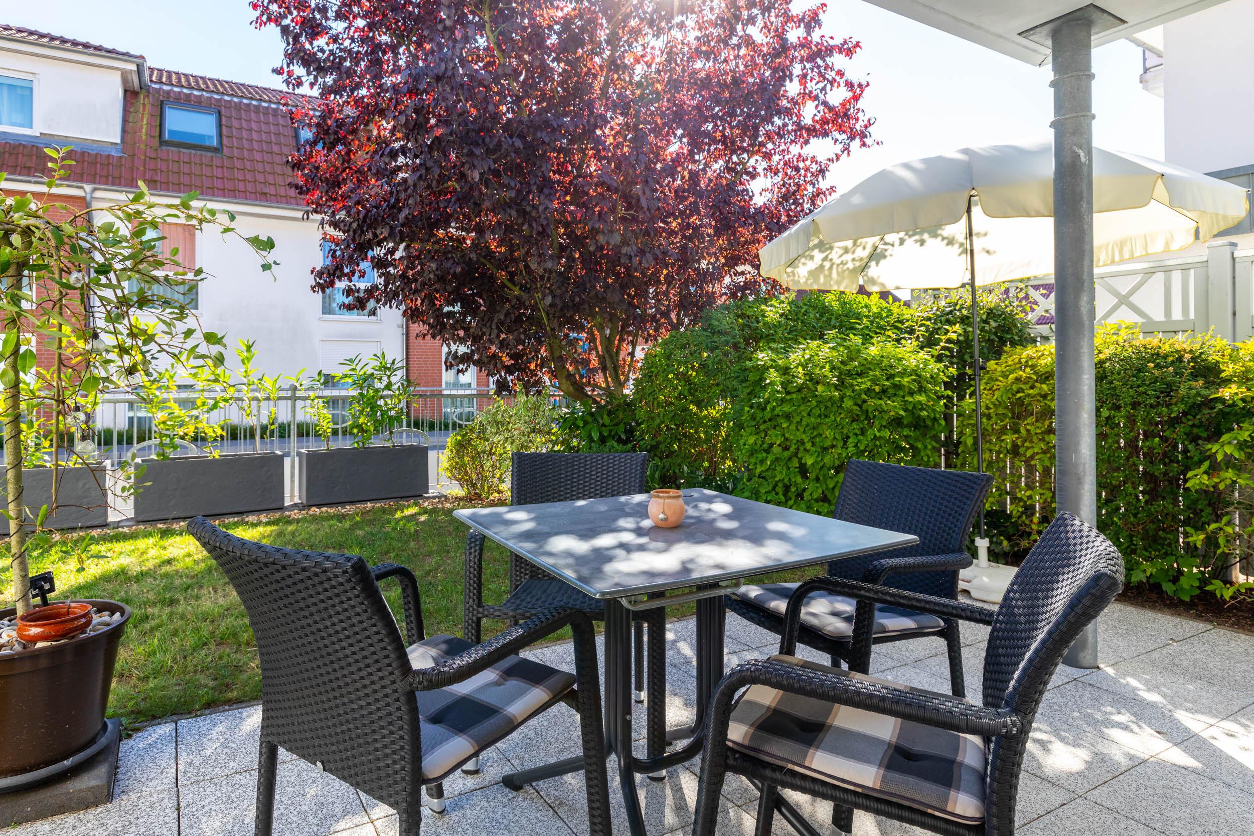 Vom Wohnzimmer aus gelangen Sie direkt auf die möblierte, teilweise sichtgeschützte Eckterrasse in Nordost-Südwest-Ausrichtung.