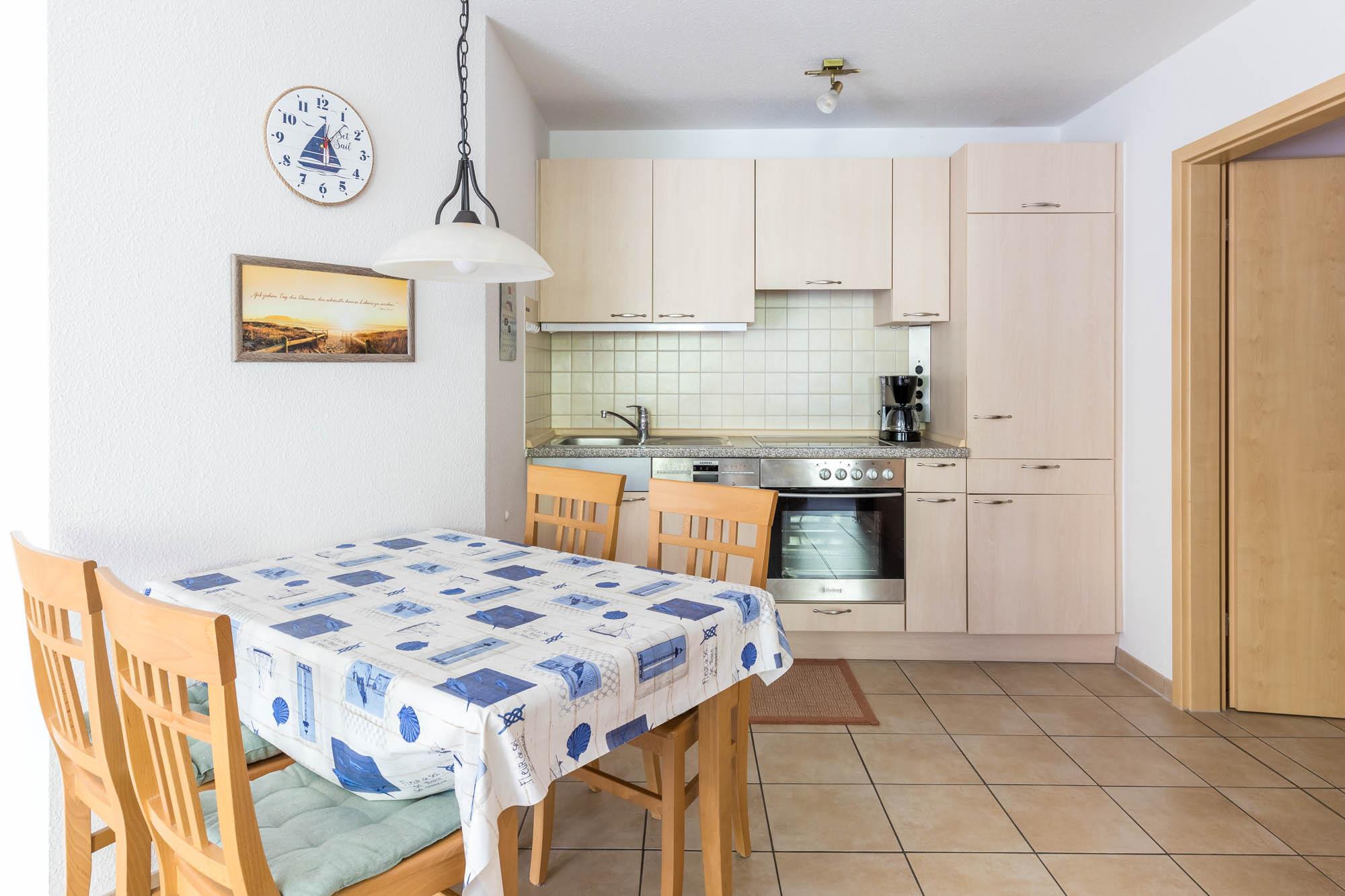 Der angrenzende, offene Küchenbereich bietet eine sehr gute Ausstattung für Ihre Selbstverpflegung. Geschirrspüler und Backofen mit Ceranherd stehen ebenso bereit wie z.B. ein Kühlschrank mit Gefrierfach, Mikrowelle, elektrische Kleingeräte uvm. Die separate Essecke lädt zum gemeinsamen Speisen oder Spieleabenden ein.
