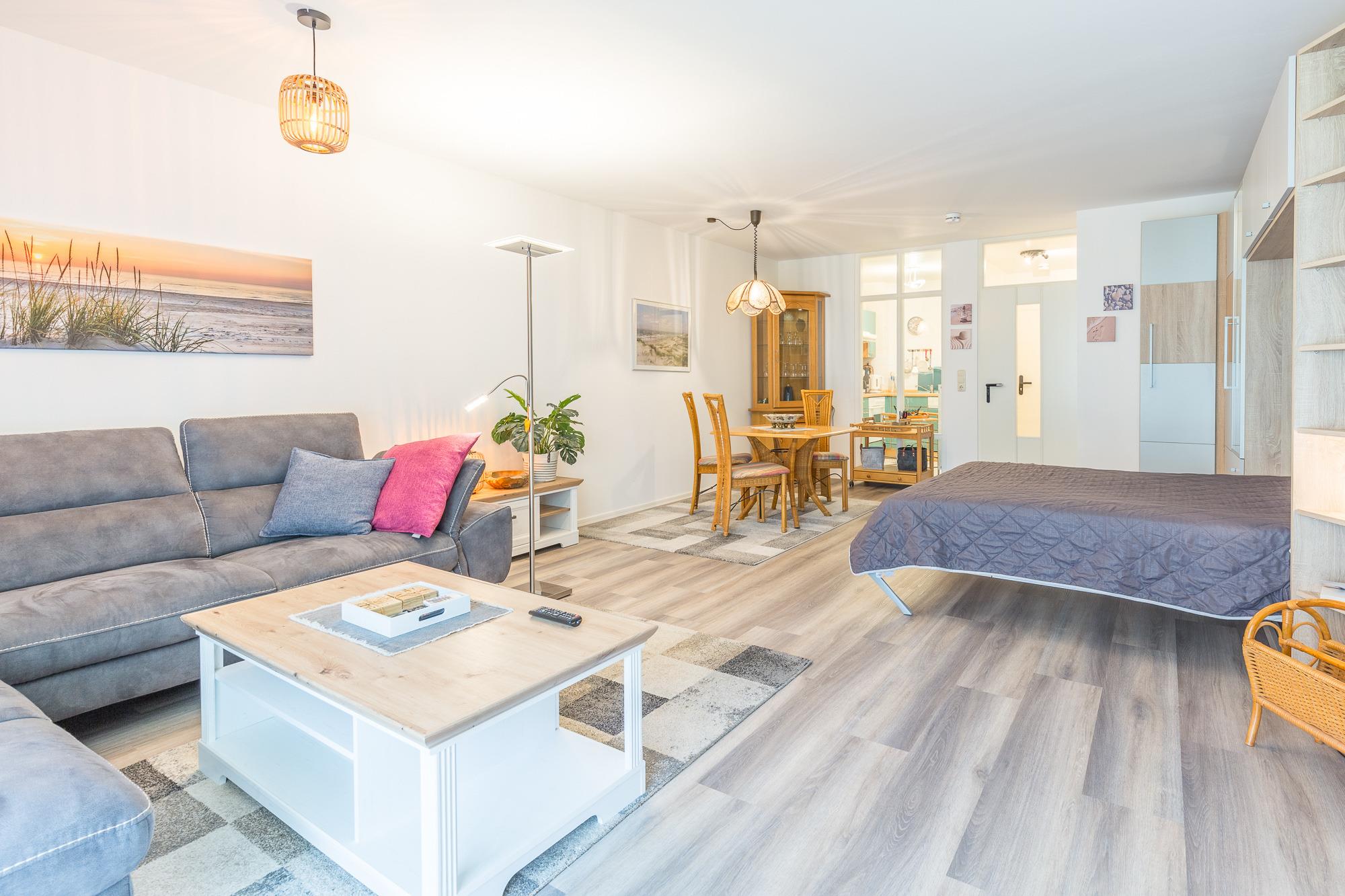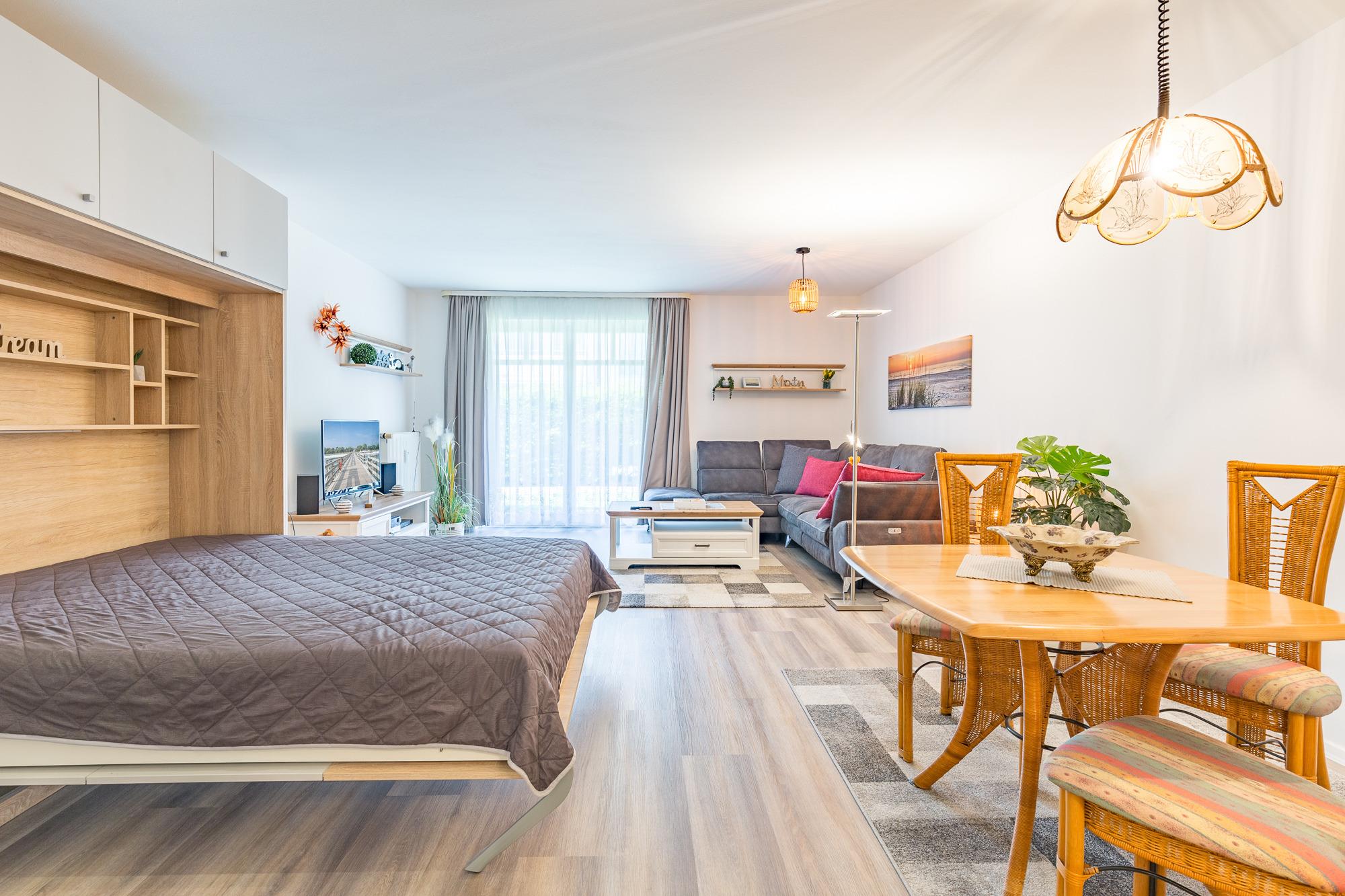 Die separate voll ausgestattete Küche ist durch ein Glaselement vom Wohn- und Schlafbereich getrennt. Das Wohnzimmer besitzt zusätzlich eine gemütliche Sofaecke zum Entspannen, sowie einen Esstisch mit 4 Stühlen. Im Wirtschaftsraum der Ferienwohnung finden Sie einen Staubsauger sowie weitere Haushaltsutensilien.