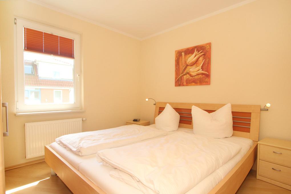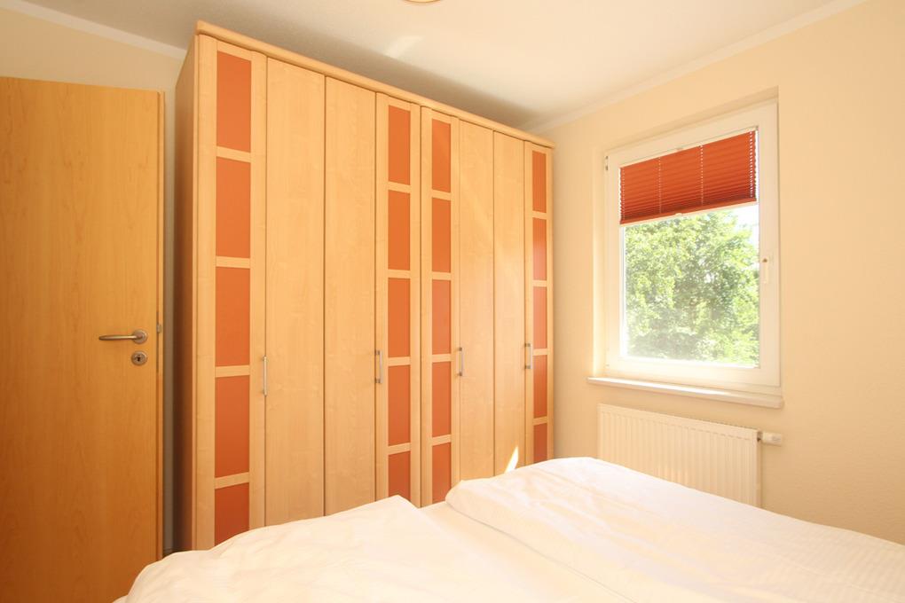 Das Schlafzimmer bietet ein bequemes Doppelbett (180x200cm/ Höhe 44,5cm) mit elektrisch verstellbaren Lattenrosten und einen geräumigen Kleiderschrank. Am Fenster befindet sich ein Verdunklungs-Plissee sowie Fliegenschutz.