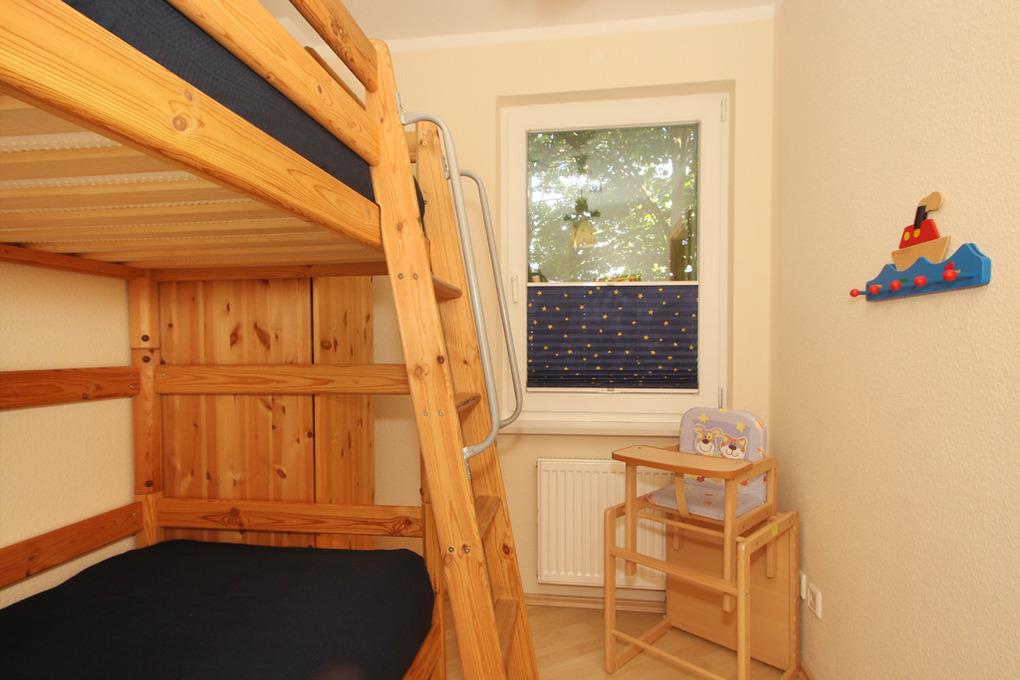 Das Gäste-/ Kinderzimmer verfügt über ein Etagenbett (je 90x 190cm/ Höhe Bett unten 41cm, Bett oben 152cm). Im kleinen Kleiderschrank kann die Urlaubsgarderobe abgelegt werden. Am Fenster befindet sich ein Verdunklungs-Plissee sowie Fliegenschutz.