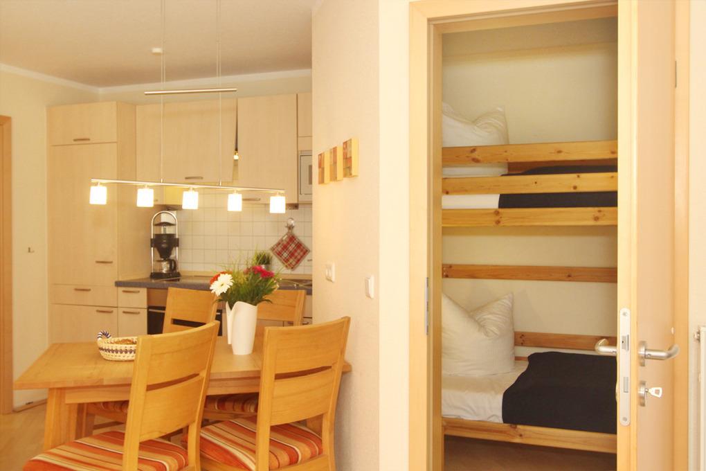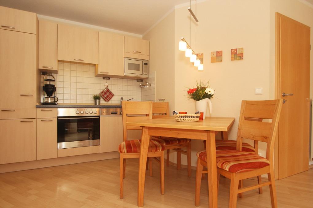 In der offenen Küche stehen für Ihre Selbstverpflegung u.a. ein Kühlschrank mit Gefrierfach, Backofen, Herd mit Ceranfeld, Geschirrspüler, Mikrowelle uvm. zur Verfügung. An der separaten Essecke können Sie gemeinsam speisen.