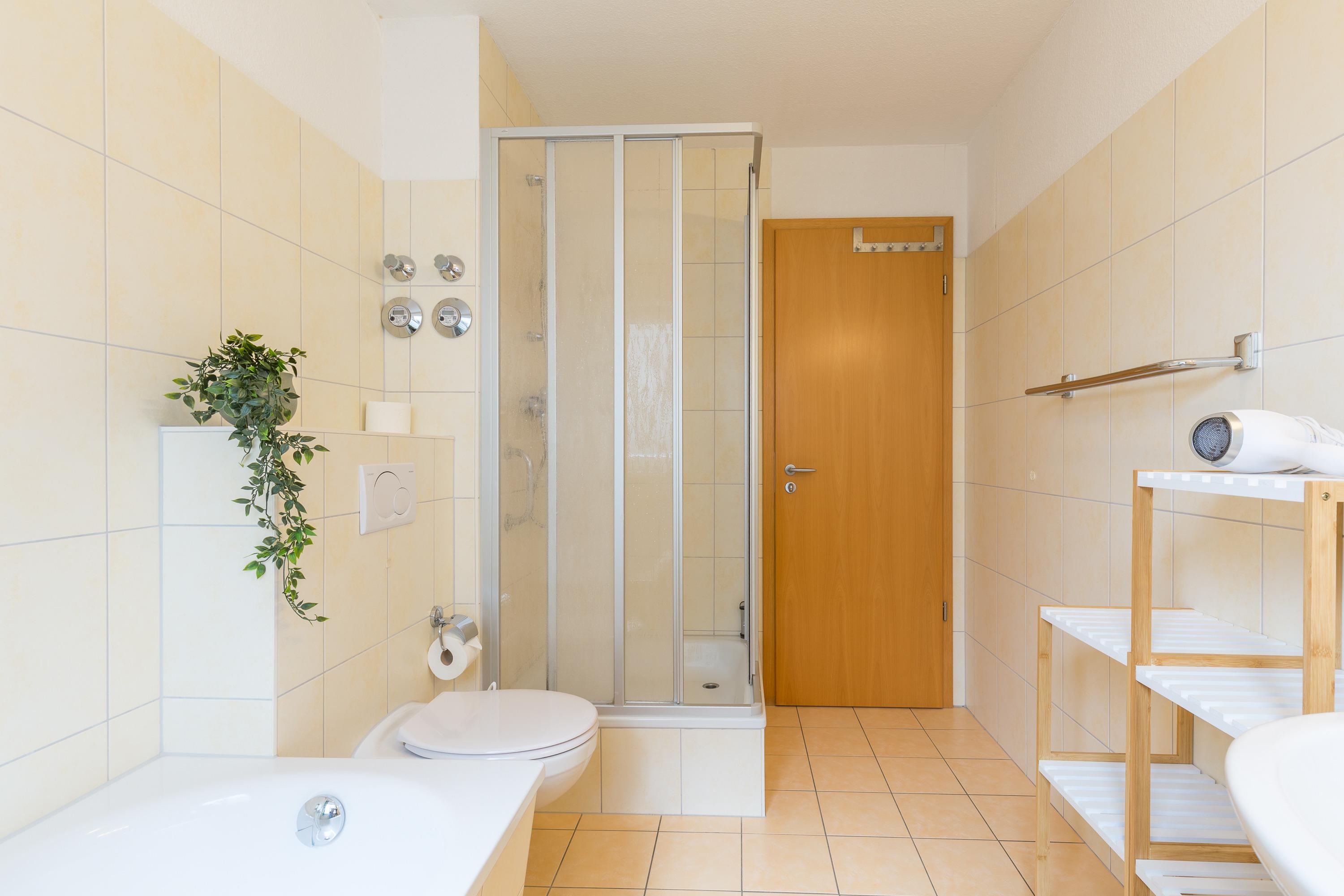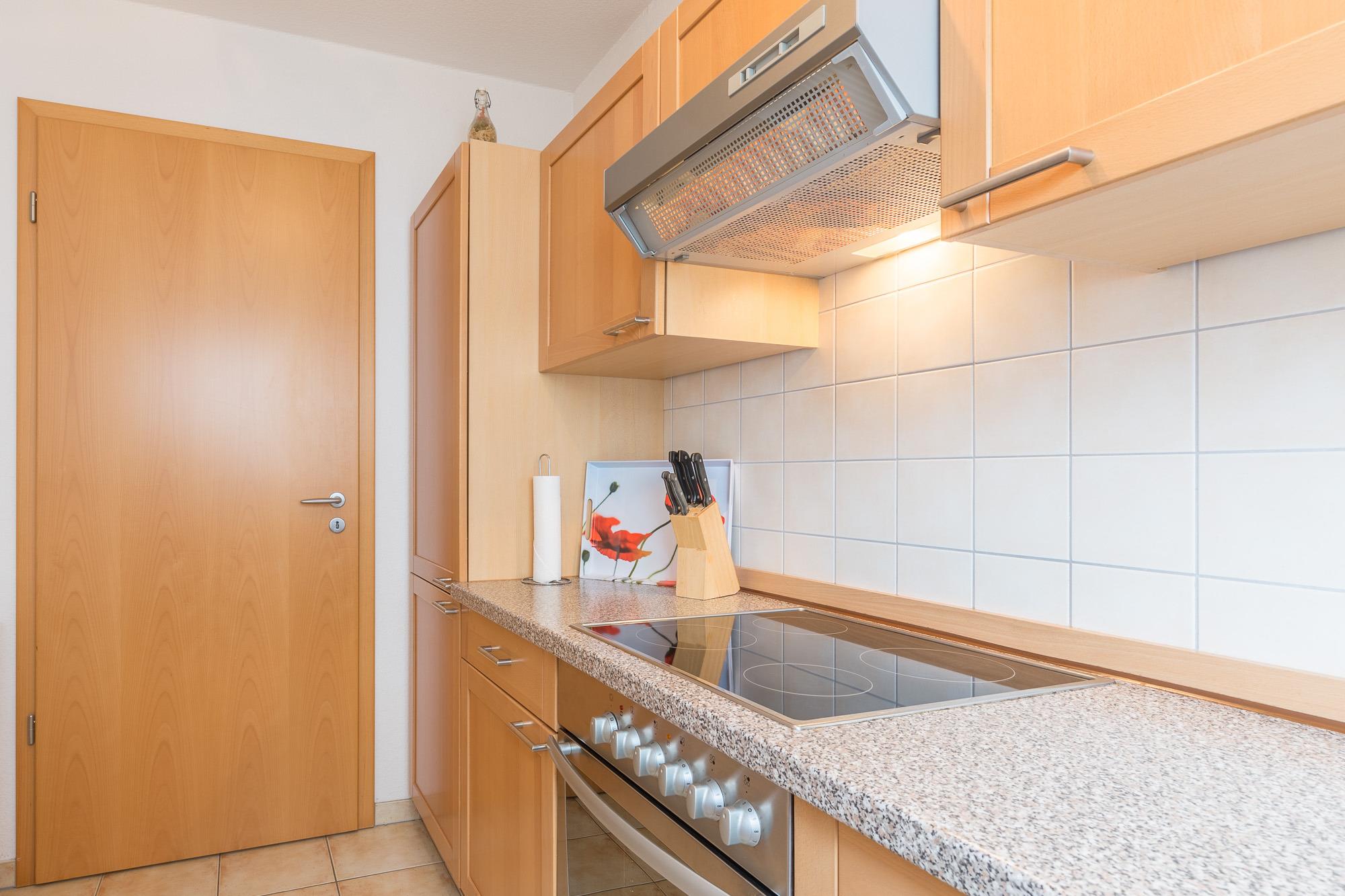 Außerdem verfügt Sie über eine separate, komplett ausgestattete Küche mit Geschirrspülmaschine sowie ein komfortables Badezimmer mit Badewanne und Dusche. Eine Waschmaschine ist ebenfalls vorhanden und kann kostenlos von Ihnen genutzt werden. Der große Balkon ist zur Südseite gelegen.