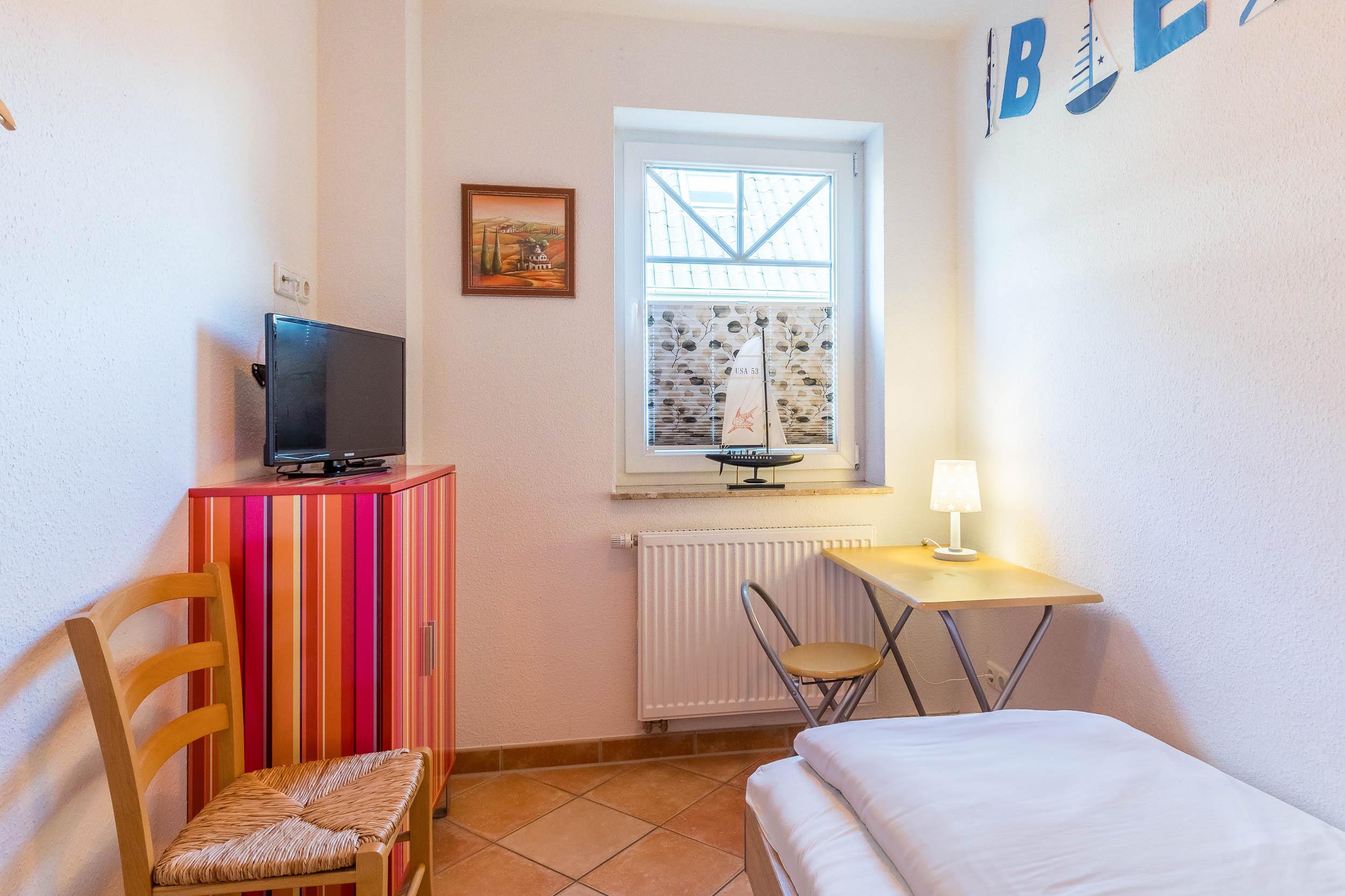 Das Schlafzimmer ist mit einem Doppelbett (160x200cm/ Höhe 52cm), Nachtschränkchen und einem Kleiderschrank ausgestattet. Das Gästezimmer bietet ein gemütliches Einzelbett (90x200cm/ Höhe 45cm) und einen eigenen Fernseher auf der Kommode.
