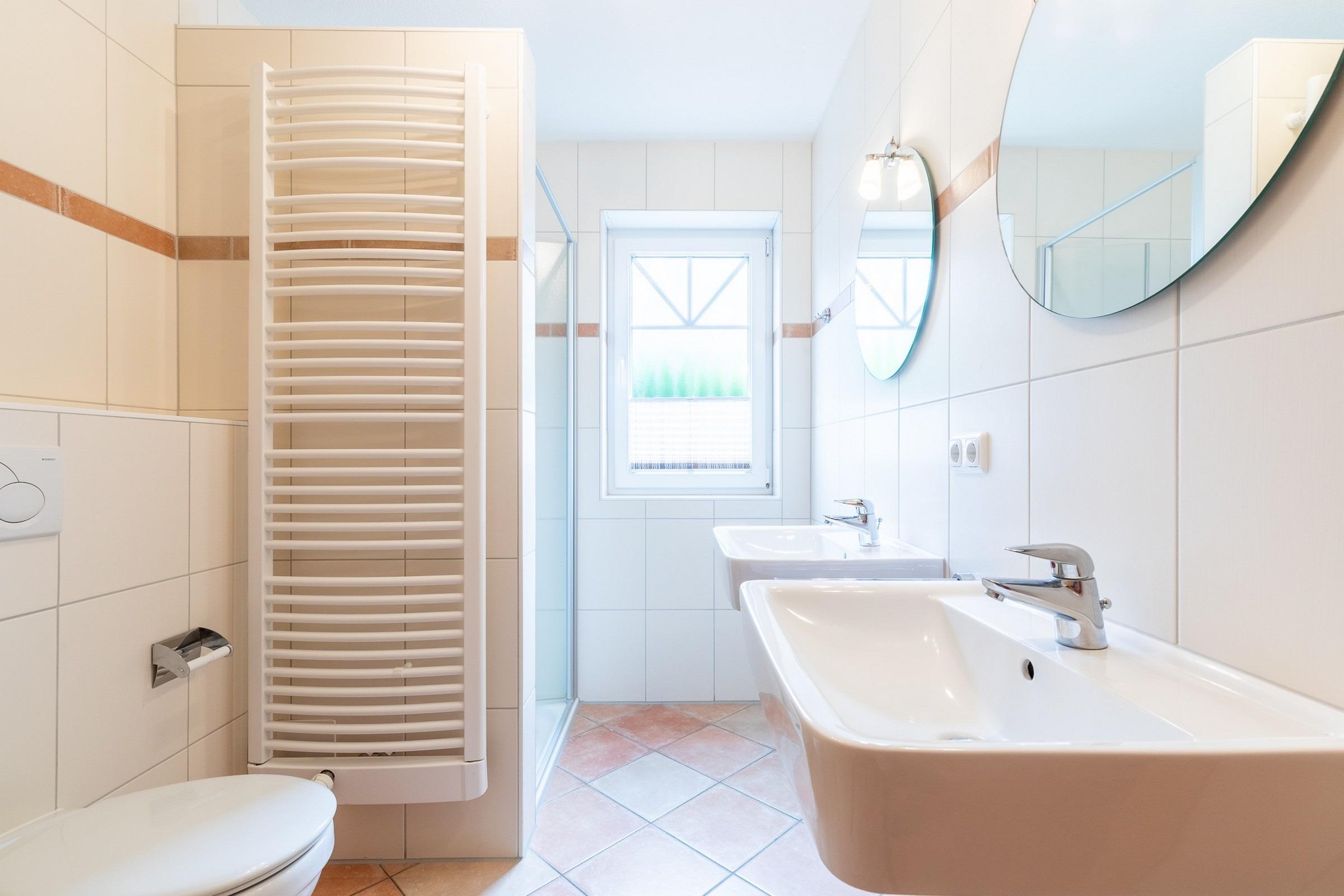 Im modernen Bad mit Fenster finden Sie eine Dusche, zwei Waschbecken, WC und Fußbodenheizung.