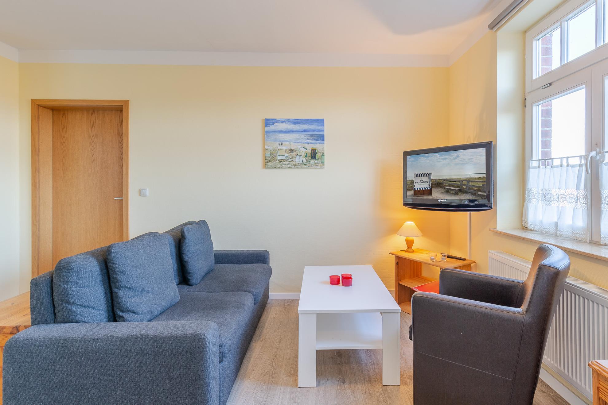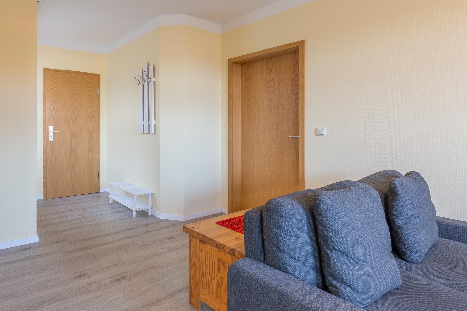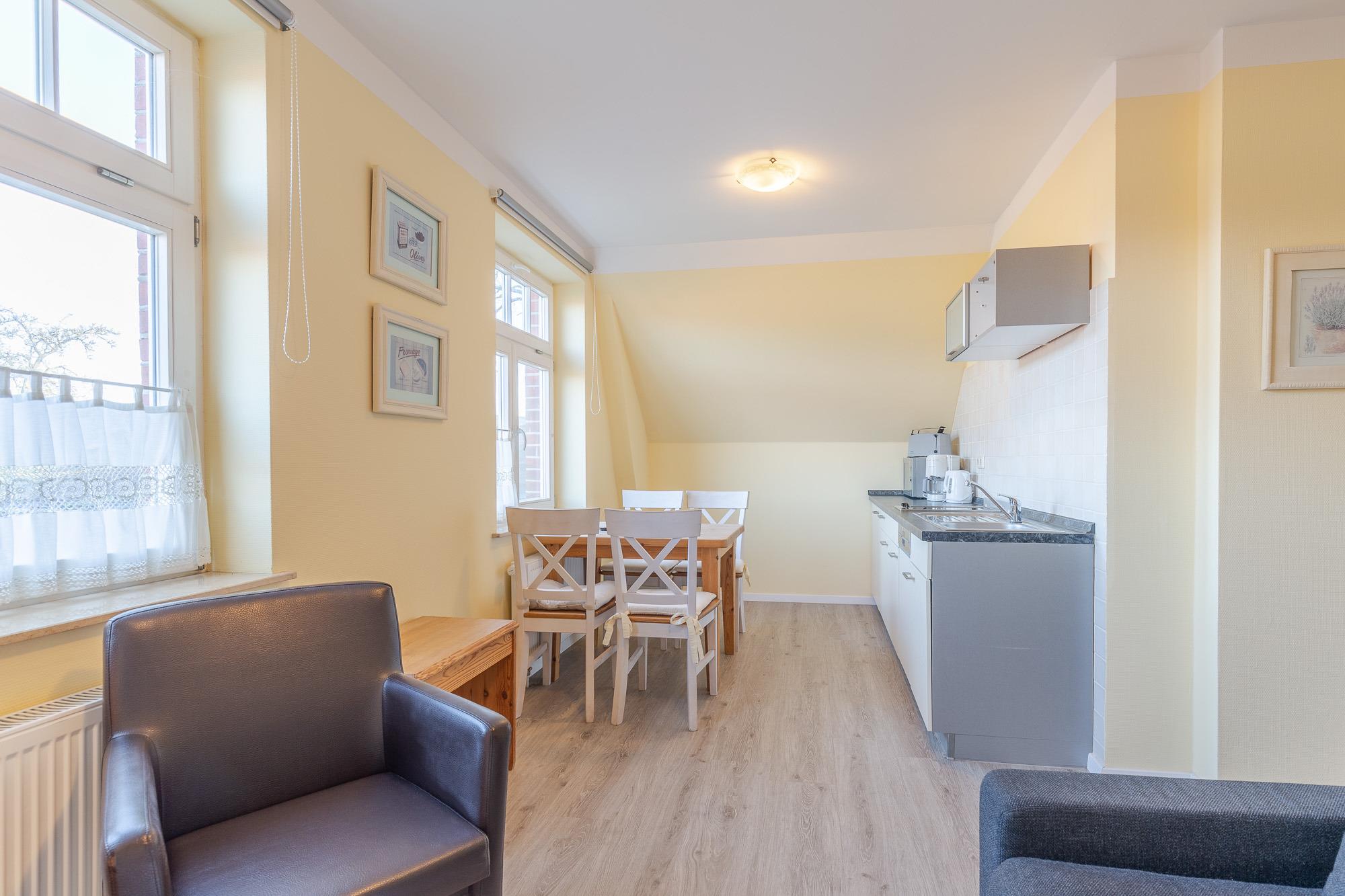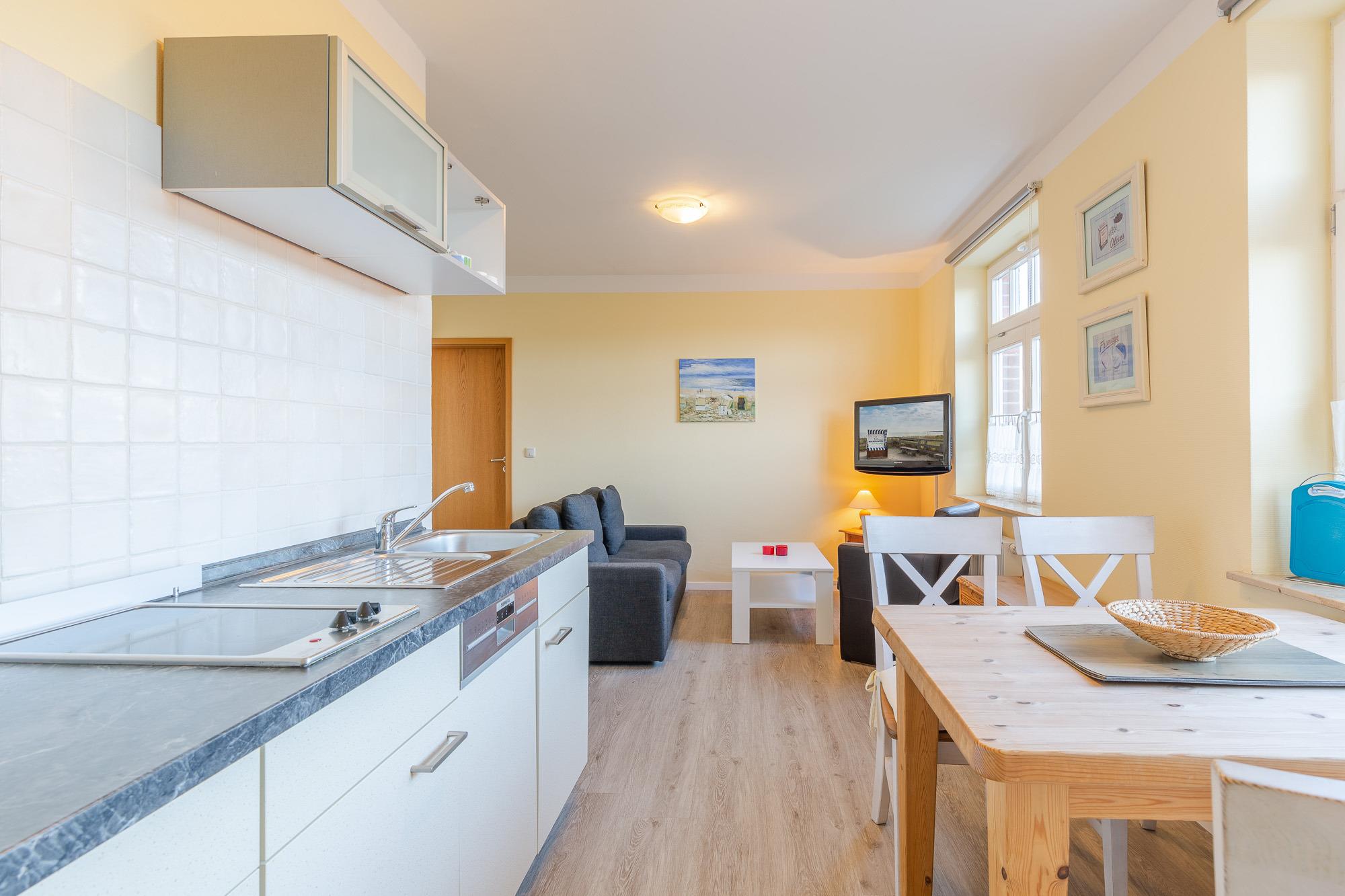 Die Ferienwohnung 05 im 1. Obergeschoss bietet mit einem Wohnzimmer mit Schlafcouch und einem separaten Schlafzimmer Platz für bis zu 4 Personen. Sie verfügt über einen großen Flachbild-TV, eine komplette Küchenzeile im Wohnbereich mit Geschirrspülmaschine, 2 Platten-Herd, Mikrowelle und Kühlschrank, sowie ein Badezimmer mit Dusche und WC.