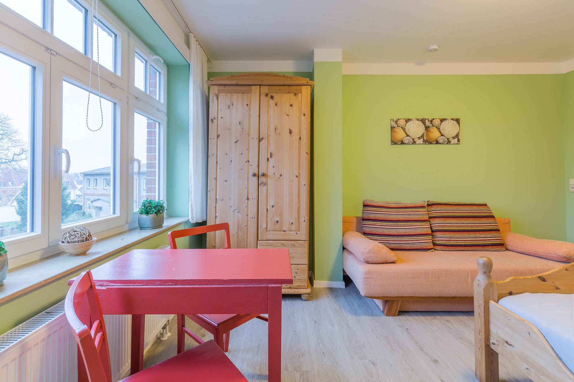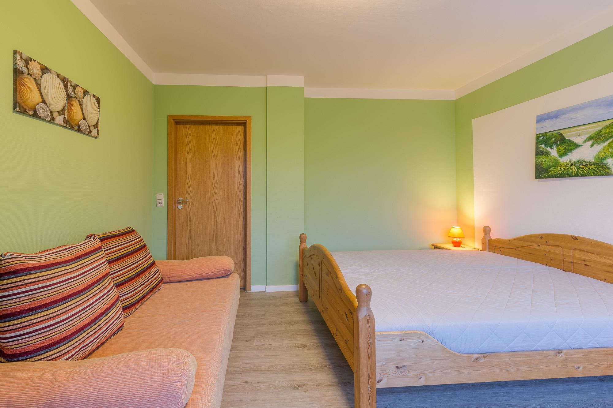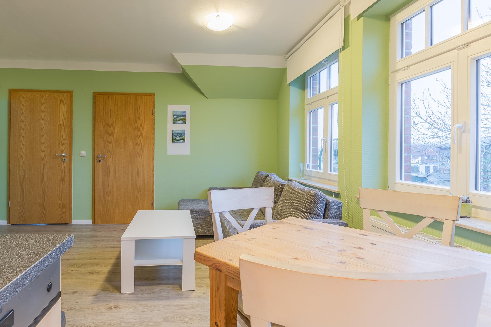 Die Wohnung 06 im 1. Obergeschoss bietet mit einem Wohnzimmer und zwei separaten Schlafzimmern Platz für 4 Personen. Sie verfügt über einen großen Flachbild-TV, eine komplette Küchenzeile im Wohnzimmer mit Geschirrspülmaschine, Backofen, 4-Platten-Herd, Mikrowelle und Kühlschrank sowie ein Badezimmer mit Dusche und WC.