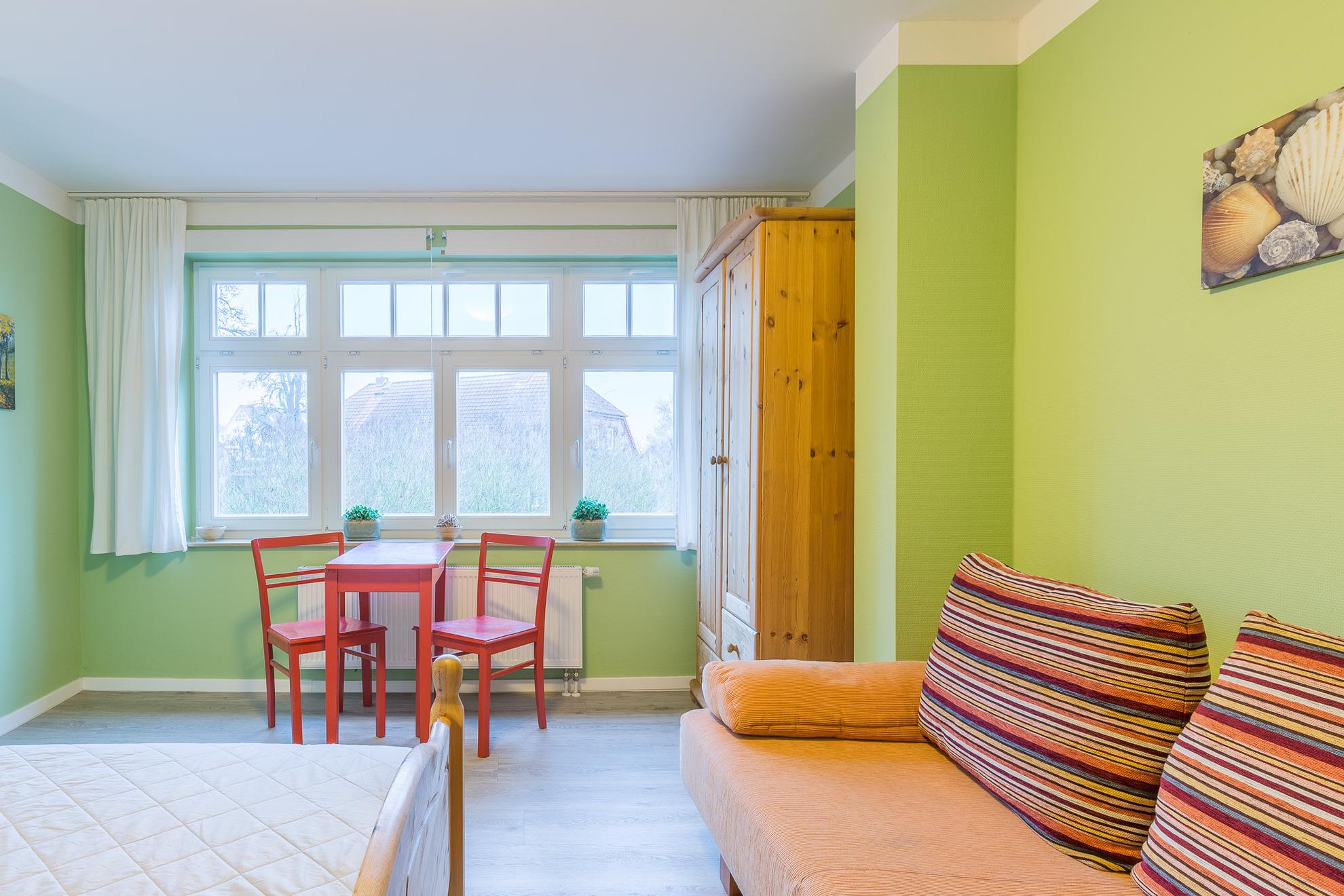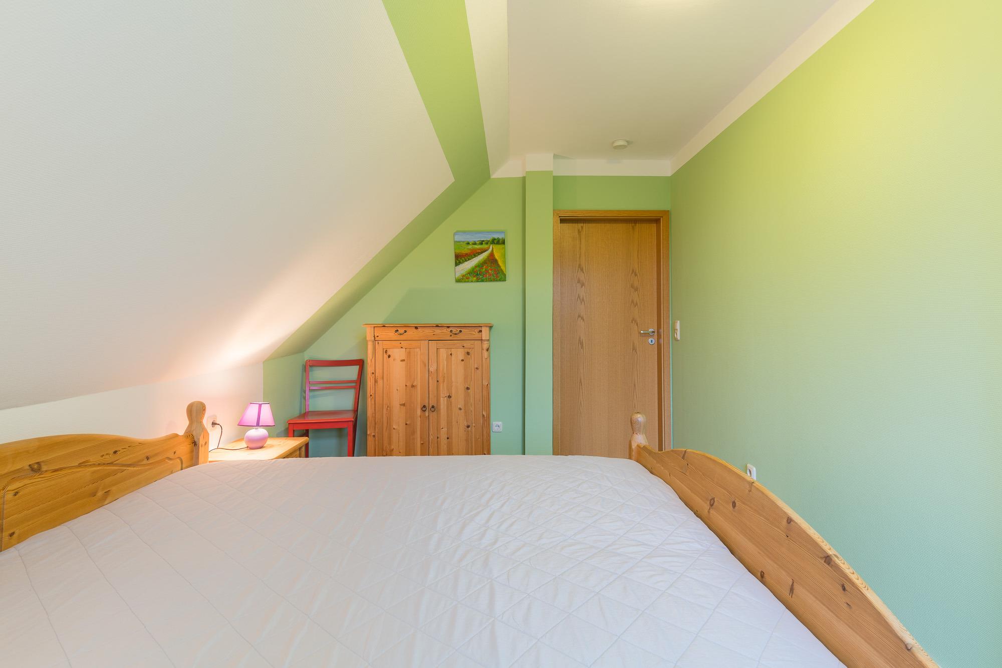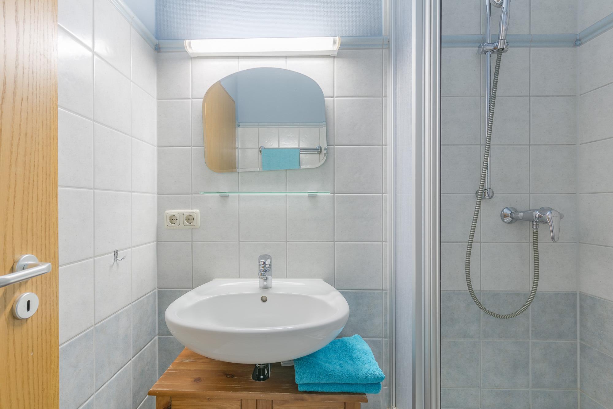 Die Wohnung 06 im 1. Obergeschoss bietet mit einem Wohnzimmer und zwei separaten Schlafzimmern Platz für 4 Personen. Sie verfügt über einen großen Flachbild-TV, eine komplette Küchenzeile im Wohnzimmer mit Geschirrspülmaschine, Backofen, 4-Platten-Herd, Mikrowelle und Kühlschrank sowie ein Badezimmer mit Dusche und WC.