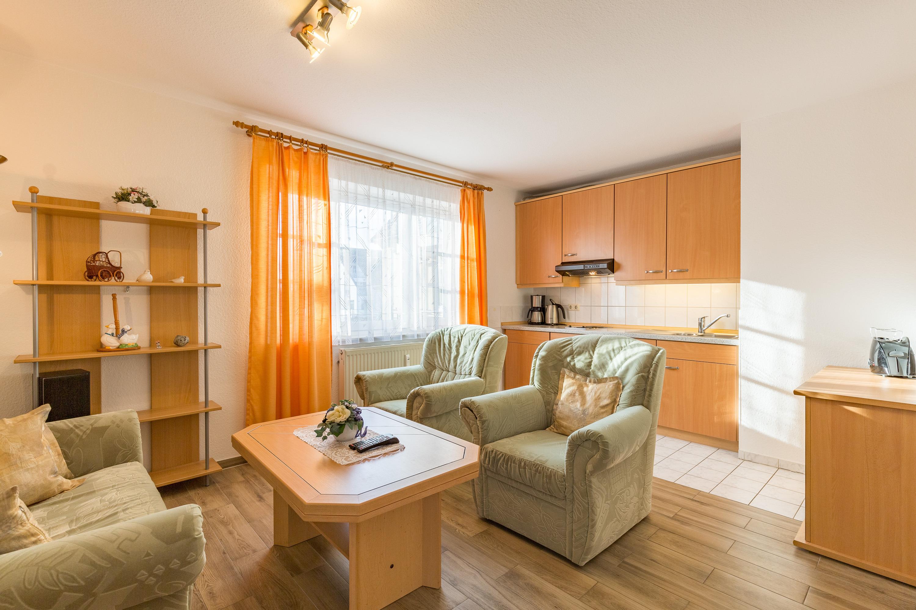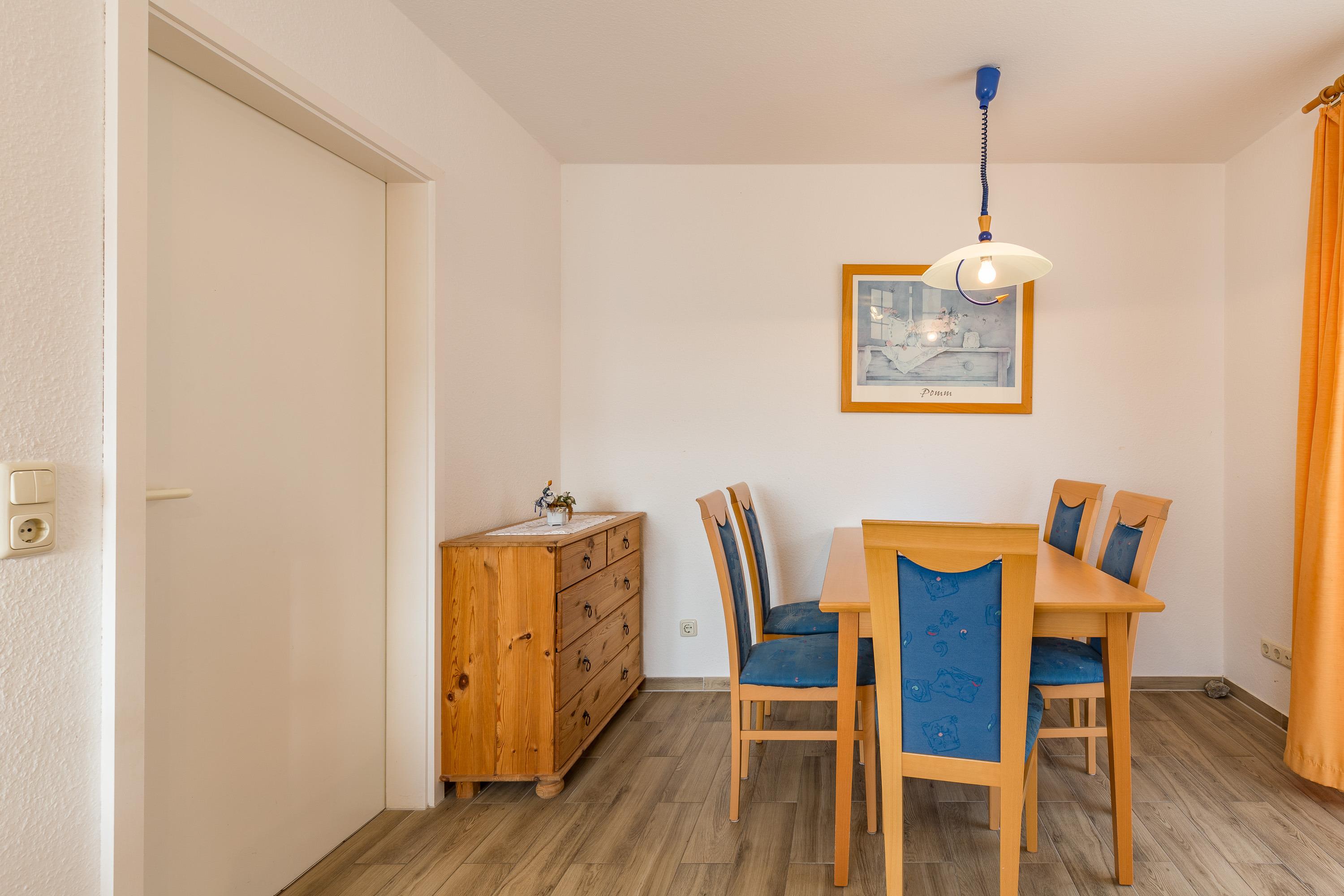 In der Küchenzeile im Wohnzimmer finden Sie eine Einbaumikrowelle, ein Kochfeld mit 2 Platten und einen kleinen Kühlschrank mit Gefrierfach. Im Schlafzimmer steht ein geräumiger Kleiderschrank für Ihre Urlaubsgarderobe. Das Doppelbett hat 2 einzelne Matratzen (Liegefläche 180x200 cm). Im kleinen Schlafzimmer stehen 2 Einzelbetten ( Liegeflächen: 90x200 cm und 90x180 cm) . Auf dem Balkon ( Westseite) stehen Balkonmöbel für Sie bereit. Ihr Auto stellen Sie sicher auf dem Außenstellplatz in der Nähe des Hauses ab. Haustiere sind in dieser Wohnung nicht erlaubt.