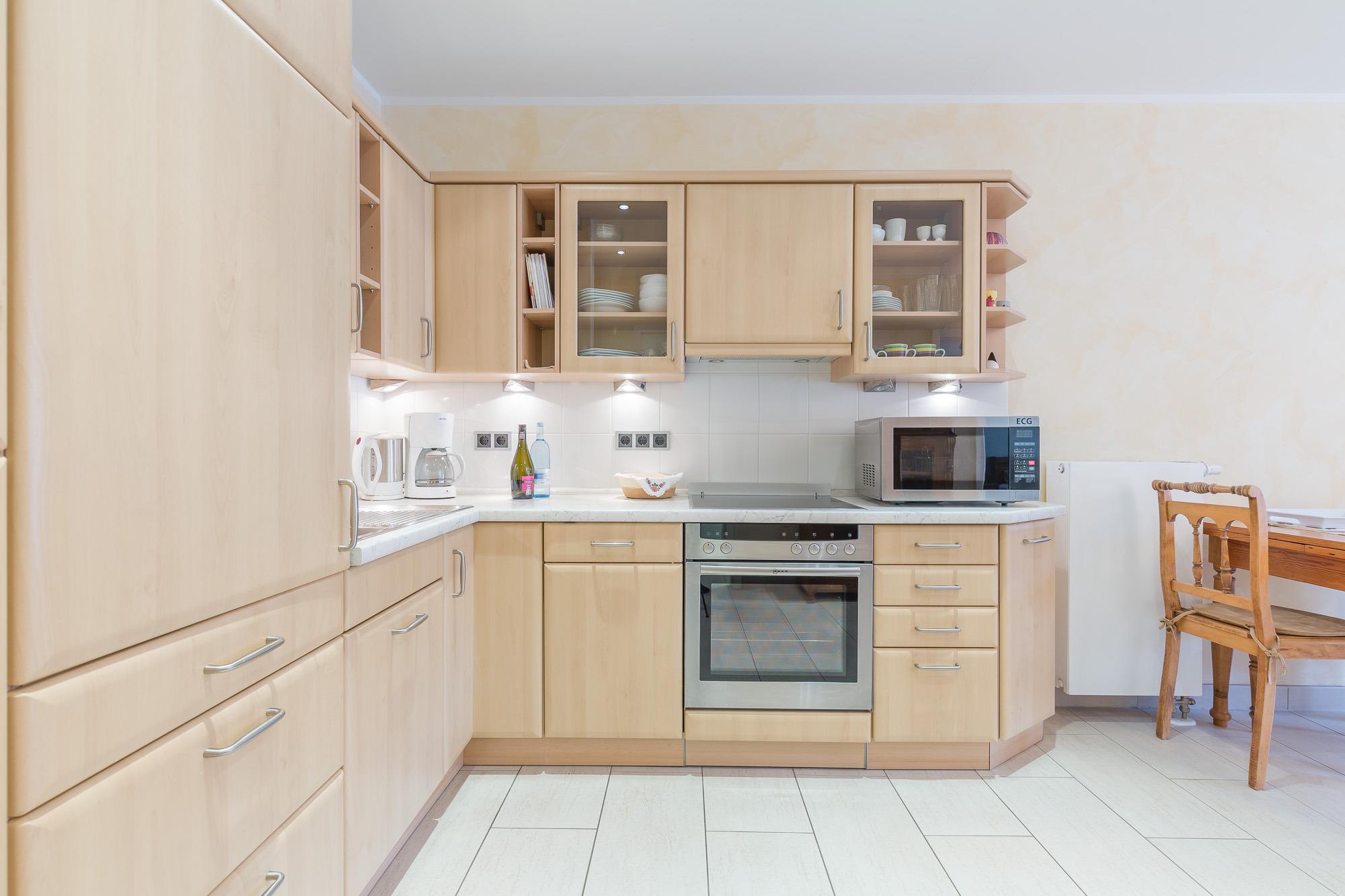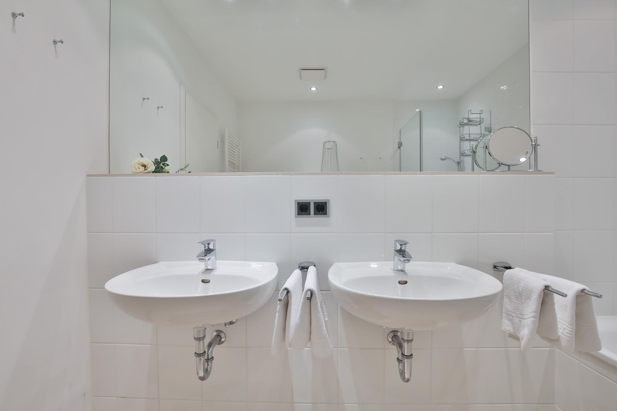 Die Ferienwohnung Nr. 5 liegt im 1. Obergeschoss zur Südseite und ist 55 qm groß. Sie ist modern und mit hochwertigen Möbeln ausgestattet und verfügt über eine komfortable Küchenzeile mit Backofen, Geschirrspülmaschine und Mikrowelle sowie ein Vollbad mit zwei Waschbecken, Dusche, Badewanne und WC. Die Ferienwohnung verfügt zudem über ein separates Gäste-WC.