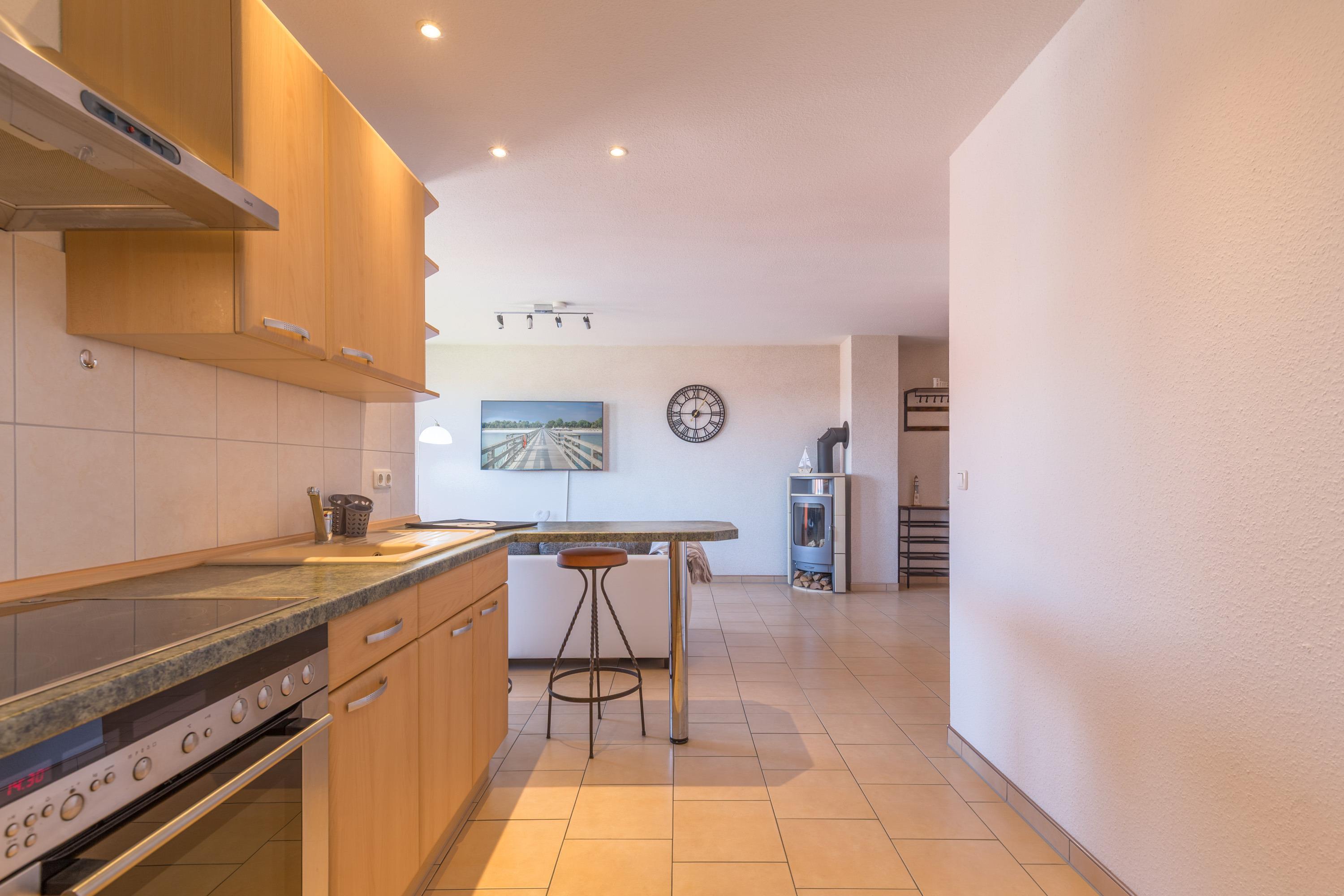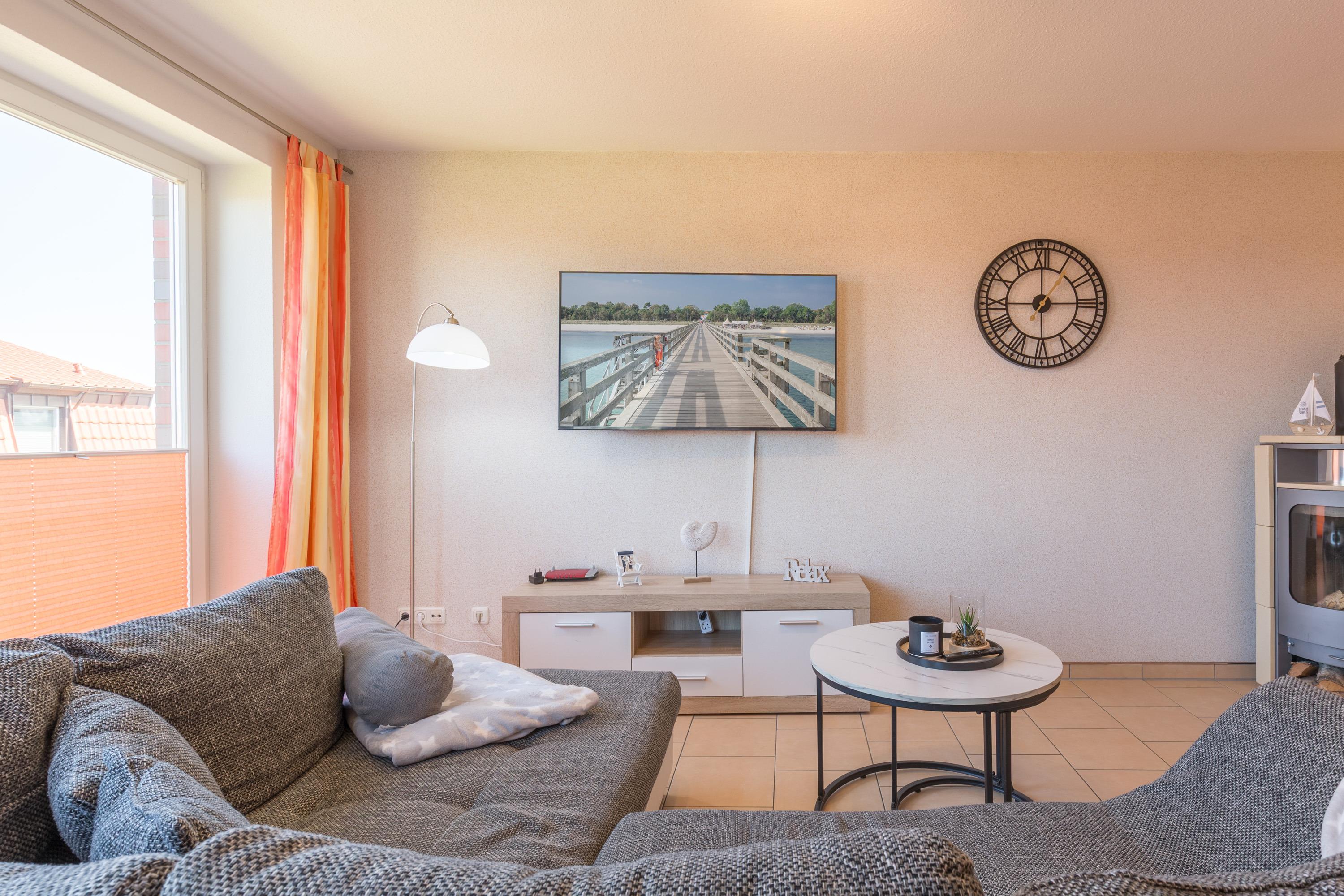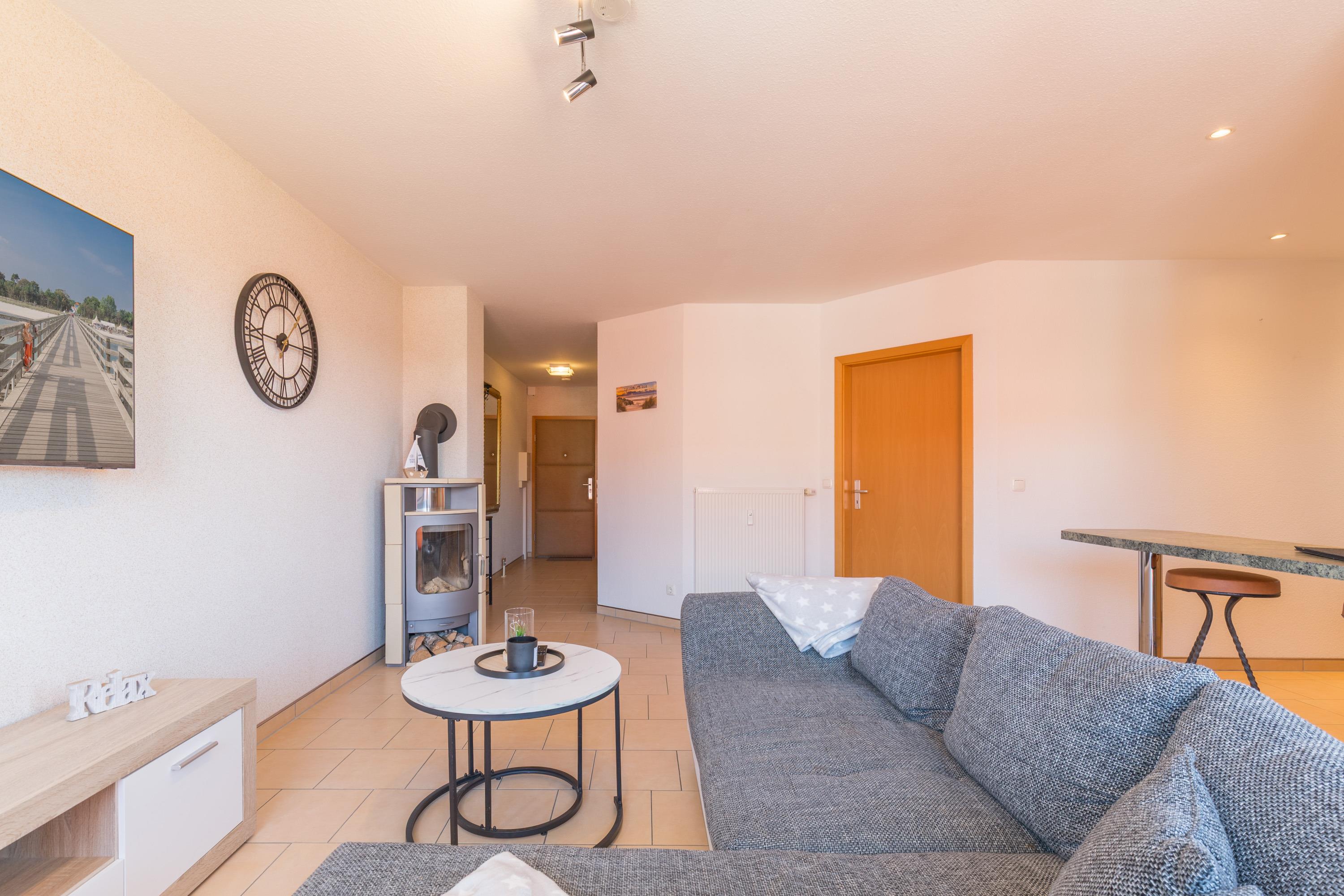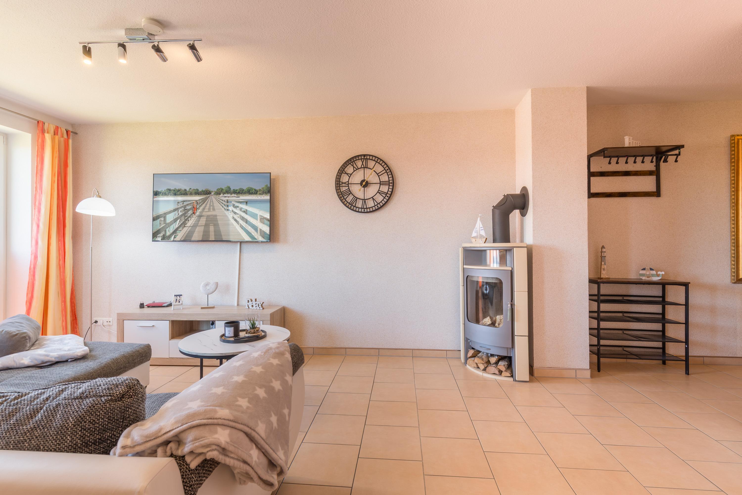 Besonders in den kälteren Monaten sorgt der Kamin/Ofen im Wohnzimmer für eine angenehme Wärme und eine gemütliche Atmosphäre. Für Unterhaltung ist ebenfalls gesorgt, denn in der Ferienwohnung steht ein moderner TV-Flachbild zur Verfügung.