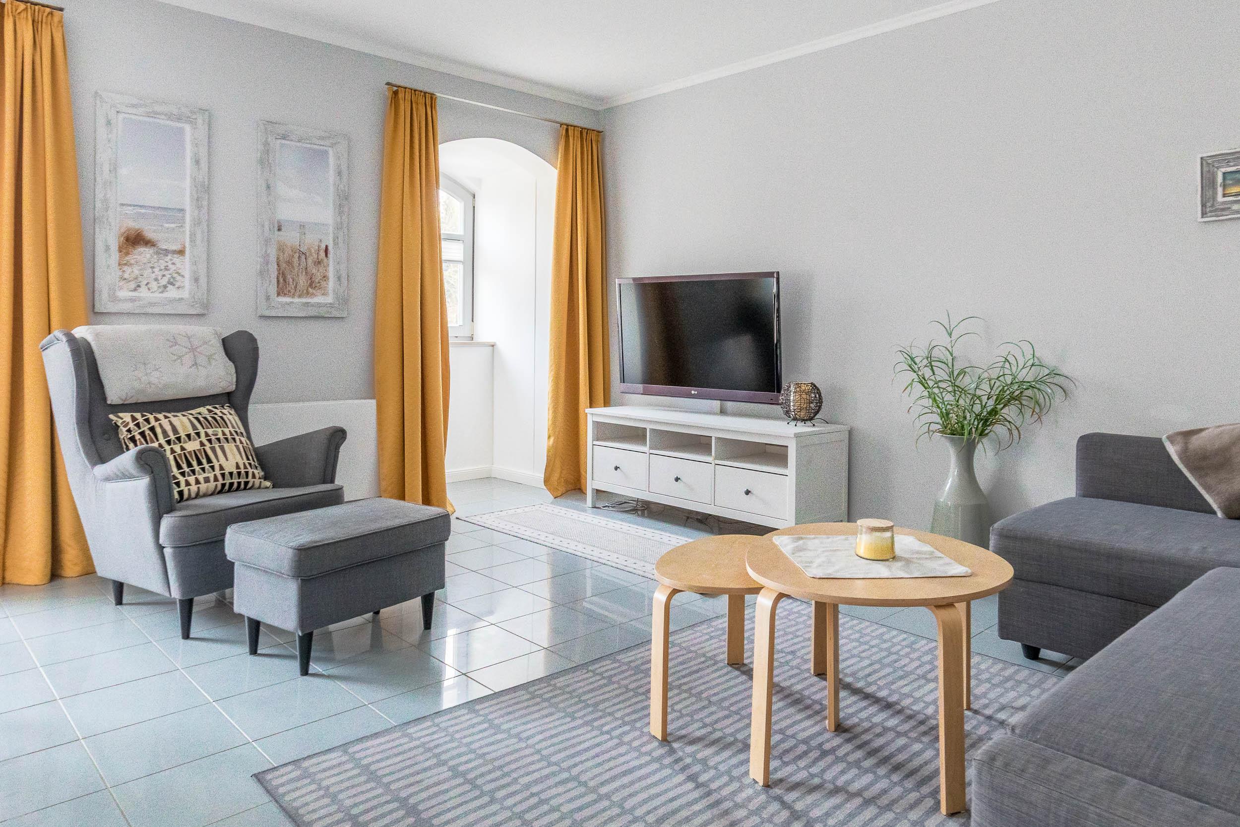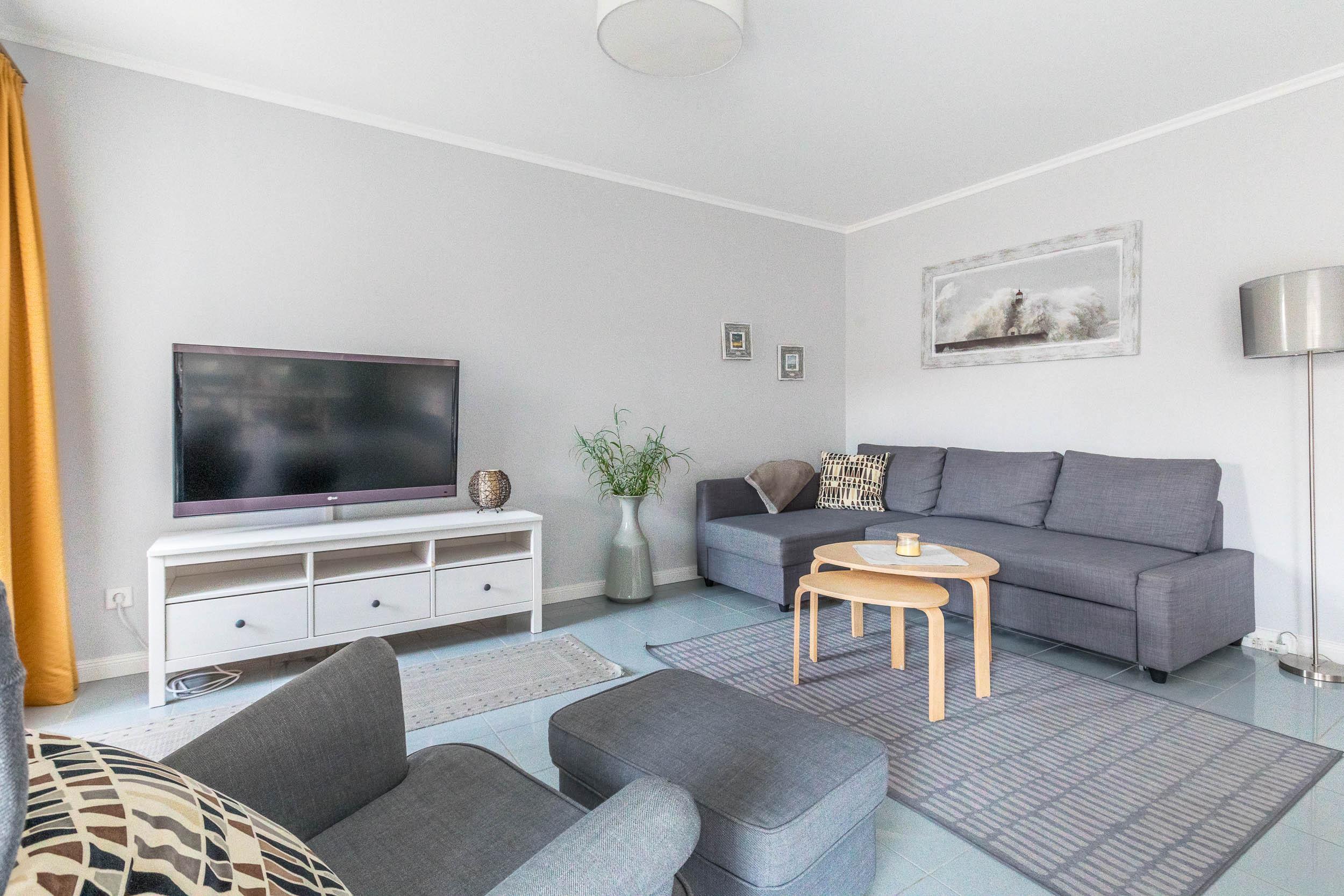 Der helle Wohn- und Essbereich lädt mit einer komfortablen Eckcouch und Fernseher zum Entspannen ein. Die Couch ist ausziehbar und bietet eine ausweichende Schlafmöglichkeit (Liegefläche 140x200cm).