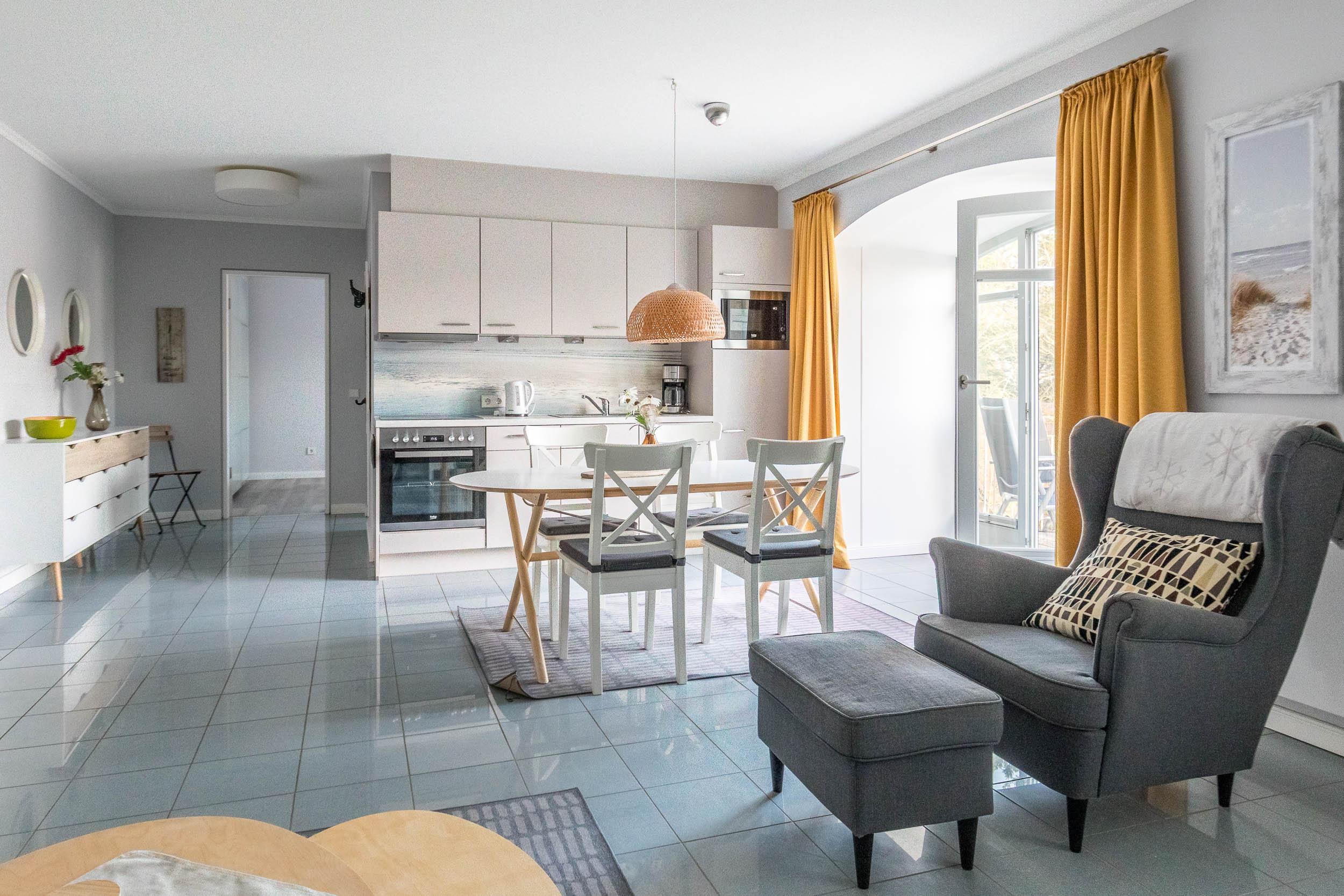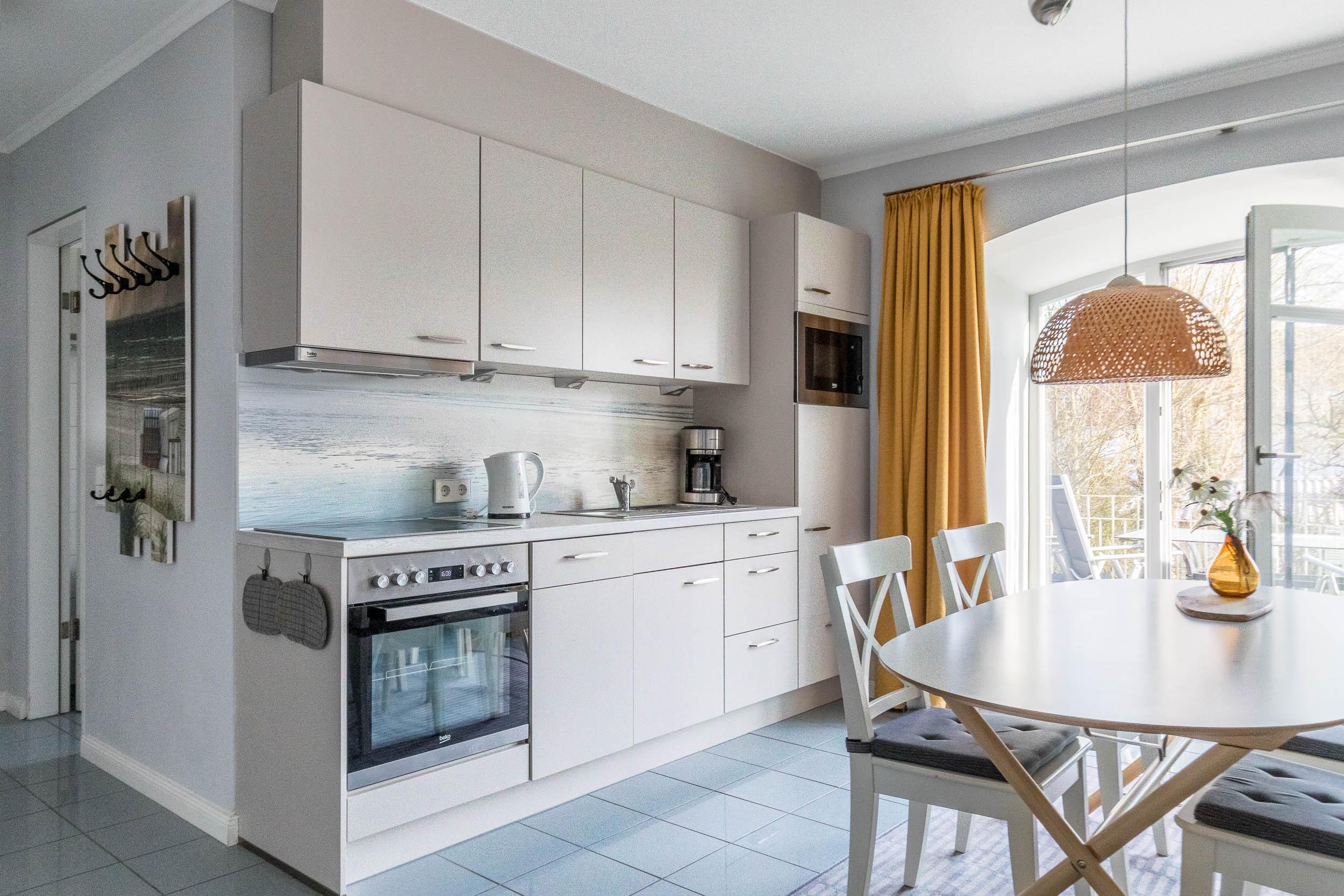 Die moderne, integrierte Küche ist komplett ausgestattet und verfügt unter anderem über einen Geschirrspüler, eine Mikrowelle, Kaffeemaschine, Toaster sowie weitere praktische Küchengeräte – ideal für die Selbstversorgung im Urlaub. An der Essecke können Sie gemütlich Ihre Mahlzeiten einnehmen.