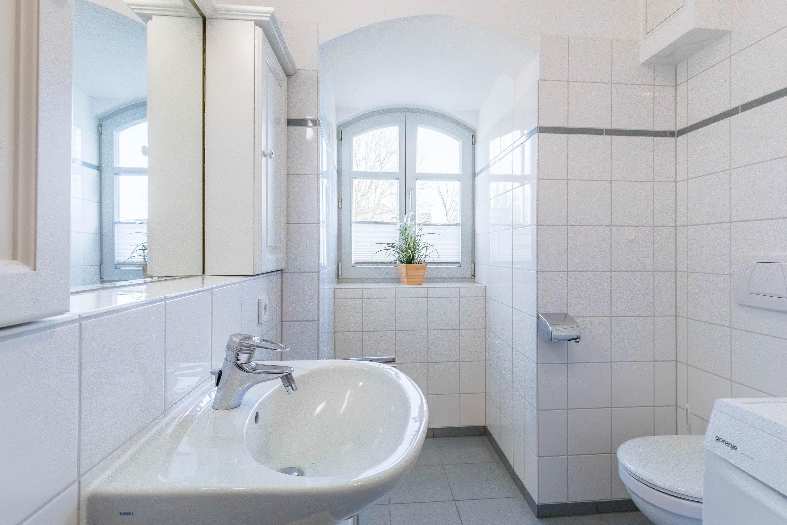 Das Appartement verfügt außerdem über ein helles Badezimmer mit Dusche, WC und kostenfreier Waschmaschine. Das Fenster bietet zusätzlich Tageslicht und hilft beim Lüften.
