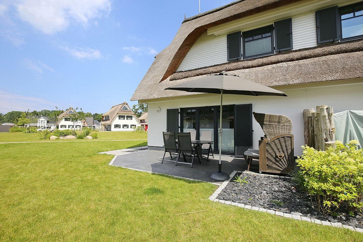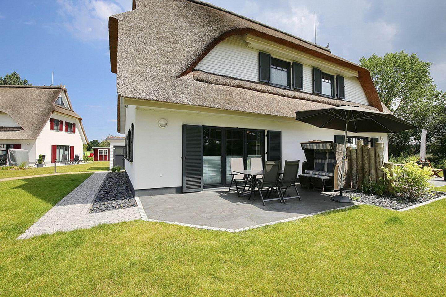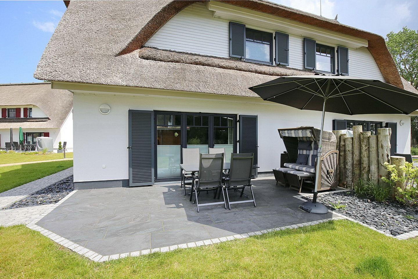 Auf drei Etagen vereint die großzügige Doppelhaushälfte mit Reetdach einen Wohnraum mit Zugang zur Terrasse, drei Schlafzimmer und zwei modernen Bädern. Zusammen mit dem Spitzboden hast du hier auf ca. 100 m² viel Platz für deinen Urlaub. Zum Strand sind es etwa 400 m.