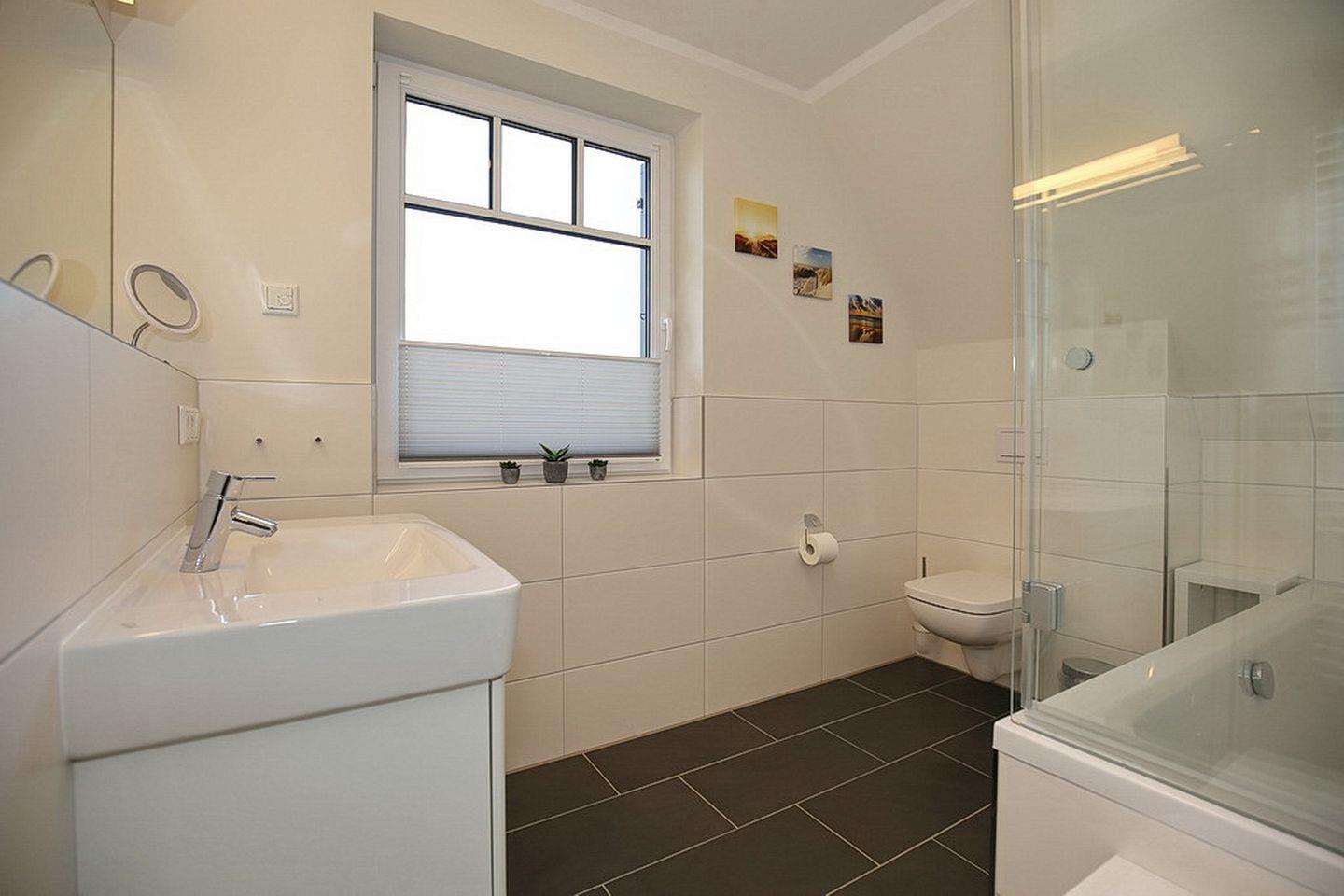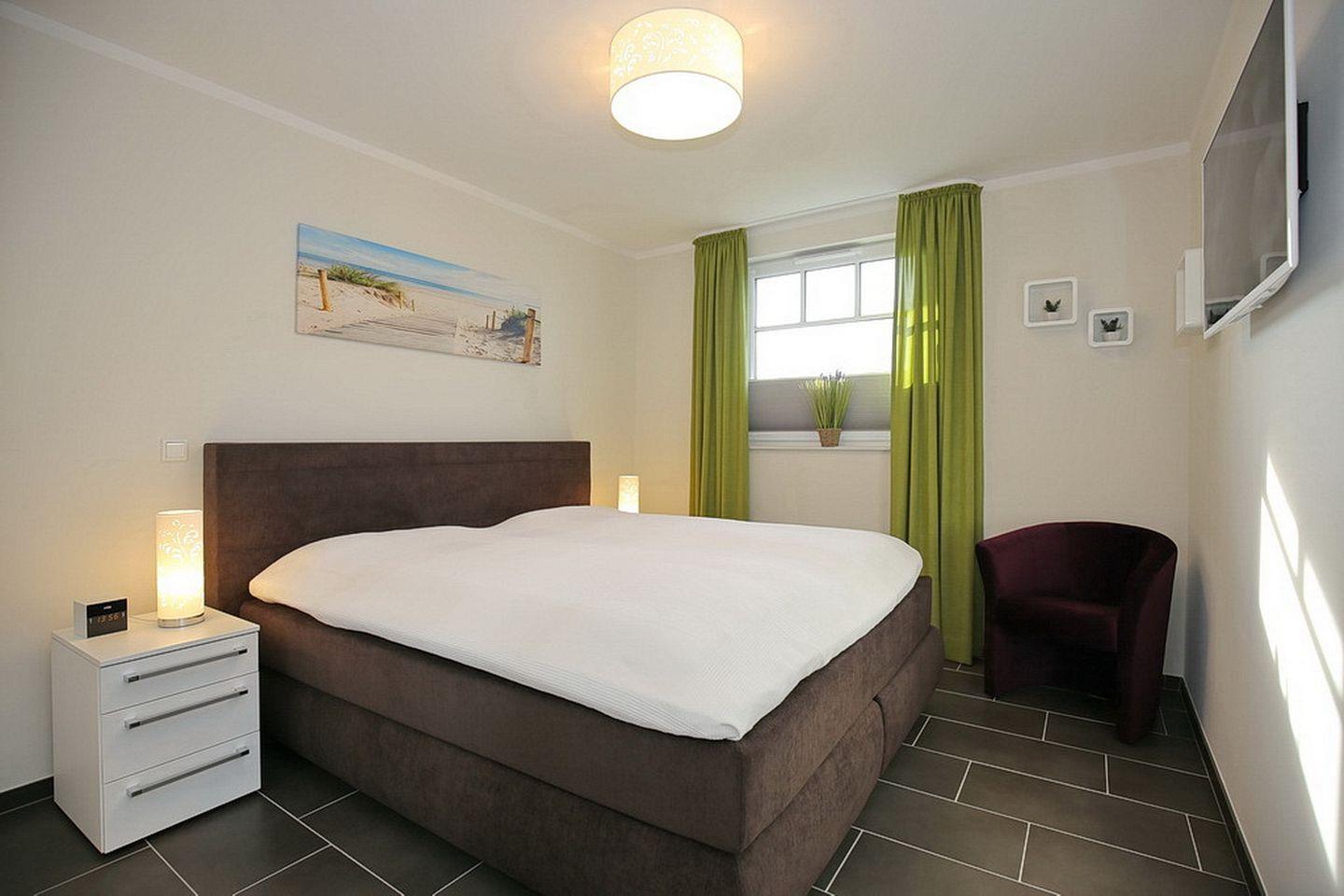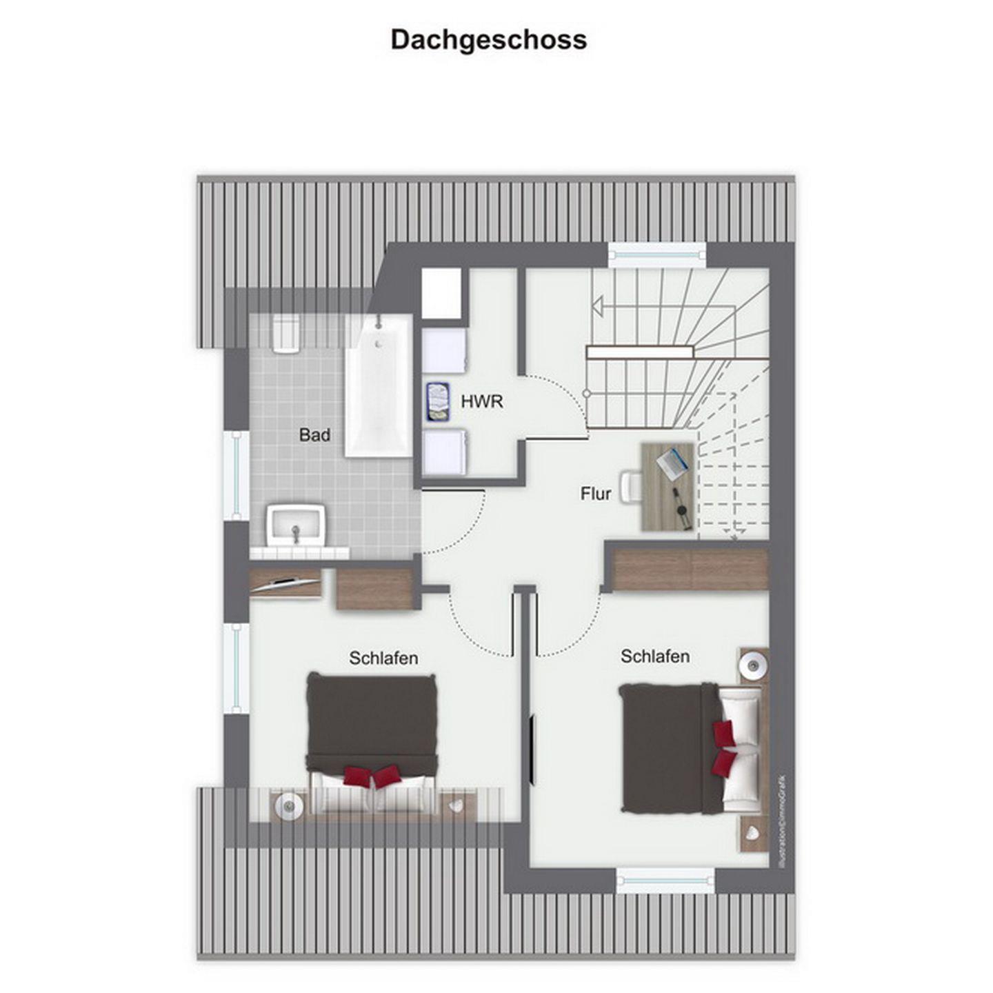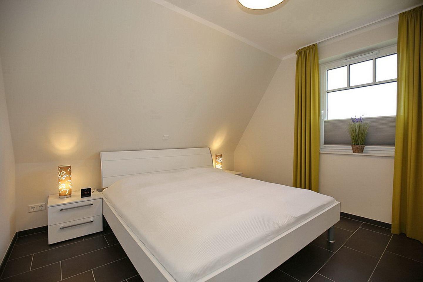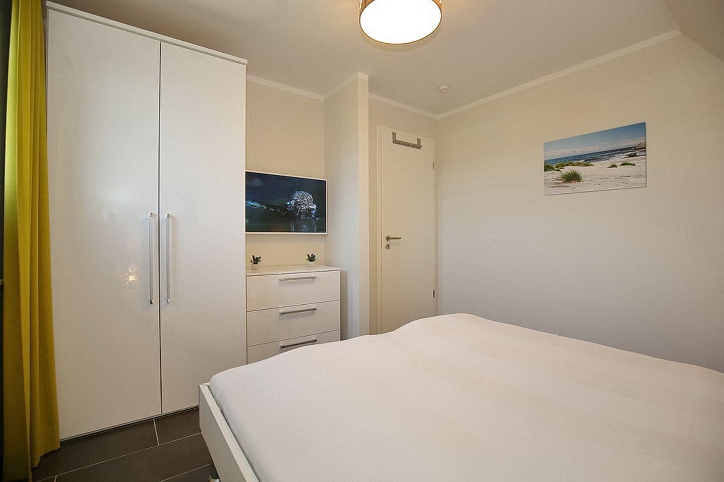 Im Dachgeschoss stehen zwei Schlafzimmer bereit. Beide Schlafzimmer sind mit jeweils einem 40"TV ausgestattet. In den Schlafzimmern stehen ein Boxspringbett (180 x 200 cm) bzw. ein Doppelbett (2x 90 x 200 cm) zur Verfügung. Weiter verfügt das Dachgeschoss über ein Bad, mit Badewanne und Dusche und den Flur, wo sich ein Schreibtisch befindet.