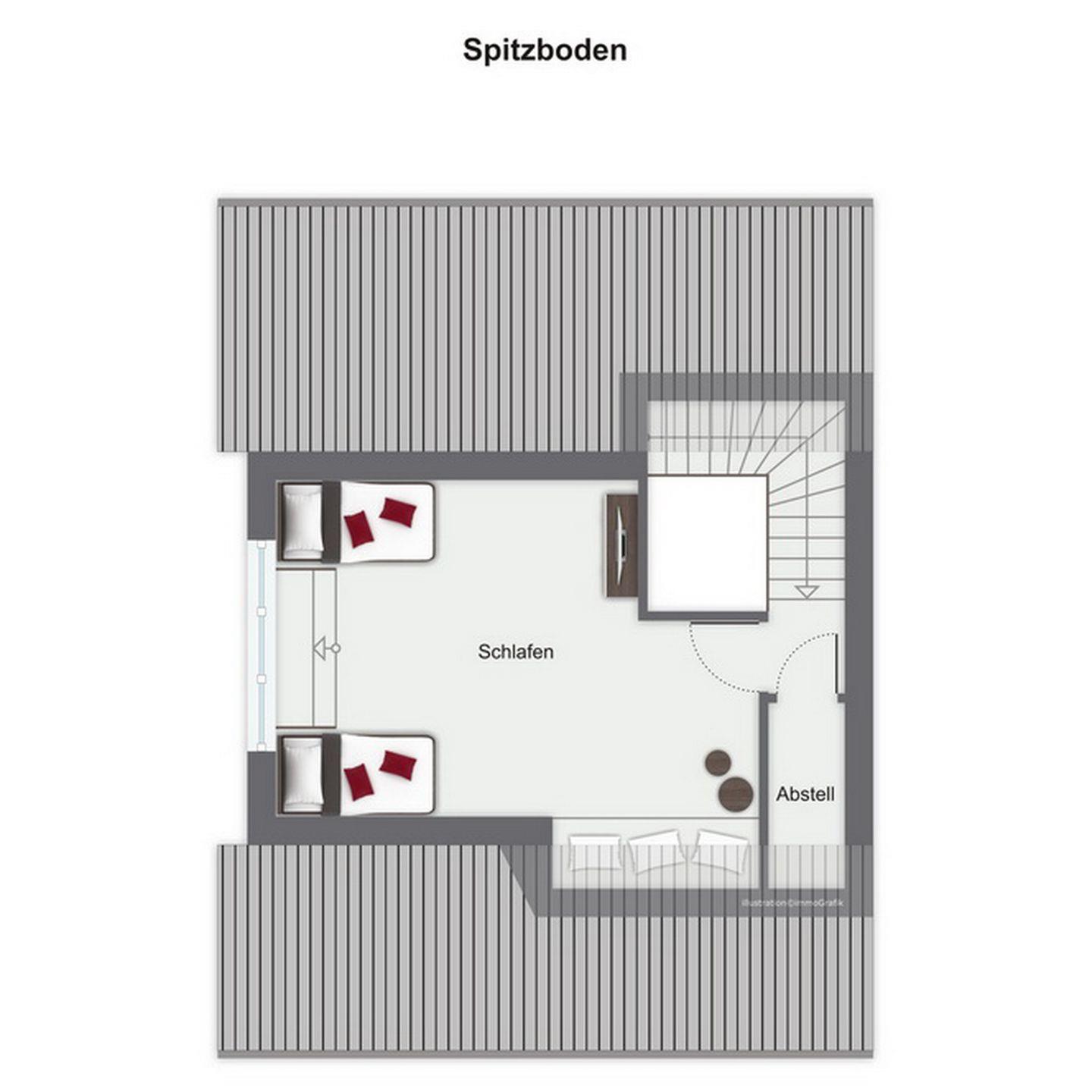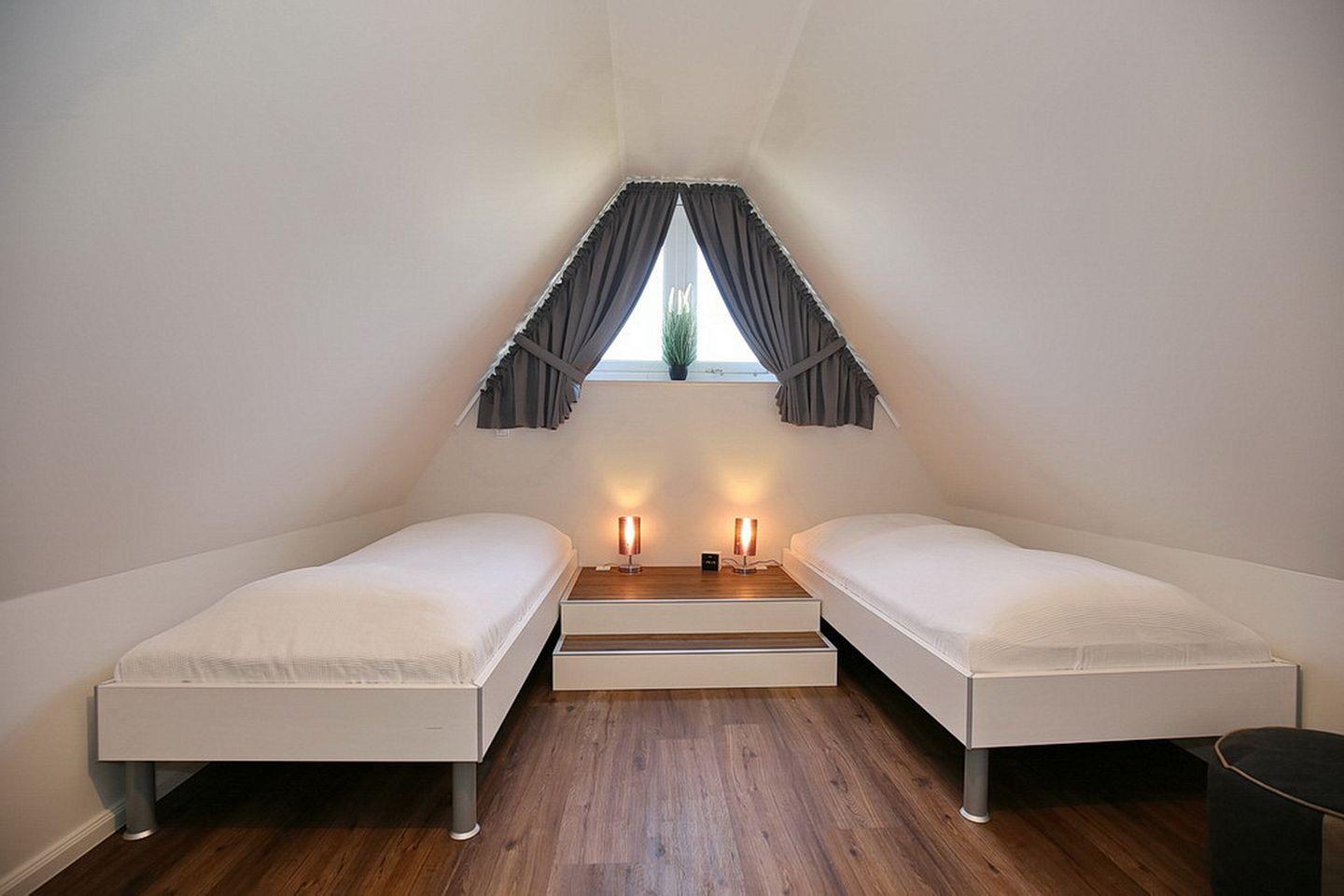 Im Spitzboden befindet sich ein weiteres Schlafzimmer das mit einem 40" TV, einem Radio/CD-Player mit Bluetooth-Streaming-Funktion und zwei Einzelbetten (90 x 200 cm) ausgestattet ist.
