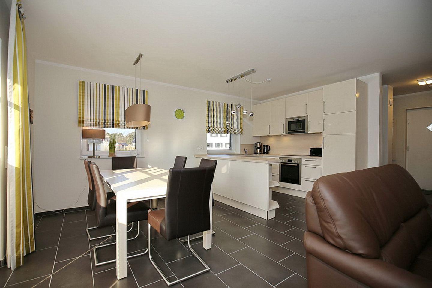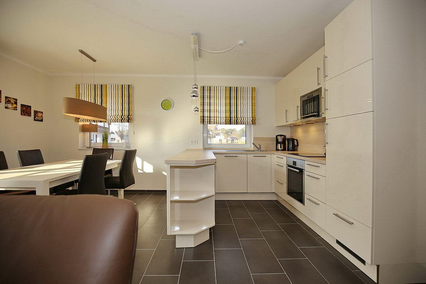 In der modernen Küchenzeile findest du einen Backofen, einen 4-Platten-Induktionsherd, einen Kühlschrank mit Gefrierfach, eine Mikrowelle, eine Kaffeepad-Maschine (Philips-Senseo) und einen Geschirrspüler vor.