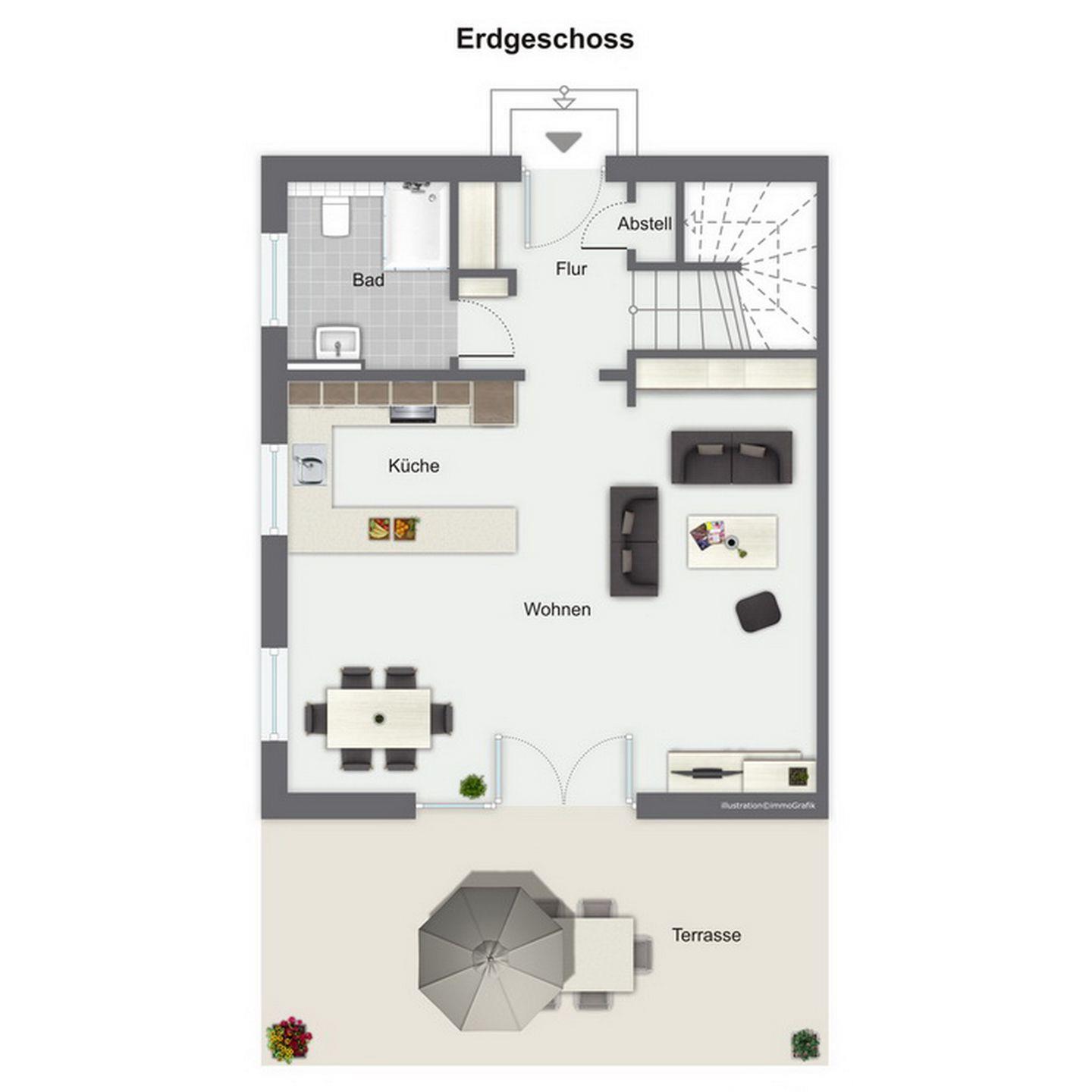 Im Erdgeschoss des Ferienhauses befindet sich der großzügige Wohnraum mit seinem gemütlichen Essbereich sowie der integrierten Küchenzeile. Auch das Gäste-WC mit Dusche und den Eingangsbereich findest du hier.