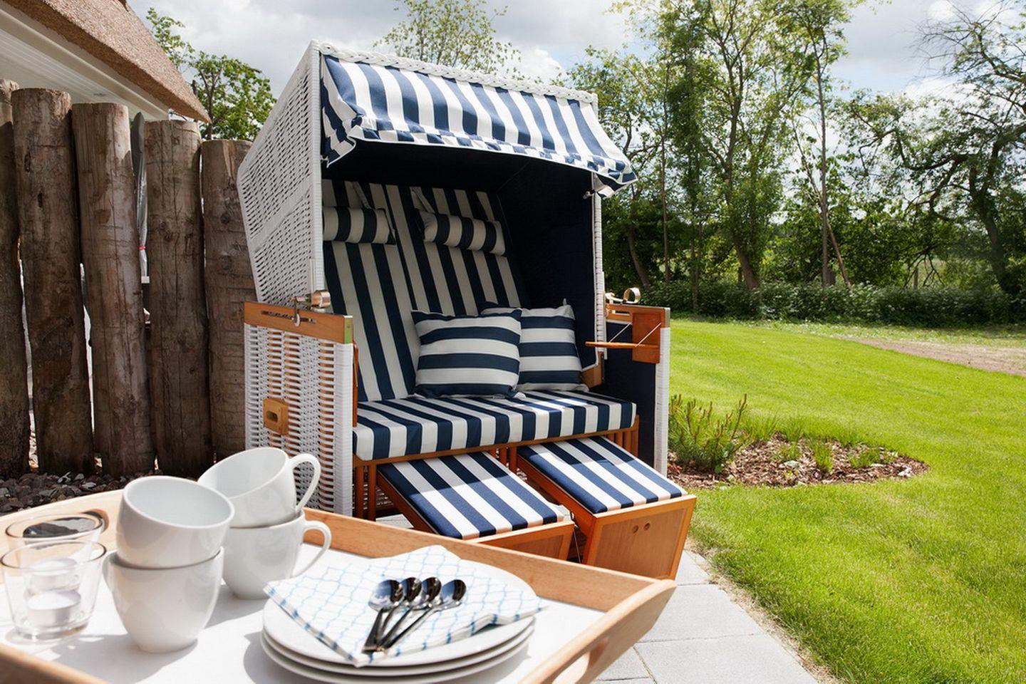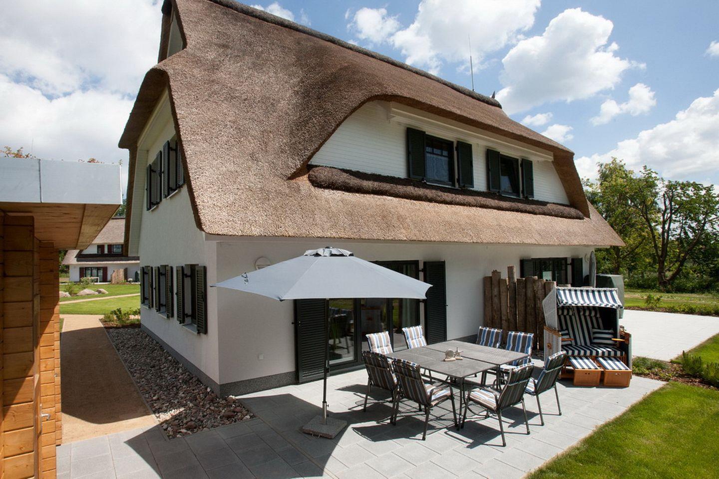 Auf drei Etagen vereint die großzügige Doppelhaushälfte mit Reetdach einen Wohnraum mit Zugang zur Terrasse, drei Schlafzimmer und zwei moderne Bäder. Zusammen mit dem Spitzboden hast du hier auf über 100 m² viel Platz für deinen Urlaub.