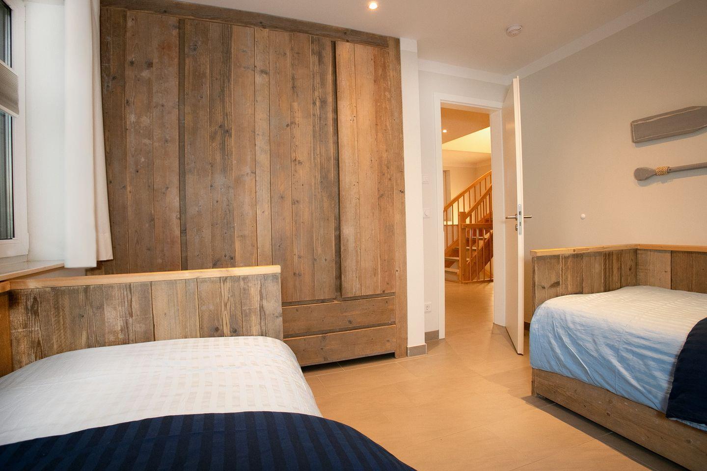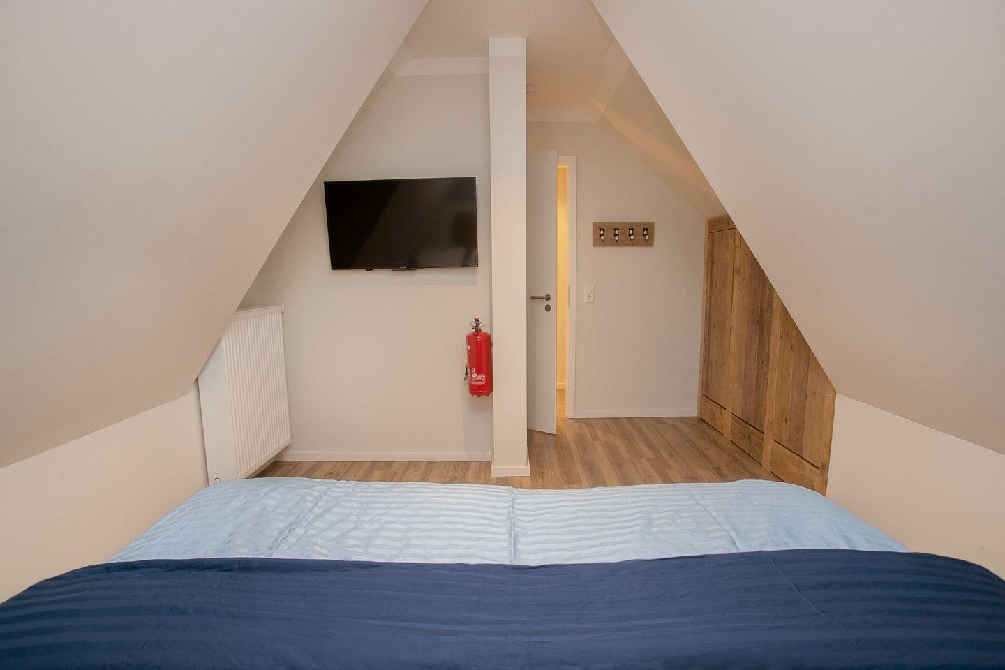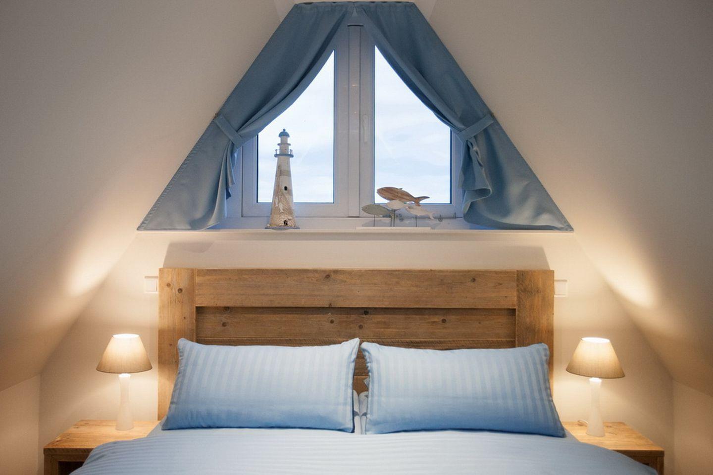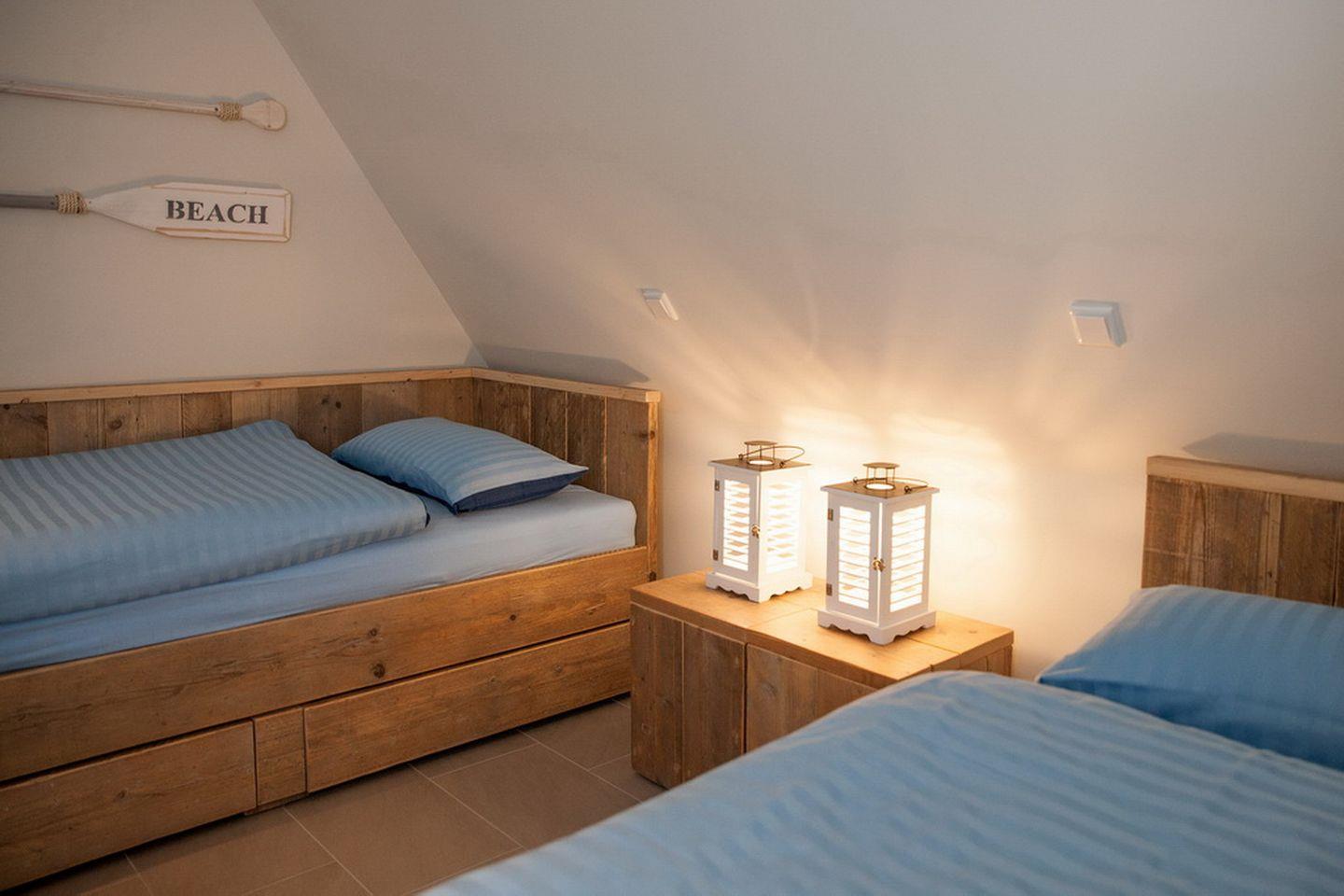 In den zwei Schlafzimmern im Dachgeschoss stehen dir im ersten Schlafzimmer ein Doppelbett (2 x 90 x 200 cm) und im zweiten Schlafzimmer zwei Einzelbetten (90 x 200 cm) mit einem zusätzlichen Ausziehbett für 1 Kind (80 x 190 cm) zur Verfügung. Einen mobilen Kinder Raus-Fall-Schutz und eine zusätzliche Matratze für das Kinderreisebett findest du im Abstellraum.