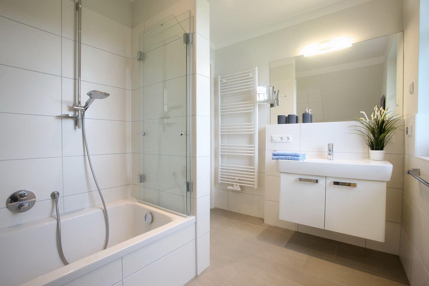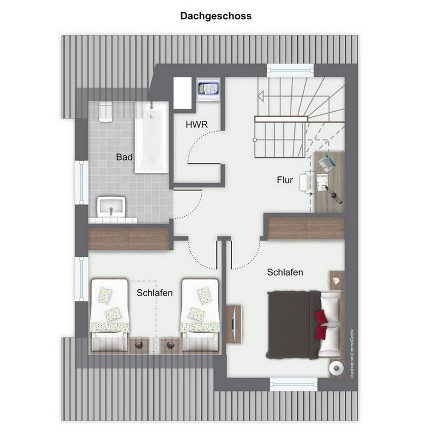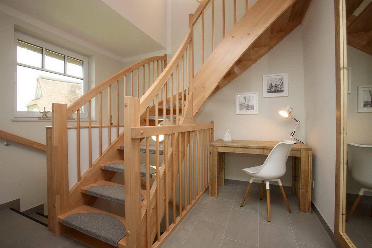 Weiterhin verfügt das Dachgeschoss über einen Hauswirtschaftsraum mit Waschmaschine und Trockner, ein Bad mit Badewanne und den Flur mit separatem Arbeitsplatz für deine Urlaubspost.