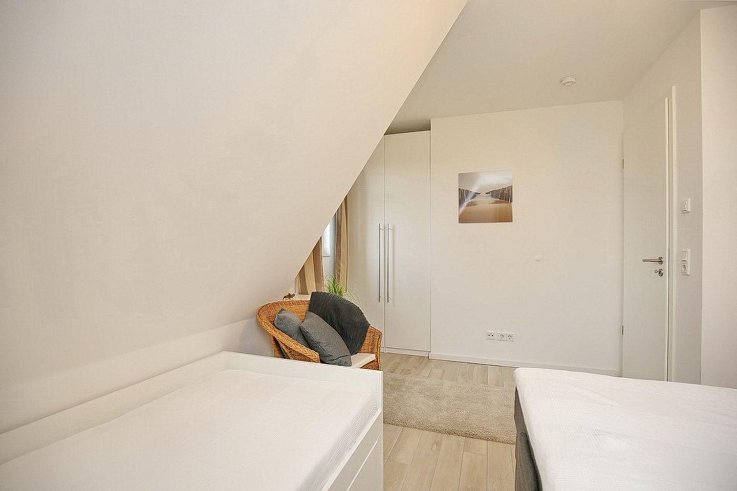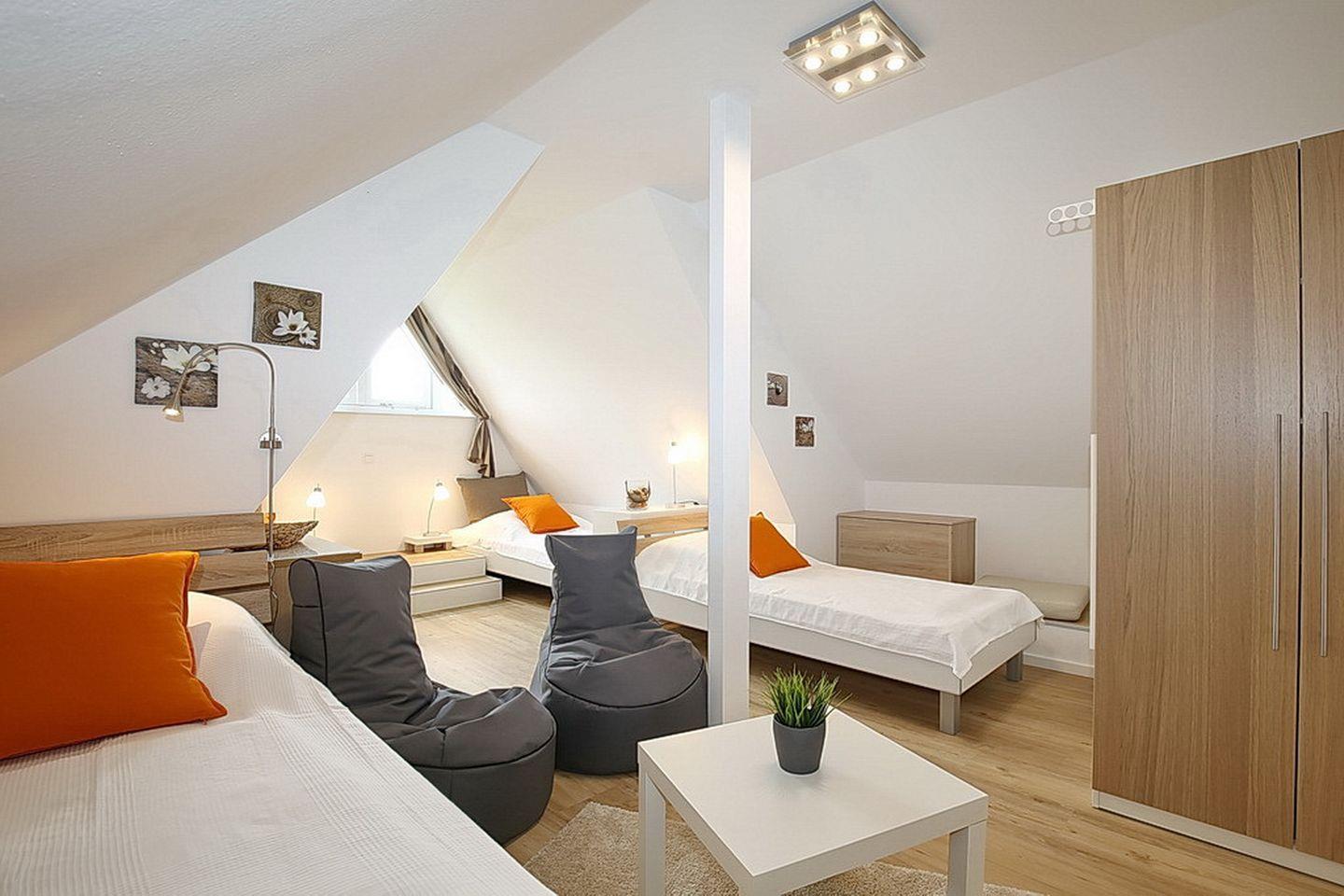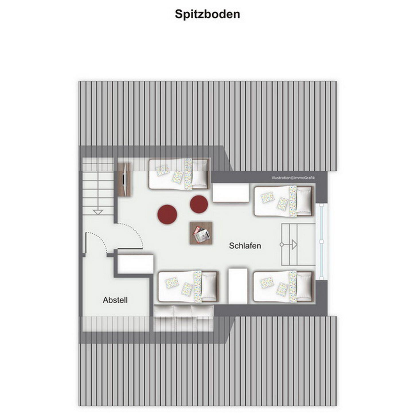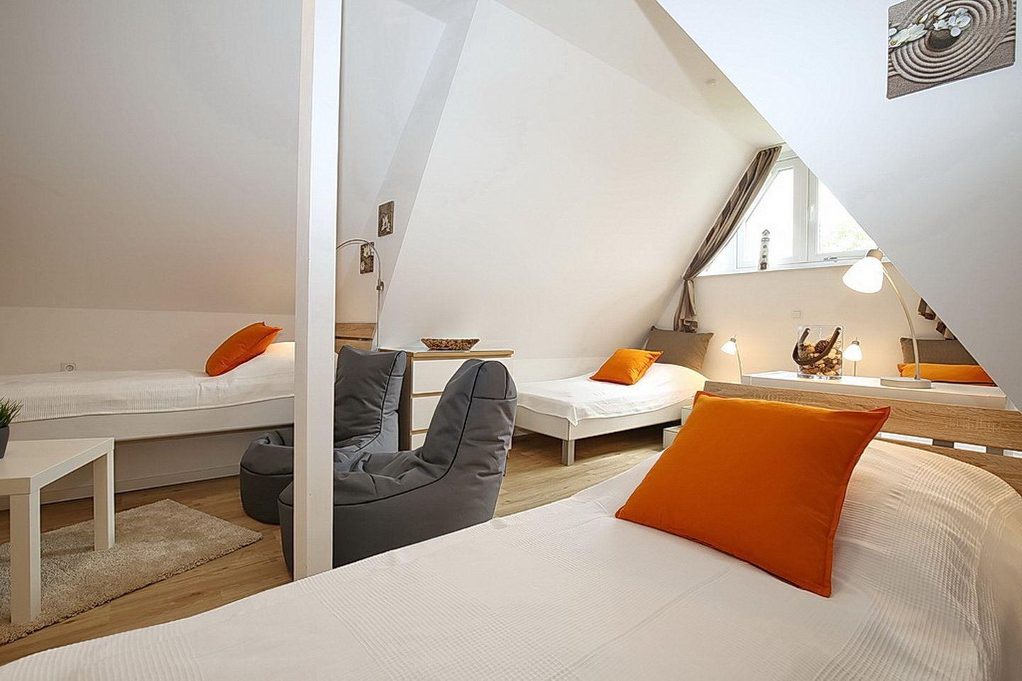 Im Spitzboden befindet sich ein weiteres Schlafzimmer mit vier Einzelbetten (90 x 200 cm). Das Schlafzimmer verfügt zusätzlich über einen TV und eine Spielekonsole (PS4). Spiele können bei der Rezeption (gegen Pfand) ausgeliehen werden.