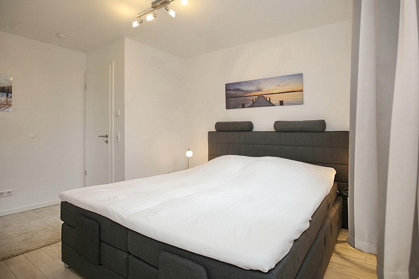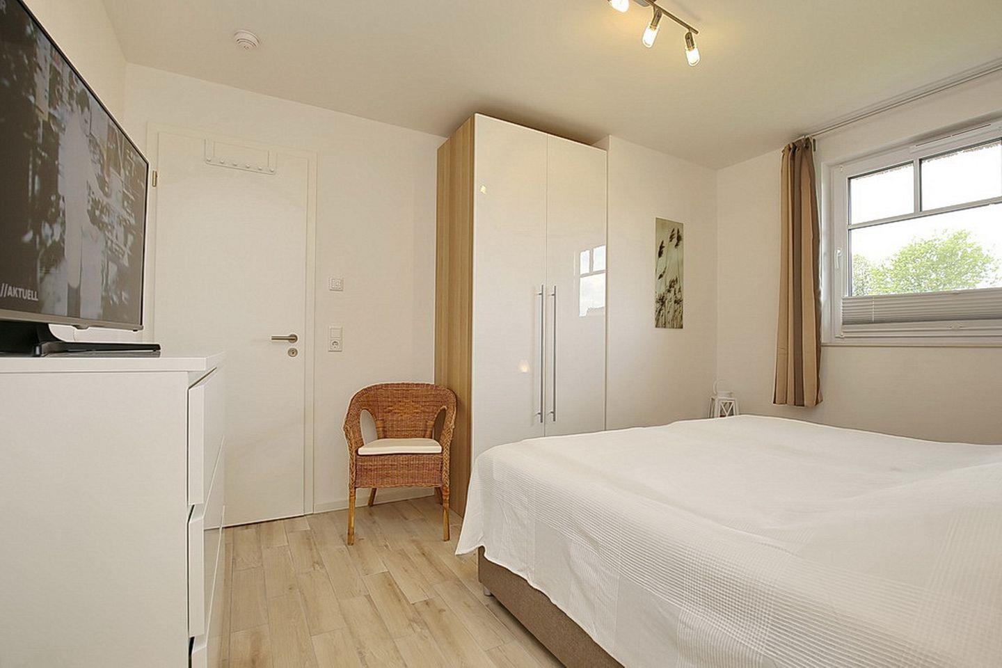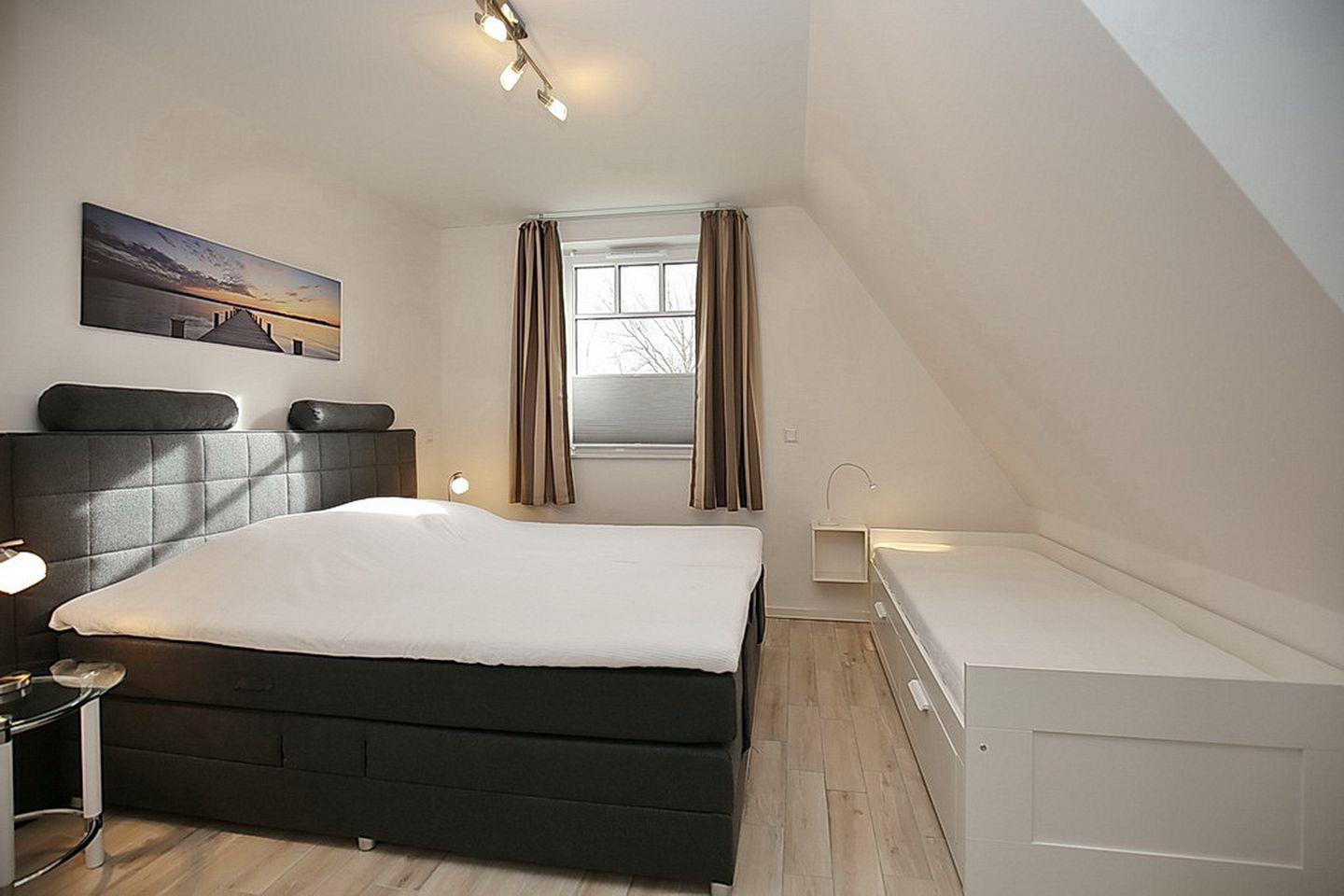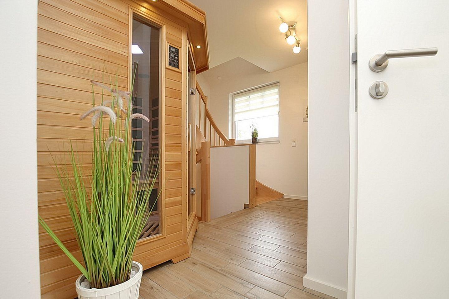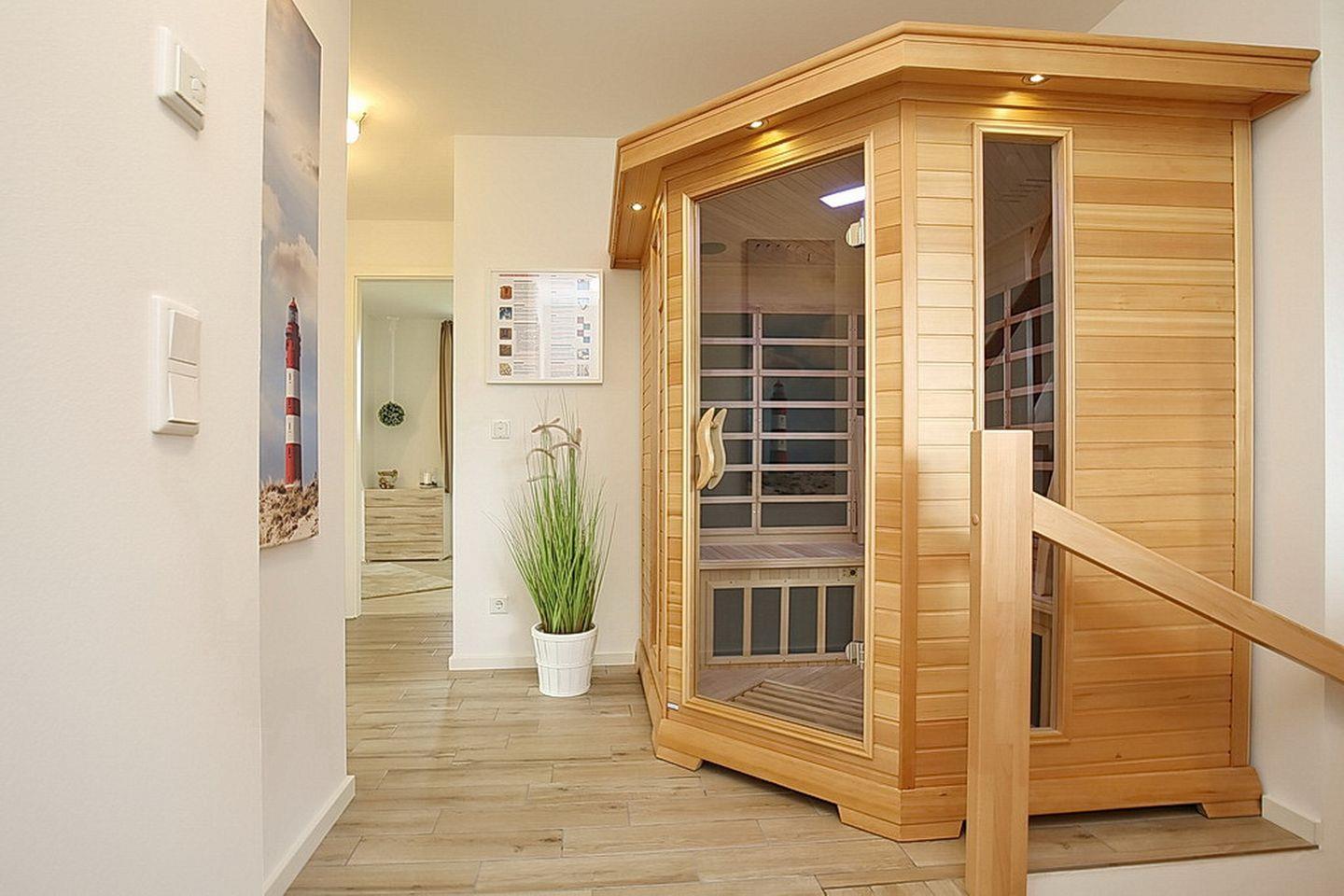 Im Obergeschoss finden Sie zwei Schlafräume vor, die beide mit Schränken für deine Urlaubsgarderobe ausgestattet sind. In einem stehen ein Boxspringbett (2 x 90 x 200 cm) und für die dritte Person ein Einzelbett (80 x 200 cm). Im zweiten Schlafzimmer ist ebenfalls ein Boxspringbett (2 x 90 x 200 cm) vorhanden und ein Fernseher. Hiervon geht ein Abstellraum ab, in dem sich ein Safe, ein Kinderbett, eine Babybadewanne und ein Toilettensitz für Kleinkinder befinden. Des Weiteren verfügt das Obergeschoss über zwei Bäder mit Badewanne und Dusche, den Flur und eine kleine Infrarotsauna mit integrierter Farblichttherapie zum Entspannen. Alle großen Fenster im Obergeschoss sind mit Fliegenschutzgitter ausgestattet.