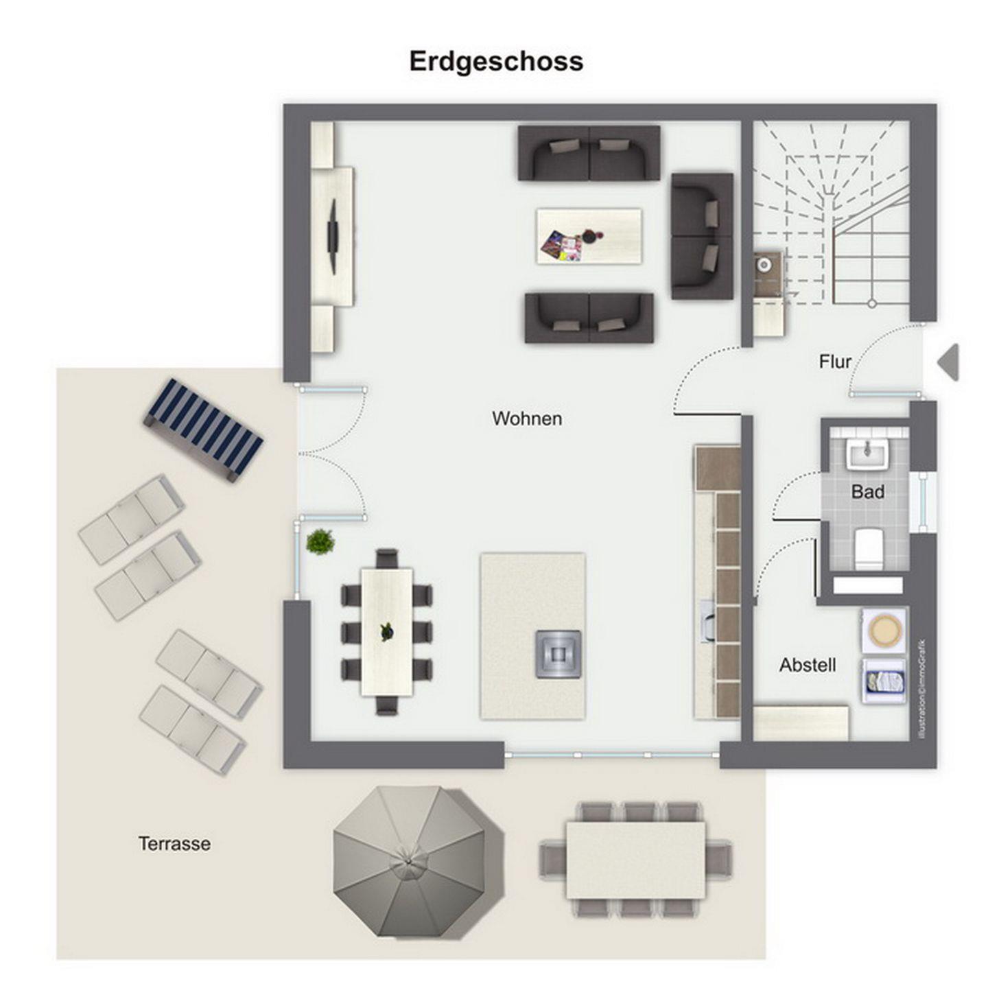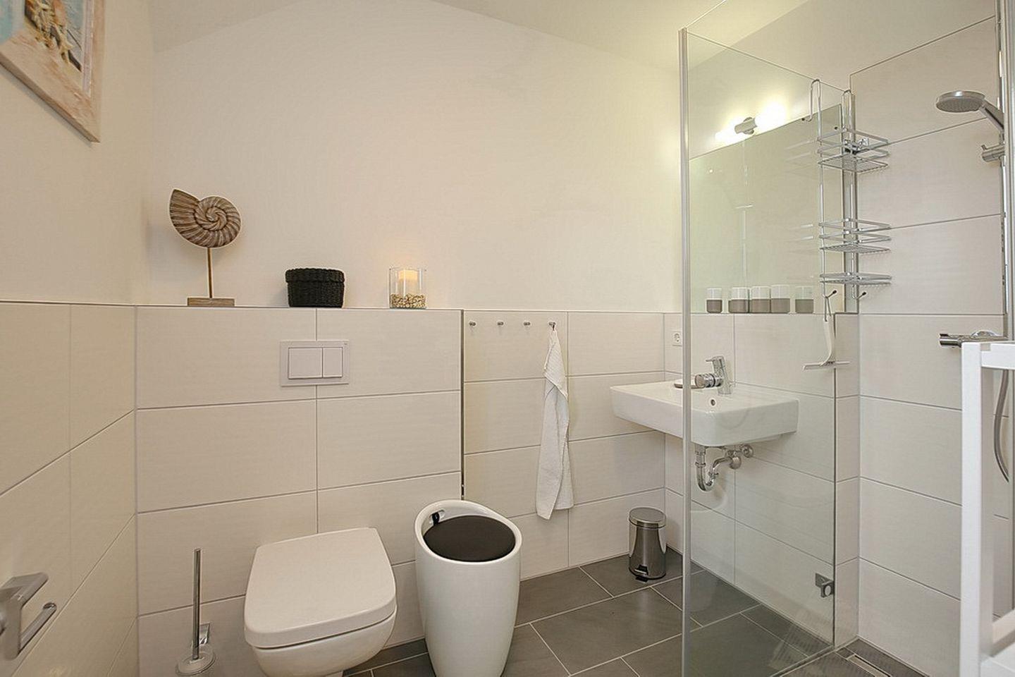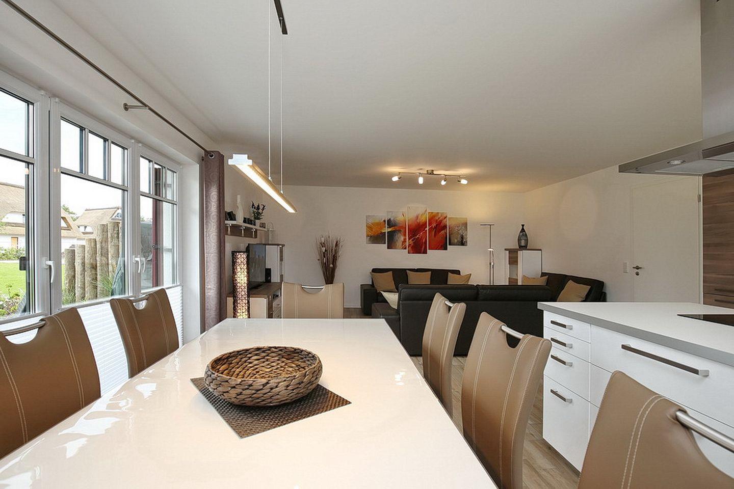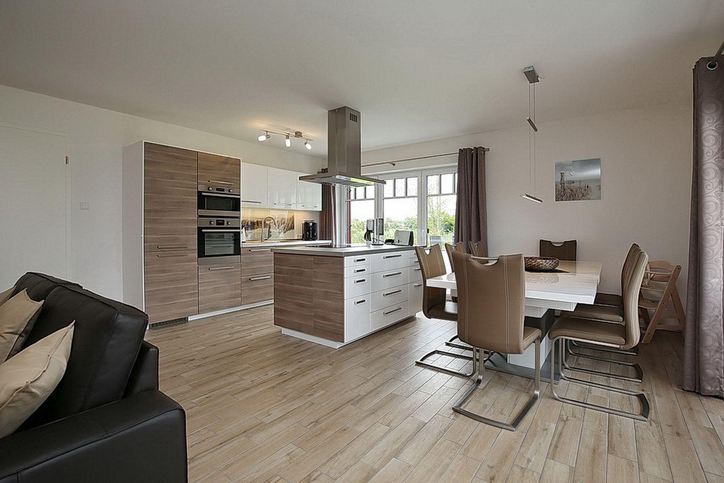 Im Erdgeschoss des Ferienhauses befinden sich der Wohnraum mit Sofas, eine gemütliche Essgruppe mit einem Kinderhochstuhl sowie die integrierte Küche, mit einer Kücheninsel inkl. Geschirrspüler, Backofen, Mikrowelle, 4-Platten-Induktionskochfeld und einem Kühlschrank mit Gefrierfach. Für deine Unterhaltung stehen dir ein Flachbild-TV, ein DVD-/Blu-Ray-Player und eine Stereoanlage zur Verfügung. Auch das Duschbad, der Hauswirtschaftsraum mit Waschmaschine und Trockner sowie der Eingangsbereich sind hier untergebracht.