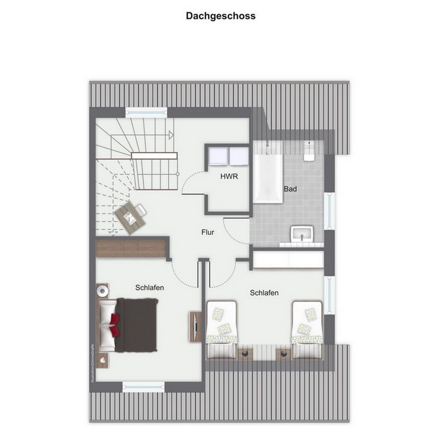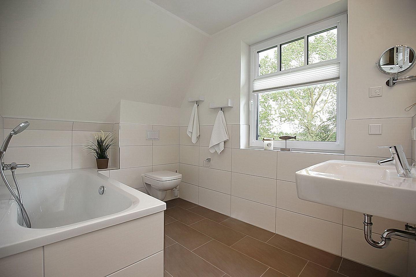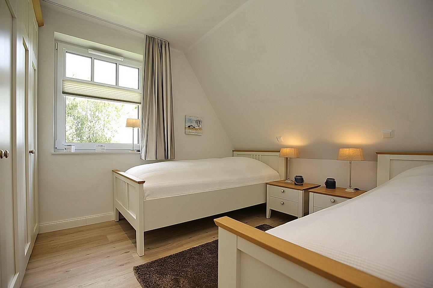 Im Dachgeschoss stehen dir zwei Schlafzimmer zur Verfügung. Ein Schlafzimmer ist mit einem Boxspringbett (2x 90 x 200 cm) und das weitere Schlafzimmer mit zwei Einzelbetten (100 x 200 cm) und einem TV ausgestattet. Weiterhin verfügst du im Dachgeschoss über Waschmaschine, Trockner und ein Bad mit Badewanne. Ein Fön ist ebenfalls vorhanden. Für die Nutzung der Sauna zahlst du eine Endreinigung (den Schlüssel erhältst du in der Rezeption).