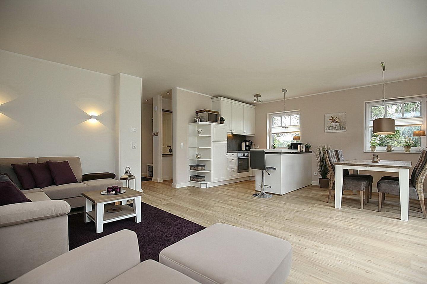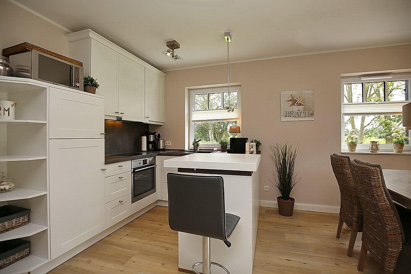 Der Zugang zur Süd/West Terrasse erfolgt direkt vom Wohnzimmer aus. Die Terrasse ist selbstverständlich mit Terrassenmöbeln und zusätzlich mit einem Strandkorb ausgestattet. Für deine Unterhaltung stehen dir ein Flachbild-TV, ein Radio/CD Player, ein DVD-Player, ein Blu-ray-Player und eine Spielkonsole (Wii) bereit. In der modernen Küchenzeile findest du Backofen, 4-Platten-Cerankochfeld, Kühlschrank mit Gefrierfach, Mikrowelle und einen Geschirrspüler vor.