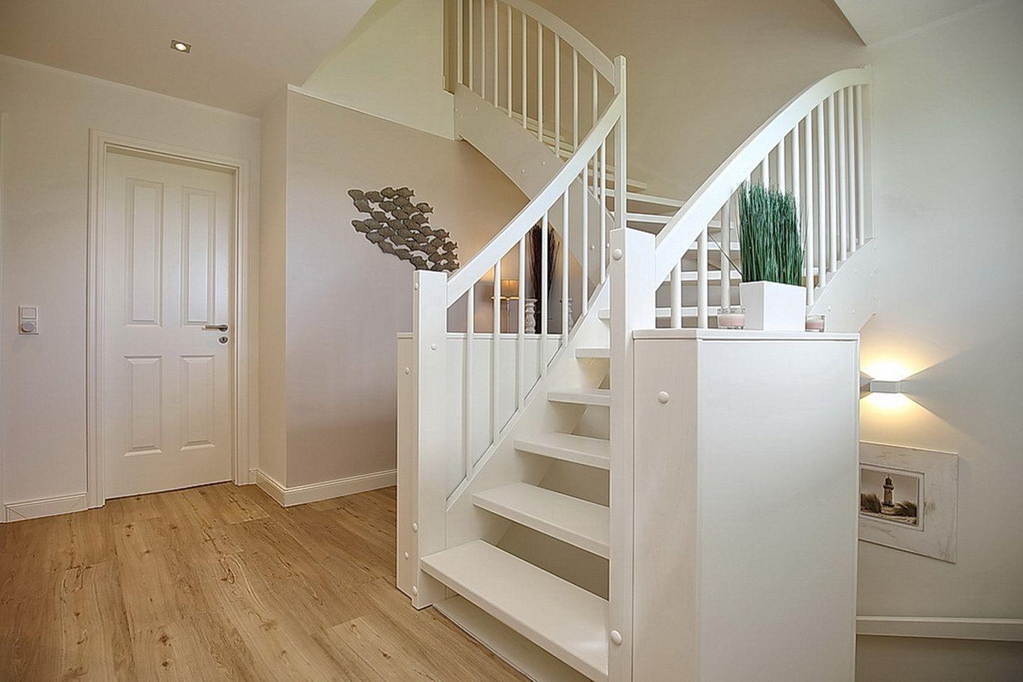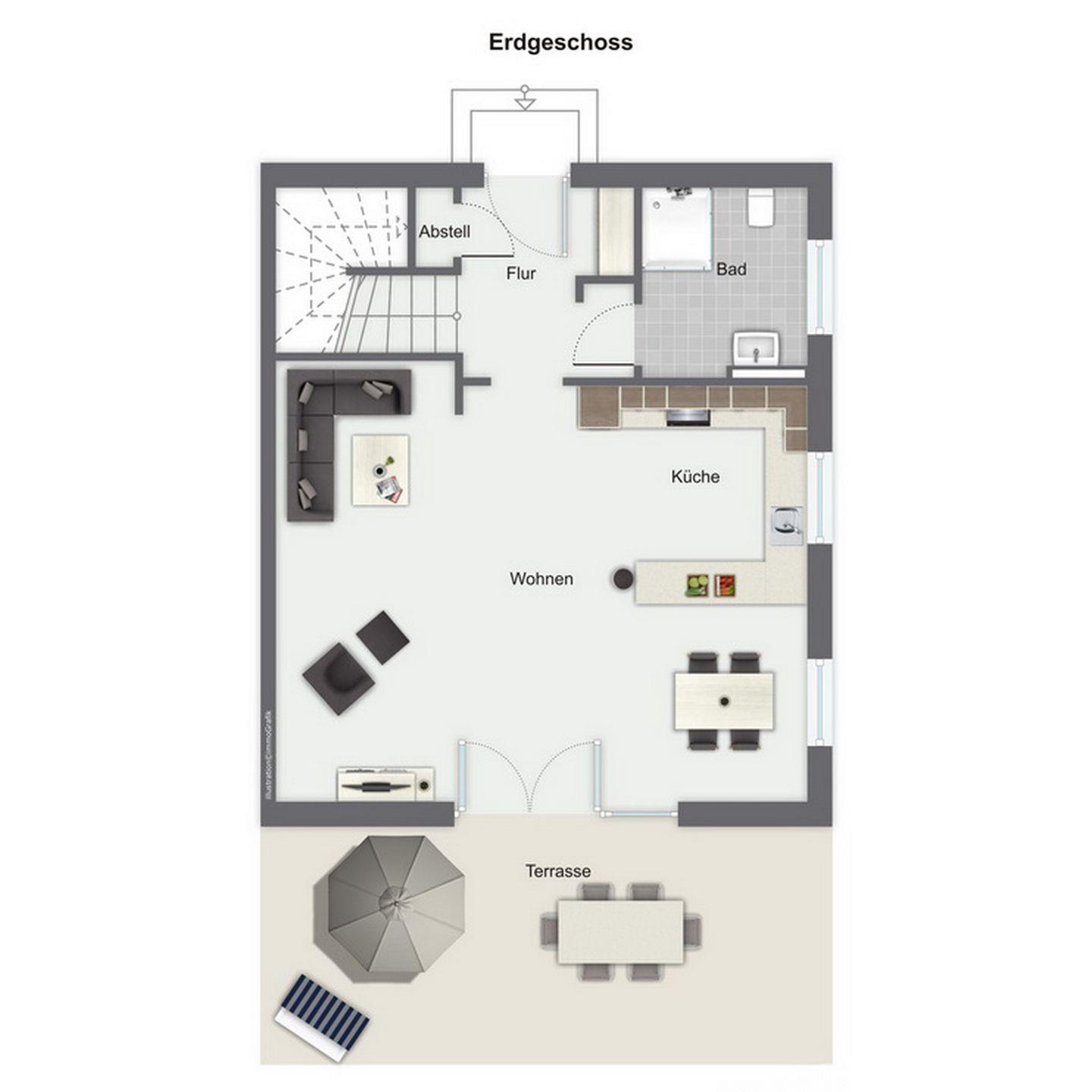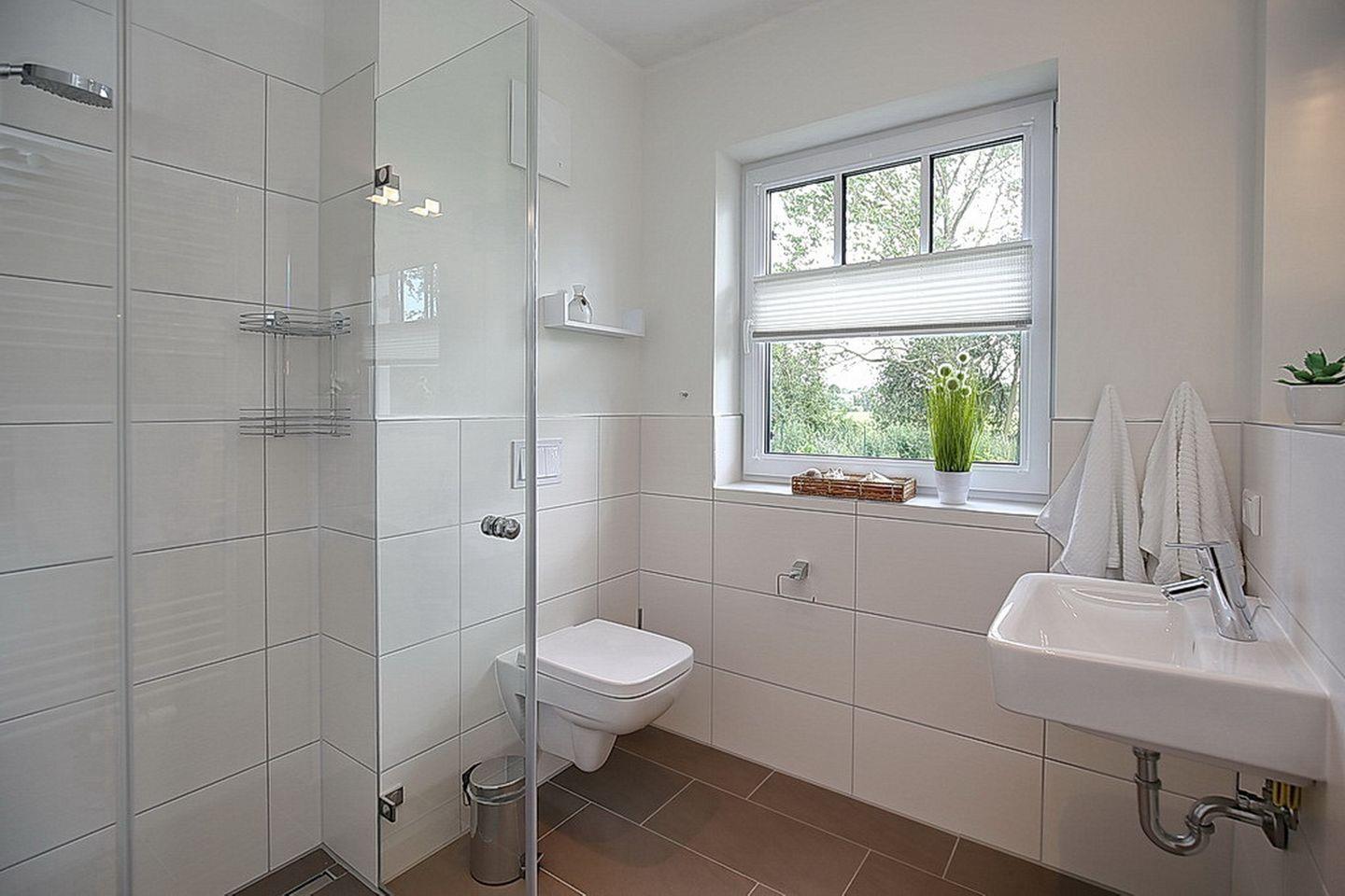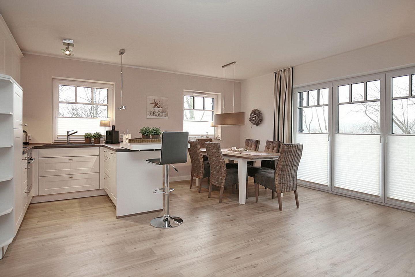 Im Erdgeschoss des Ferienhauses befindet sich der großzügige Wohnraum mit gemütlichem Essbereich sowie die integrierte Küchenzeile. Auch das Gäste-WC mit Dusche findest du hier.