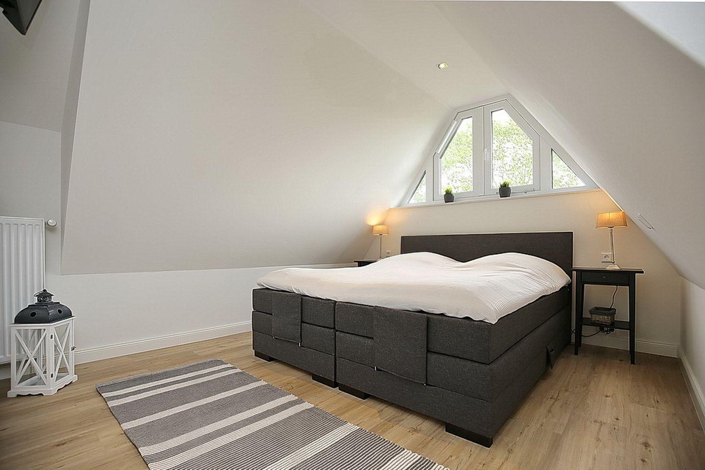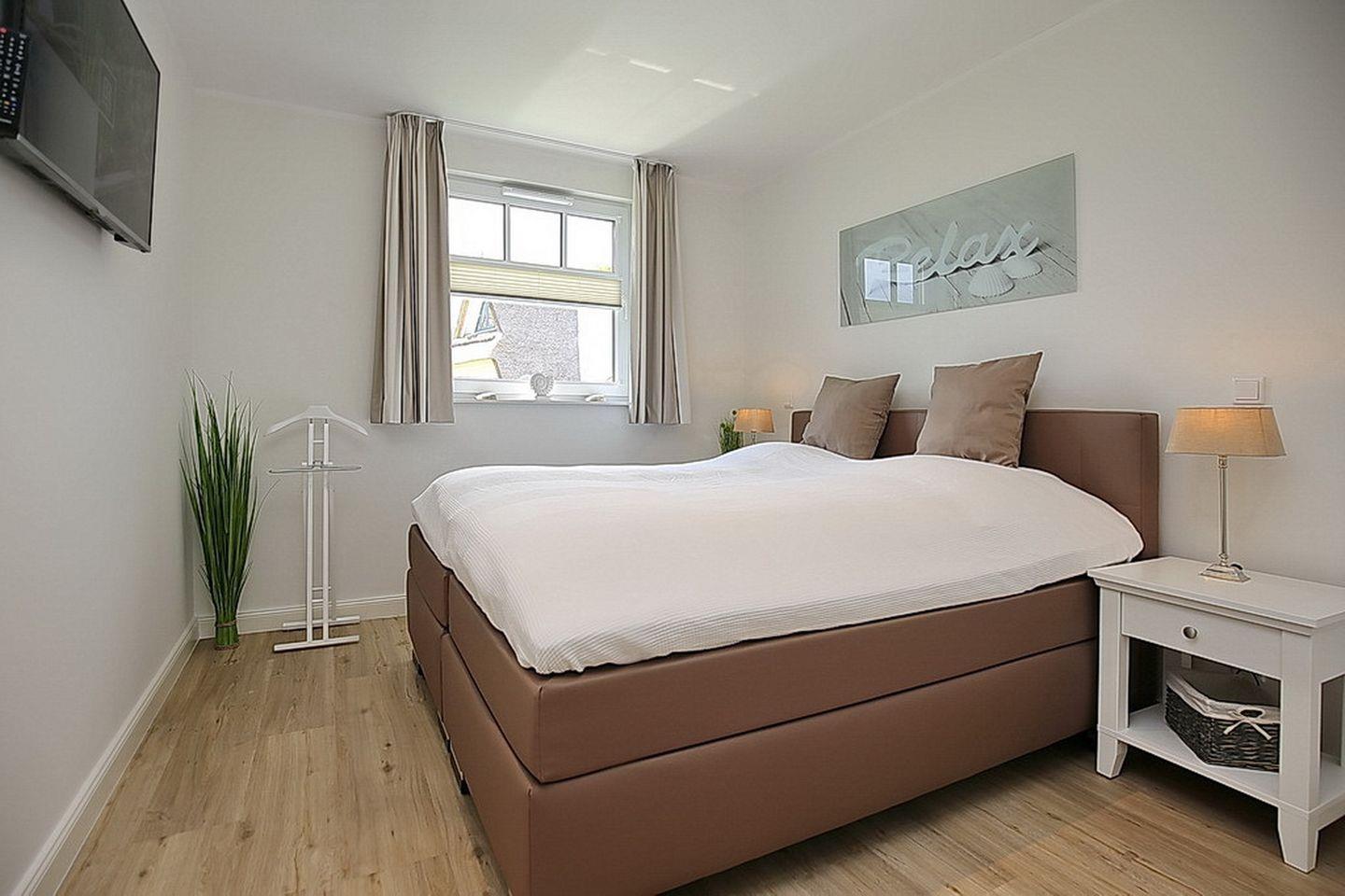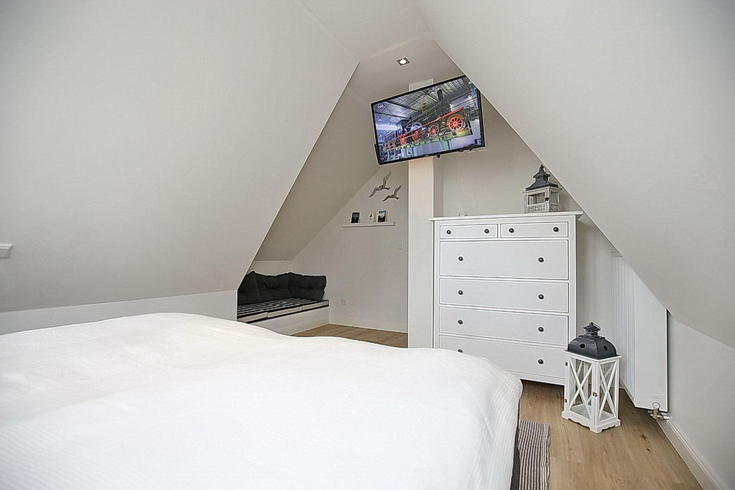 Im Spitzboden befindet sich ein drittes Schlafzimmer mit einem Boxspringbett ( 2 x 90 x 200 cm) und einem Fernseher.