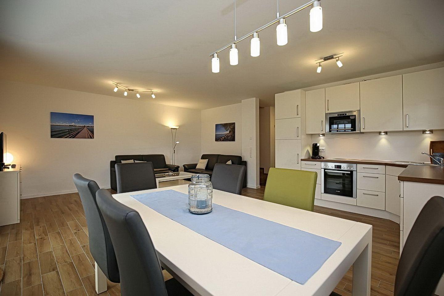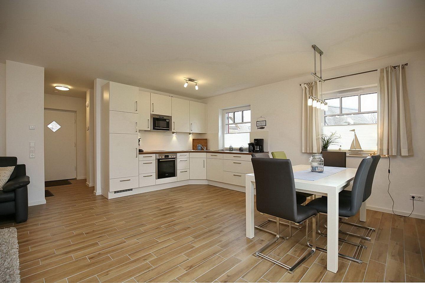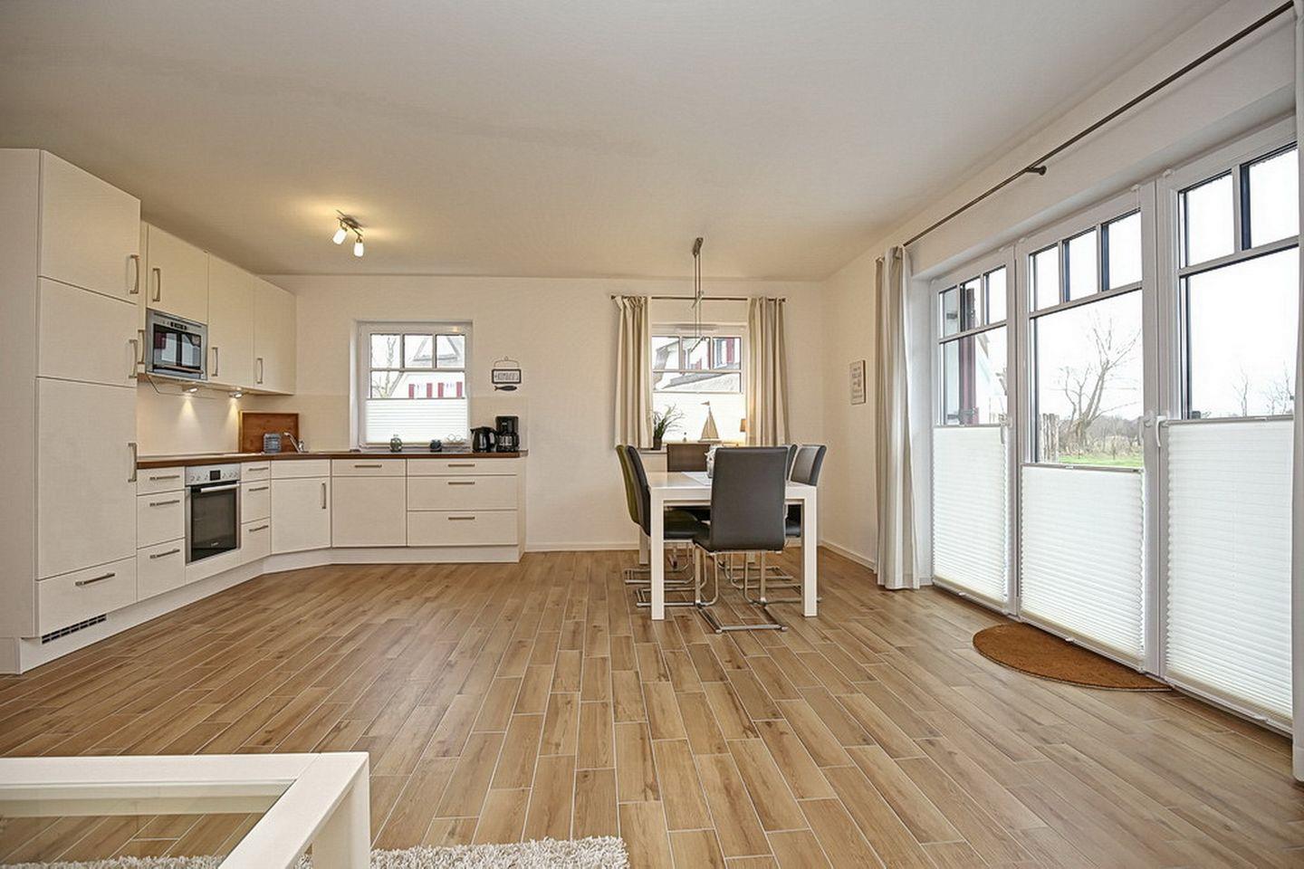 Im Erdgeschoss des Ferienhauses befinden sich der großzügige Wohnraum mit gemütlicher Essgruppe, sowie die integrierte Küchenzeile. In der modernen Küchenzeile findest du Geschirrspüler, Mikrowelle, Ceranherd mit Backofen, Kühlschrank mit Gefrierfach vor.