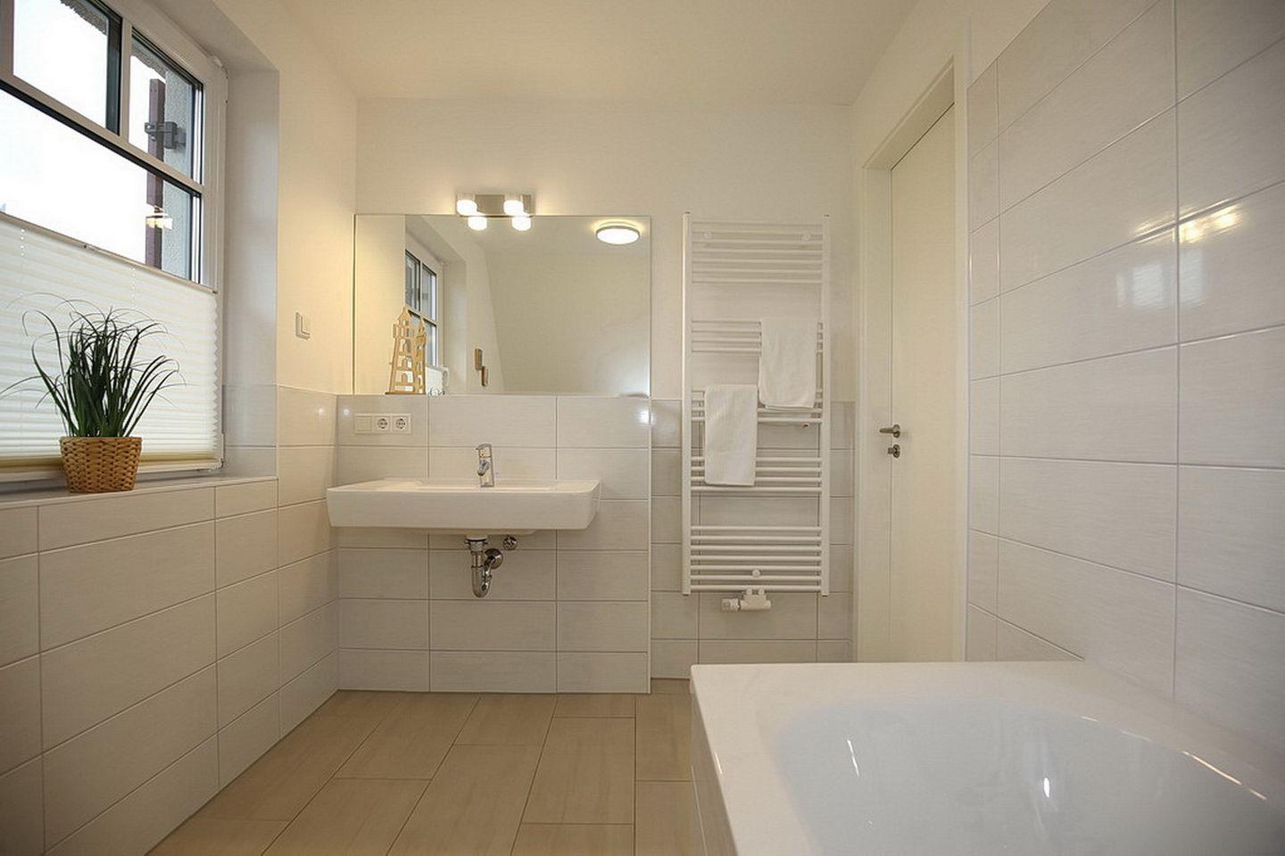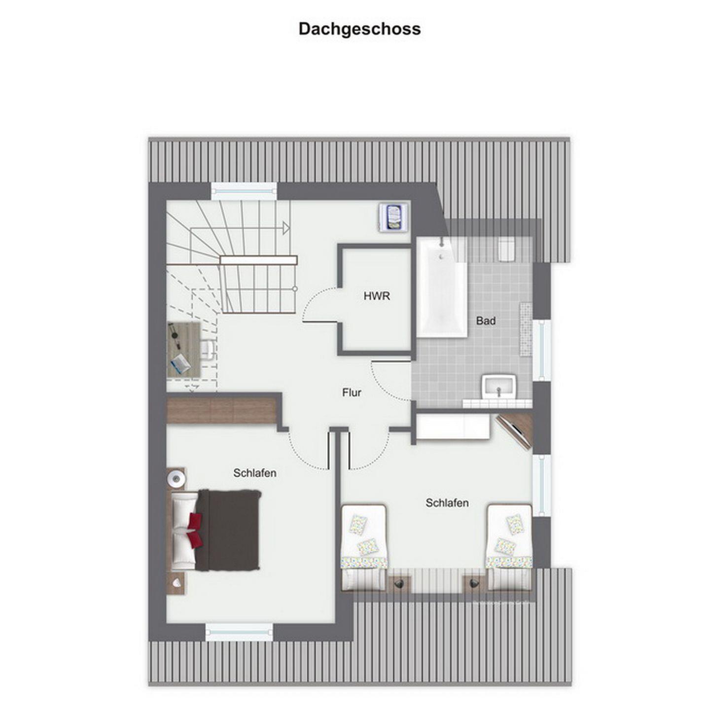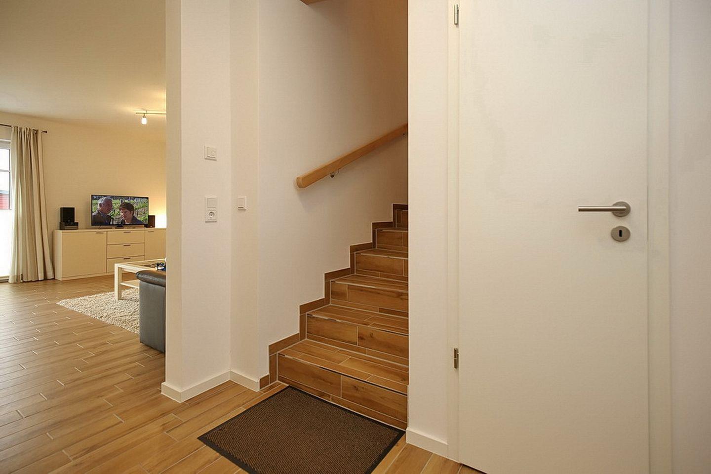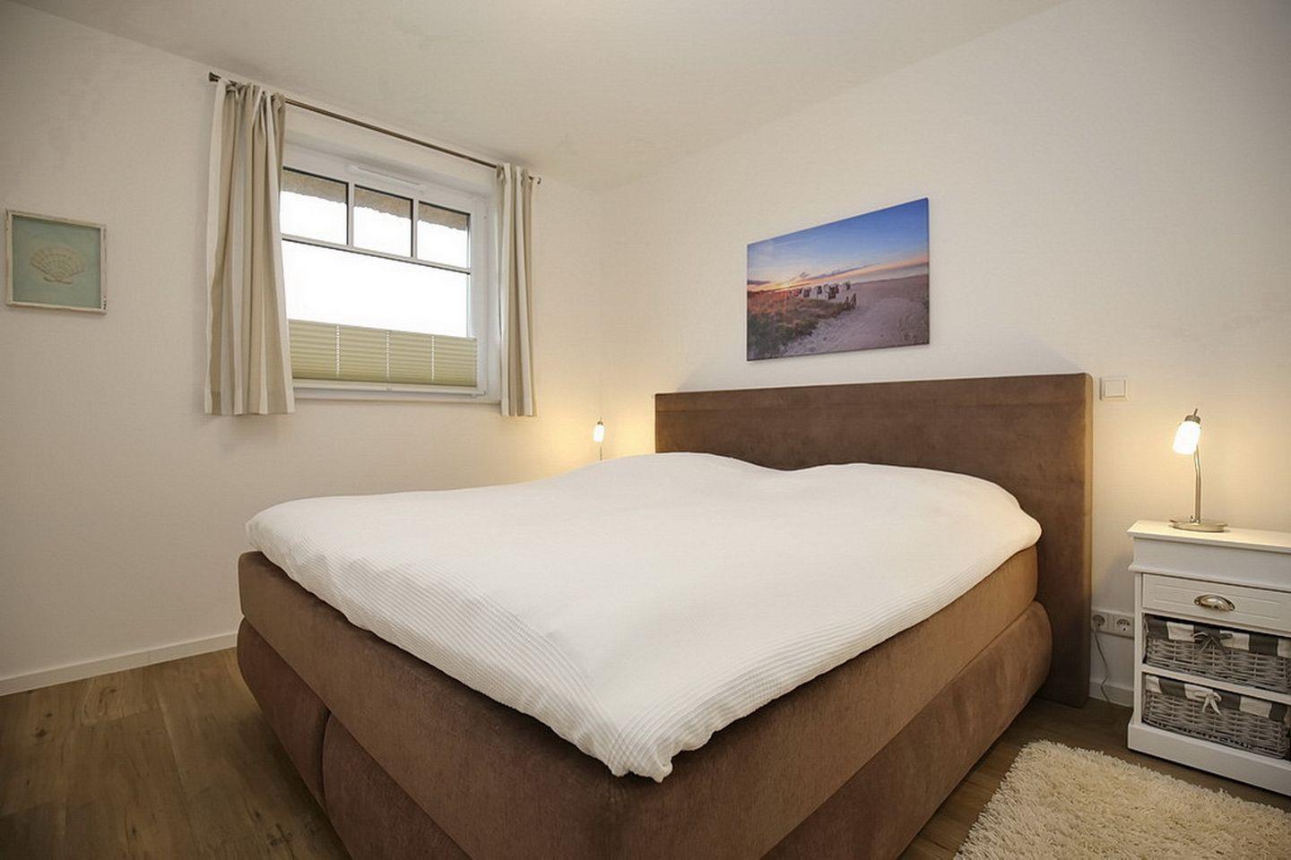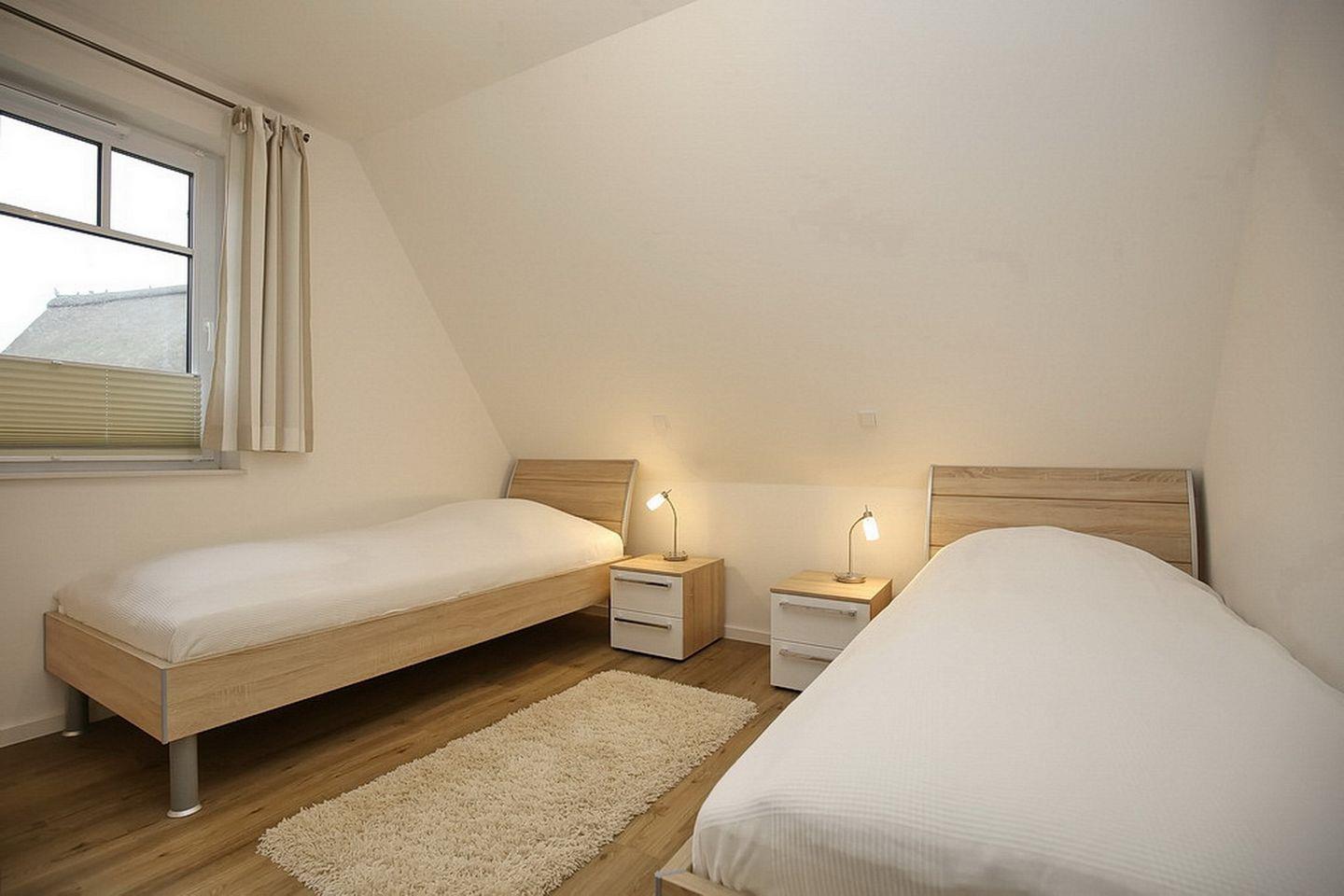 In den zwei Schlafzimmern im Obergeschoss stehen dir ein Boxspringbett mit durchgehender Matratze (180 x 200 cm), zwei Einzelbetten (90 x 200 cm) und Schränke mit ausreichend Platz für deine Urlaubsgarderobe zur Verfügung. Außerdem zu deiner Unterhaltung ein Fernseher. Des Weiteren verfügt das Obergeschoss über ein Bad mit Badewanne und Waschbecken und WC.