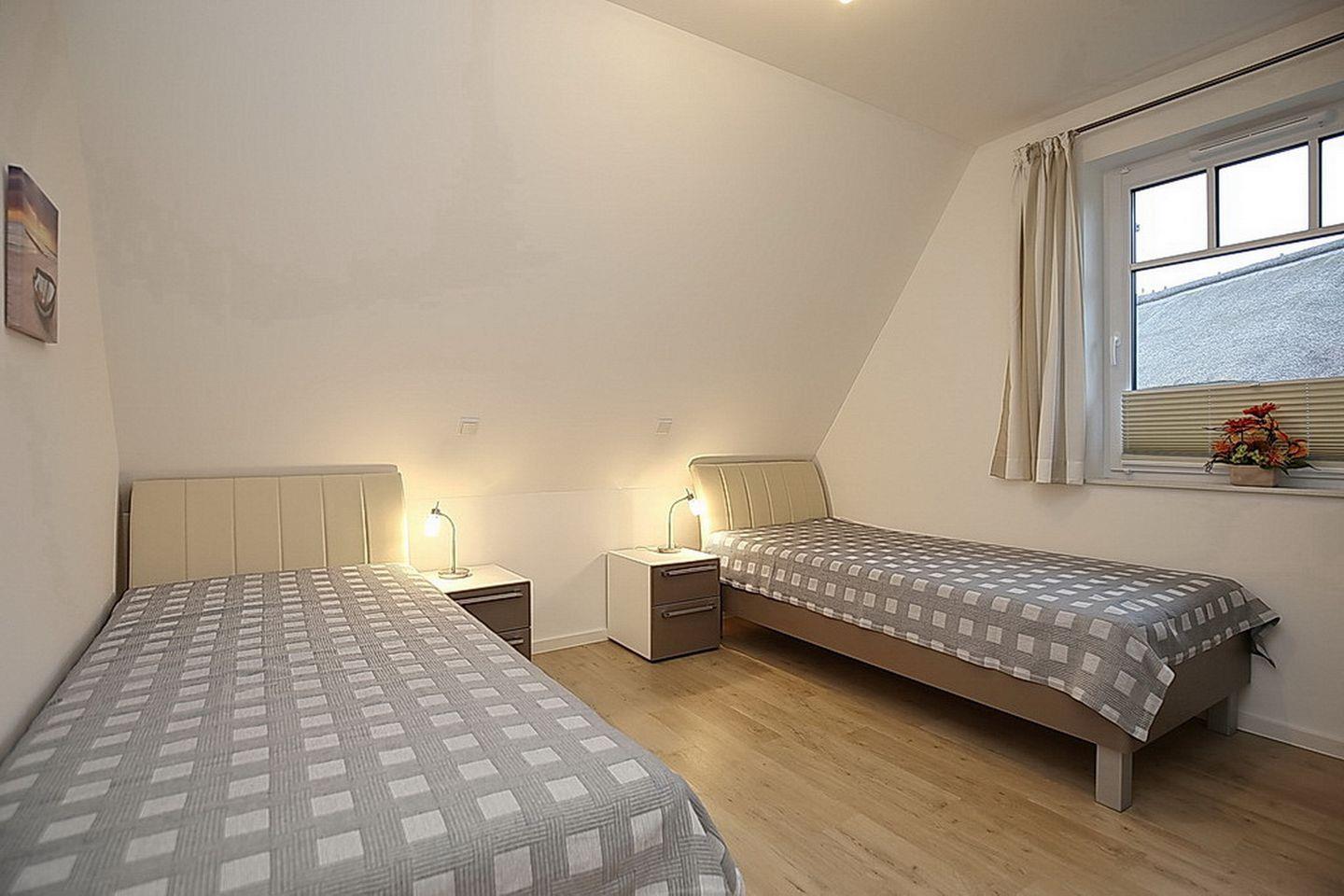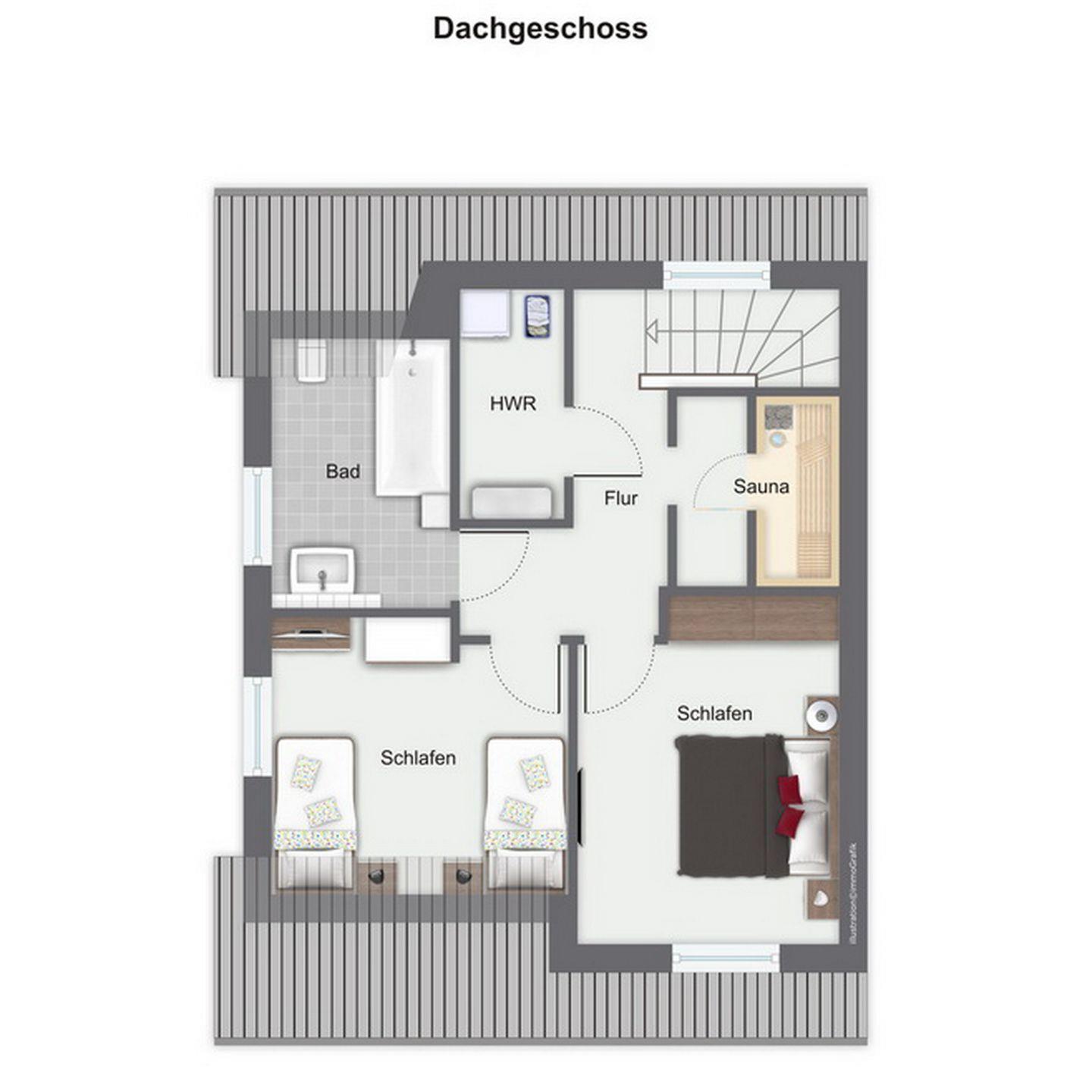 Im Obergeschoss bewohnst du zwei Schlafzimmer mit einem Doppelbett (2 x 90 x 200 cm) und zwei Einzelbetten (90 x 200 cm). Beide Schlafzimmer verfügen über eine Verdunkelungsmöglichkeit. Ein Badezimmer mit Badewanne lädt zusätzlich zum Entspannen ein. In dieser Nichtraucherwohnung sind keine Haustiere erlaubt. Ein Kinderhochstuhl sowie eine Waschmaschine sind inklusive. Die Besonderheiten in dem Ferienhaus sind die kleine Infrarotsauna, die vorhandenen Bücher und DVDs sowie eine Auswahl an Spielen. Ein WLAN-Anschluss (ohne Gewähr) ist vorhanden.