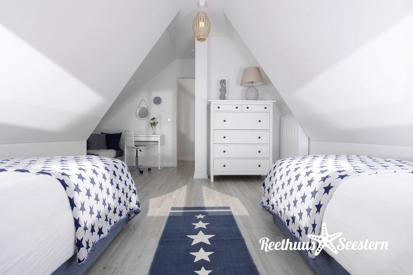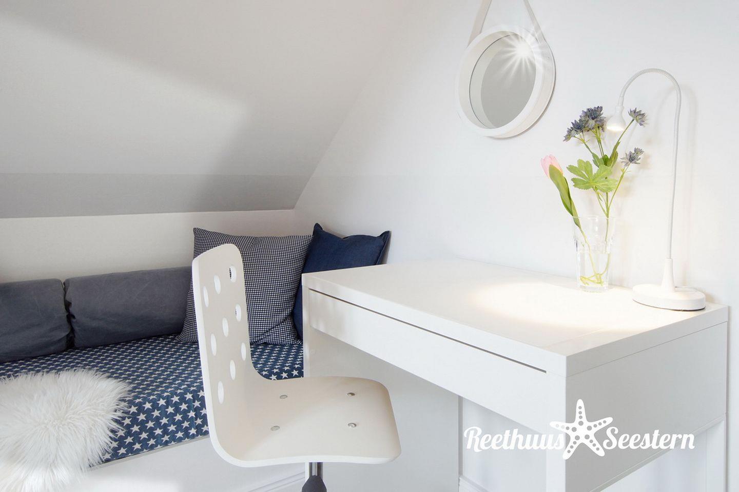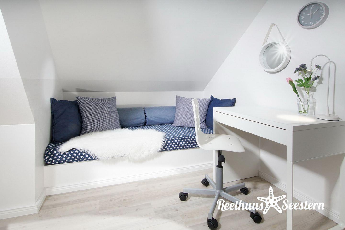 Im ersten Obergeschoss befinden sich zwei Schlafzimmer. Im ersten Schlafzimmer steht ein Boxspringbett (1 x 180 x 200 cm), im zweiten zwei Einzelboxspringbetten (100 x 200 cm). Eine gemütliche Schreibtischecke für eure Urlaubspost befindet sich ebenfalls im Obergeschoss. Dieser Arbeitsplatz ist mit einem Computermonitor ausgestattet (DVI-Anschluss und USB-Station). Auch eine Waschmaschine und ein Trockner stehen im 1.OG bereit. Im Dachgeschoss des Hauses findet ihr das dritte Schlafzimmer im Spitzboden mit zwei Einzelbetten (80 x 200 cm), Schreibtisch und einer gemütlichen Sofa-Nische vor.