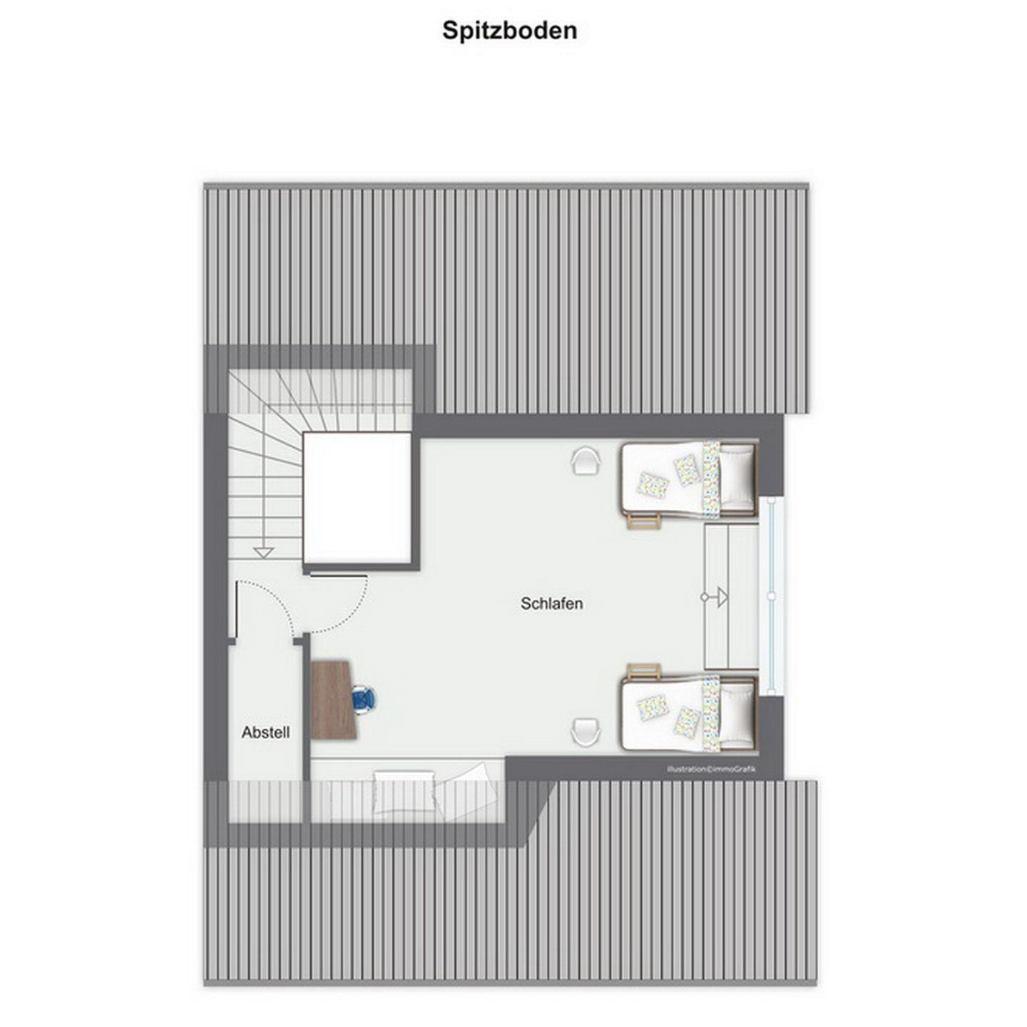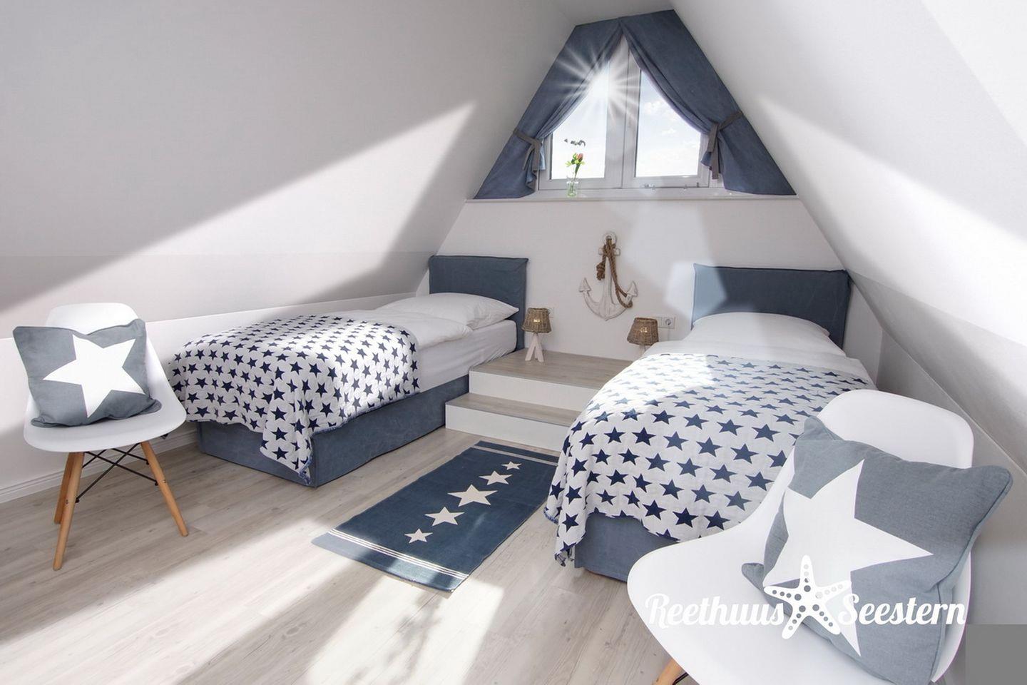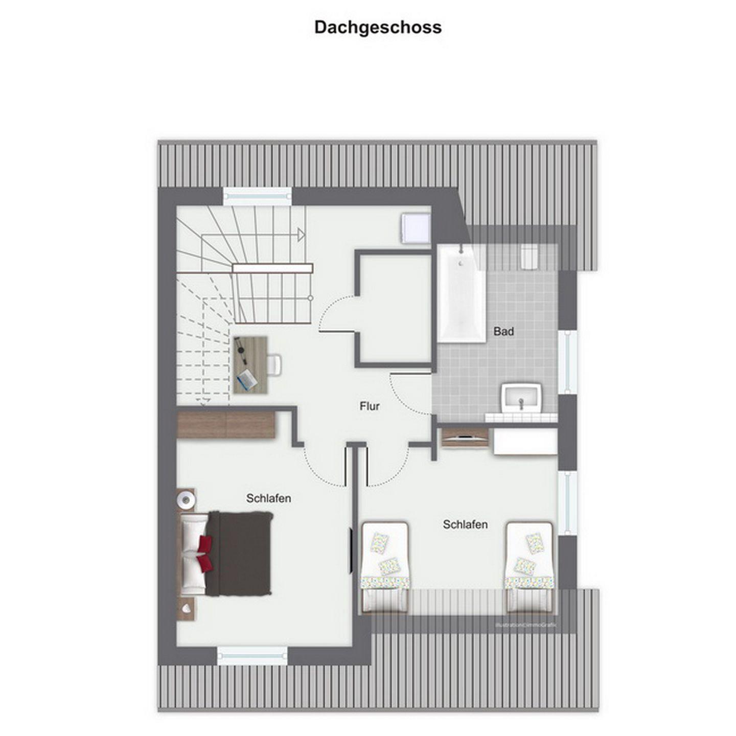 Im ersten Obergeschoss befinden sich zwei Schlafzimmer. Im ersten Schlafzimmer steht ein Boxspringbett (1 x 180 x 200 cm), im zweiten zwei Einzelboxspringbetten (100 x 200 cm). Eine gemütliche Schreibtischecke für eure Urlaubspost befindet sich ebenfalls im Obergeschoss. Dieser Arbeitsplatz ist mit einem Computermonitor ausgestattet (DVI-Anschluss und USB-Station). Auch eine Waschmaschine und ein Trockner stehen im 1.OG bereit. Im Dachgeschoss des Hauses findet ihr das dritte Schlafzimmer im Spitzboden mit zwei Einzelbetten (80 x 200 cm), Schreibtisch und einer gemütlichen Sofa-Nische vor.