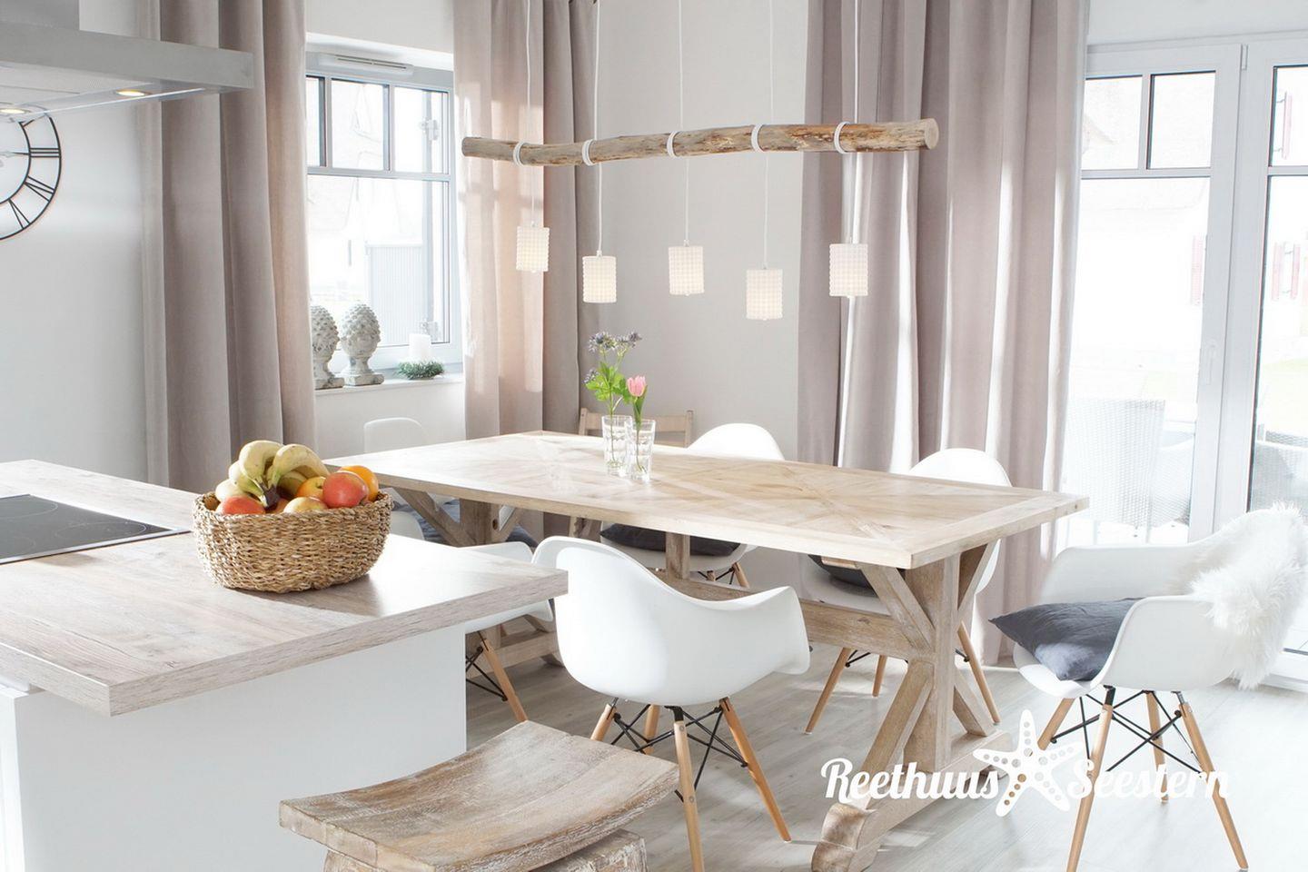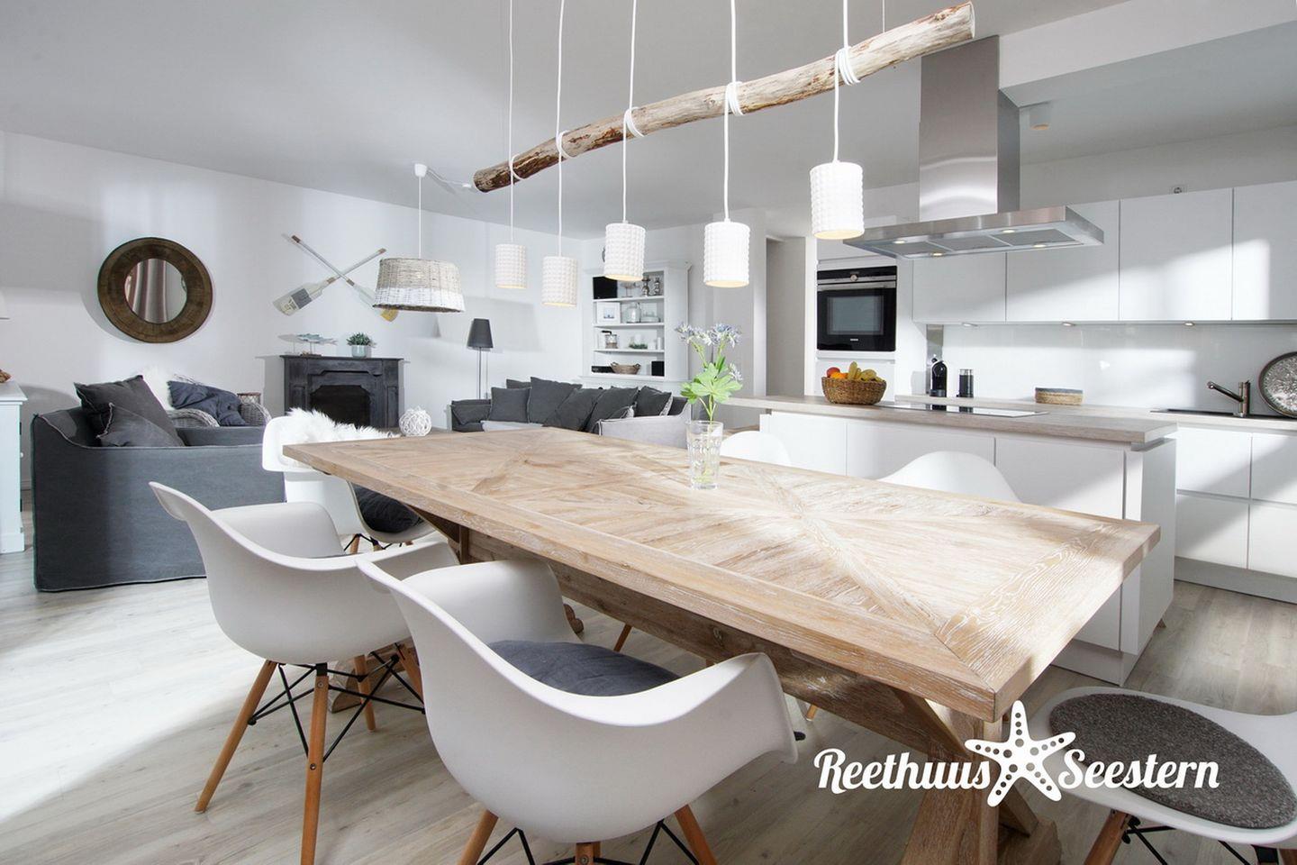 Im Erdgeschoss des Ferienhauses befinden sich im Wohnraum der gemütliche Essbereich und die Küche mit Kücheninsel. Modern und hervorragend ausgestattet, bietet euch diese Küche mit 4- Platten- Ceranfeld und Backofen (Mikrowelle integriert), Geschirrspüler, Kühlschrank mit Gefrierfach und die Wahl zwischen Kaffeemaschine oder „Nespresso"-Maschine viele Möglichkeiten, um mit viel Komfort eure Mahlzeiten zuzubereiten. Sogar Küchenzubehör wie Orangenpresse, Pürierstab oder Messerblock sind hier zu finden.
