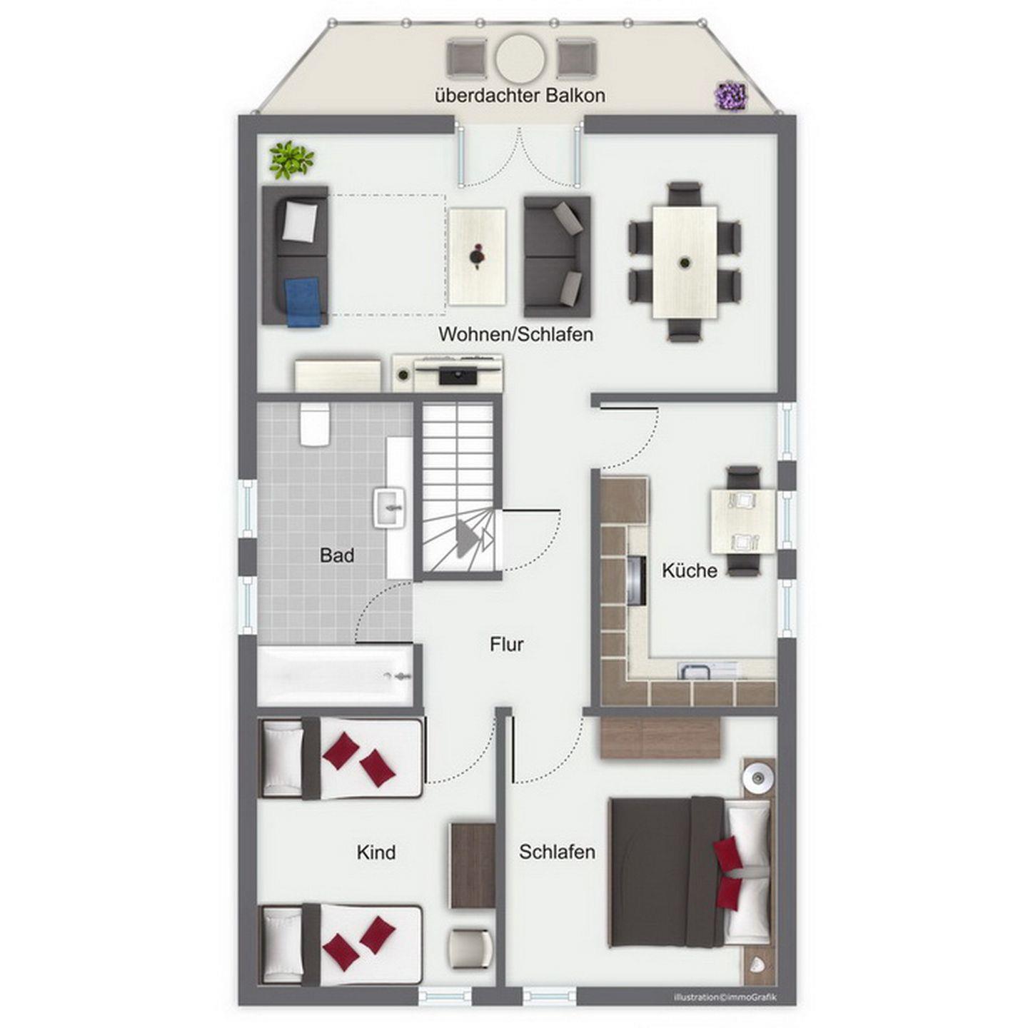 Deine 3-Zimmer-Ferienwohnung liegt im 1. Obergeschoss des Reetdachhauses. Auf ca. 64 m² stehen dir ein Wohnraum mit Essbereich, eine Küche, zwei Schlafzimmer, ein Vollbad sowie ein Balkon zur Verfügung.