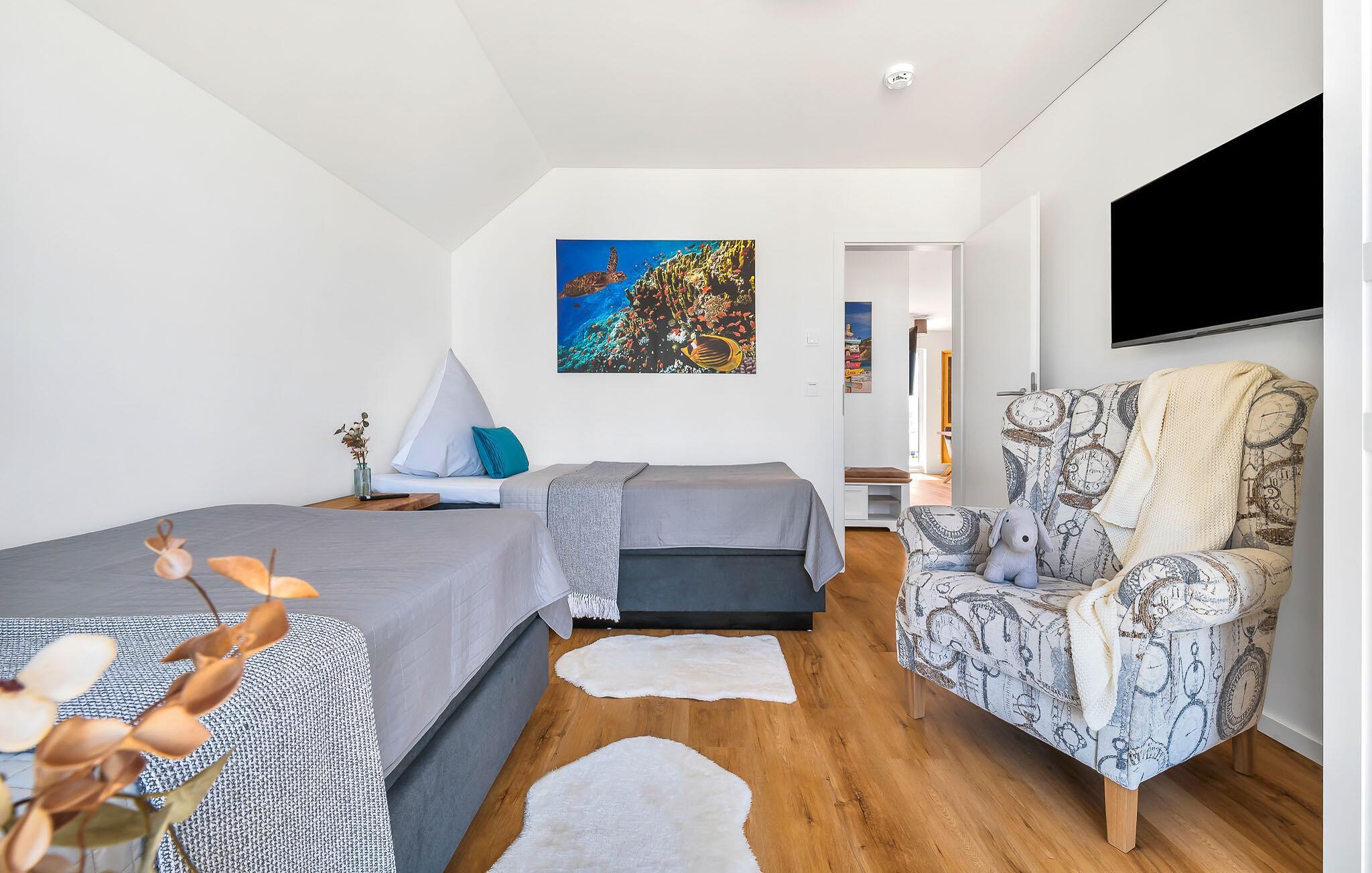 Denne drømmende ferielejlighed i feriestedet Olpenitz ved Østersøen med sine lyse møbler danner den perfekte kulisse for uforglemmelige ferieoplevelser. BONAIRE er opkaldt efter den caribiske ø og tilbyder jer en uforlignelig kombination af afslappet ø-atmosfære og Østersøens skønhed. Lejlighedens store stue/spisestue er indrettet med en komfortabel sofa og lænestole og et smart-tv. Dette har Netflix og RTL+ konti, som I kan bruge gratis. Her kan I slappe af efter en begivenhedsrig dag eller tilbringe en hyggelig aften med jeres kære. BONAIRE er udstyret med højhastighedsinternet. Og når fjernsynet er slukket, kan I gøre jer godt tilpas foran pejsen. Det fuldt udstyrede køkken med vaskemaskine har alt hvad I behøver for at tilberede lækre måltider, mens I nyder udsigten over det omkringliggende område. I BONAIRE er der to hyggelige soveværelser, det ene med en komfortabel boxspring dobbeltseng og et andet med to komfortable boxspring enkeltsenge og et fjernsyn. Møblerne af høj kvalitet tilbyder nok opbevaringsplads til jeres bagage. Bruserummet har et brusebad i gulvniveau og en infrarød sauna (varmekabine), hvor I kan slappe dejligt af. Balkonen i ferielejligheden er et rigtigt tilflugtssted, hvor I kan slappe af og slappe af og nyde den friske havluft eller nyde en lækker grill. Børn og hunde er velkomne. BONAIRE ligger i umiddelbar nærhed af Weidefelder Strand. I kan gå her på blot et par minutter og opleve Østersøens skønhed tæt på. Lejligheden byder på en lys og venlig atmosfære, der er perfekt til at slappe af og nyde ferien i fulde drag. Vores favoritsted om aftenen er på altanen med en hyggelig grillaften med hele familien. Bemærk venligst, at OstseeResort Olpenitz stadig er under opførelse. På grund byggearbejdet af husene kan udendørsfaciliteterne og bygningstætheden ændre sig og afvige fra de viste billeder. Lejeprisen er allerede beregnet på baggrund af denne byggesituation, hvorfor yderligere rabatter ikke er muligt.